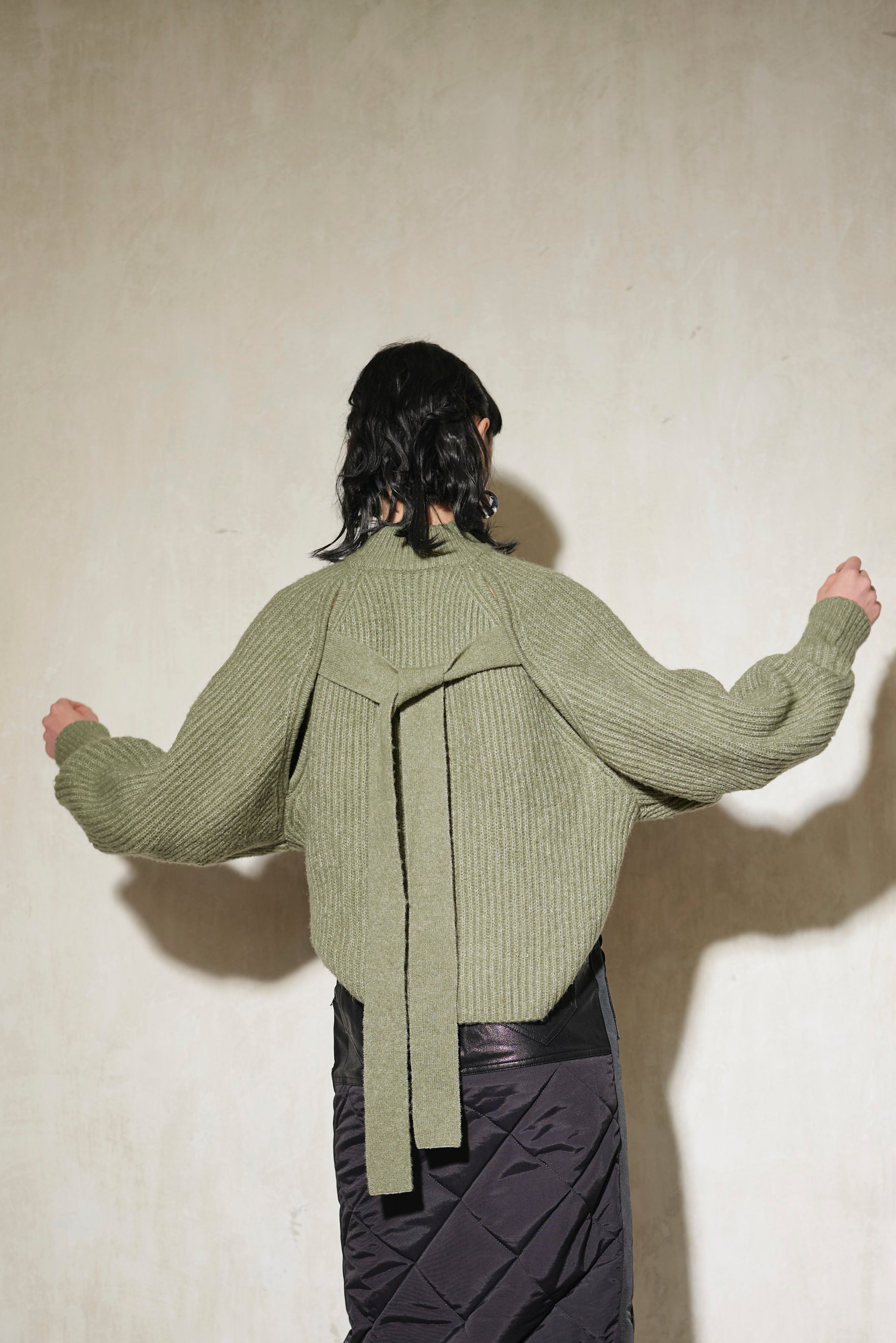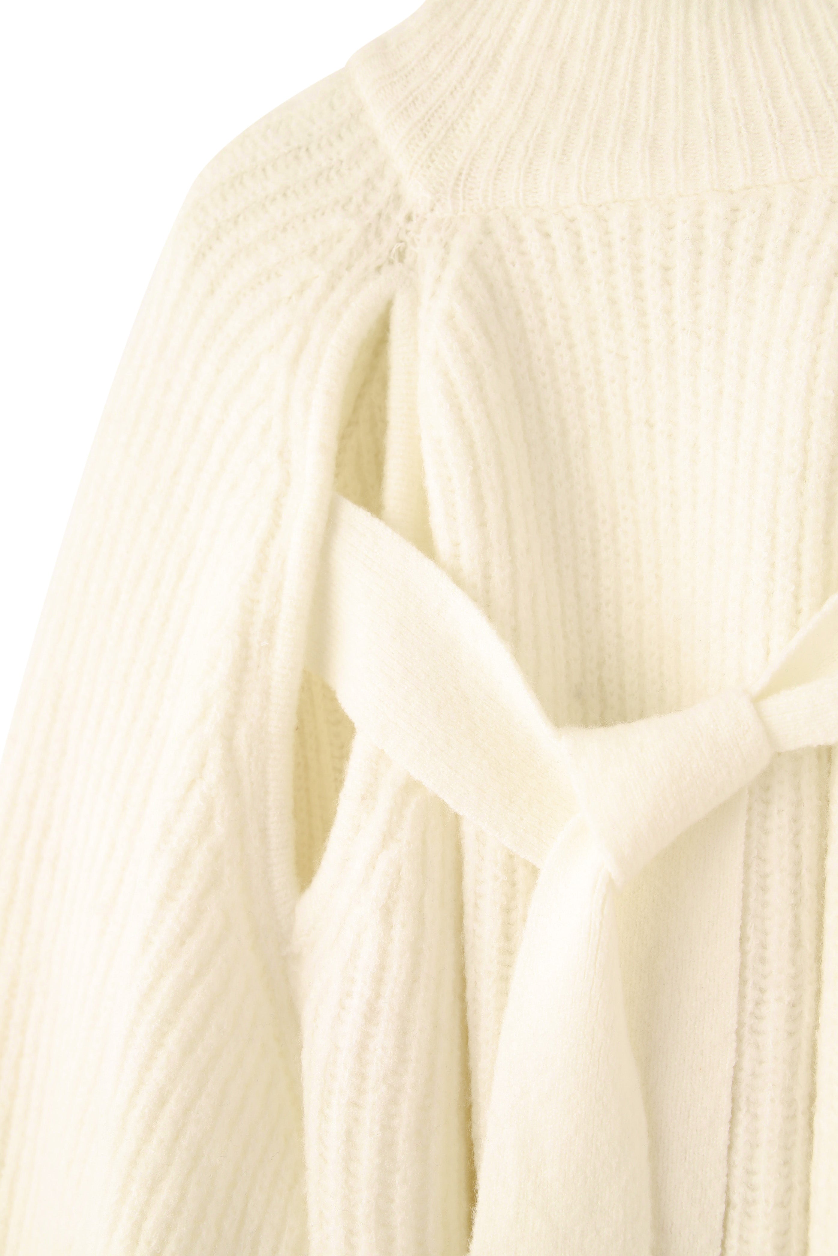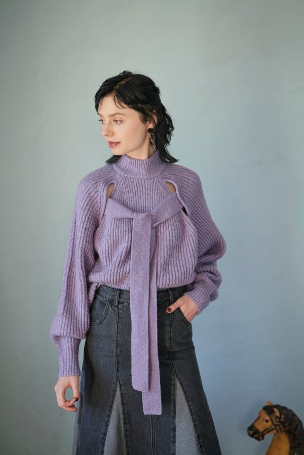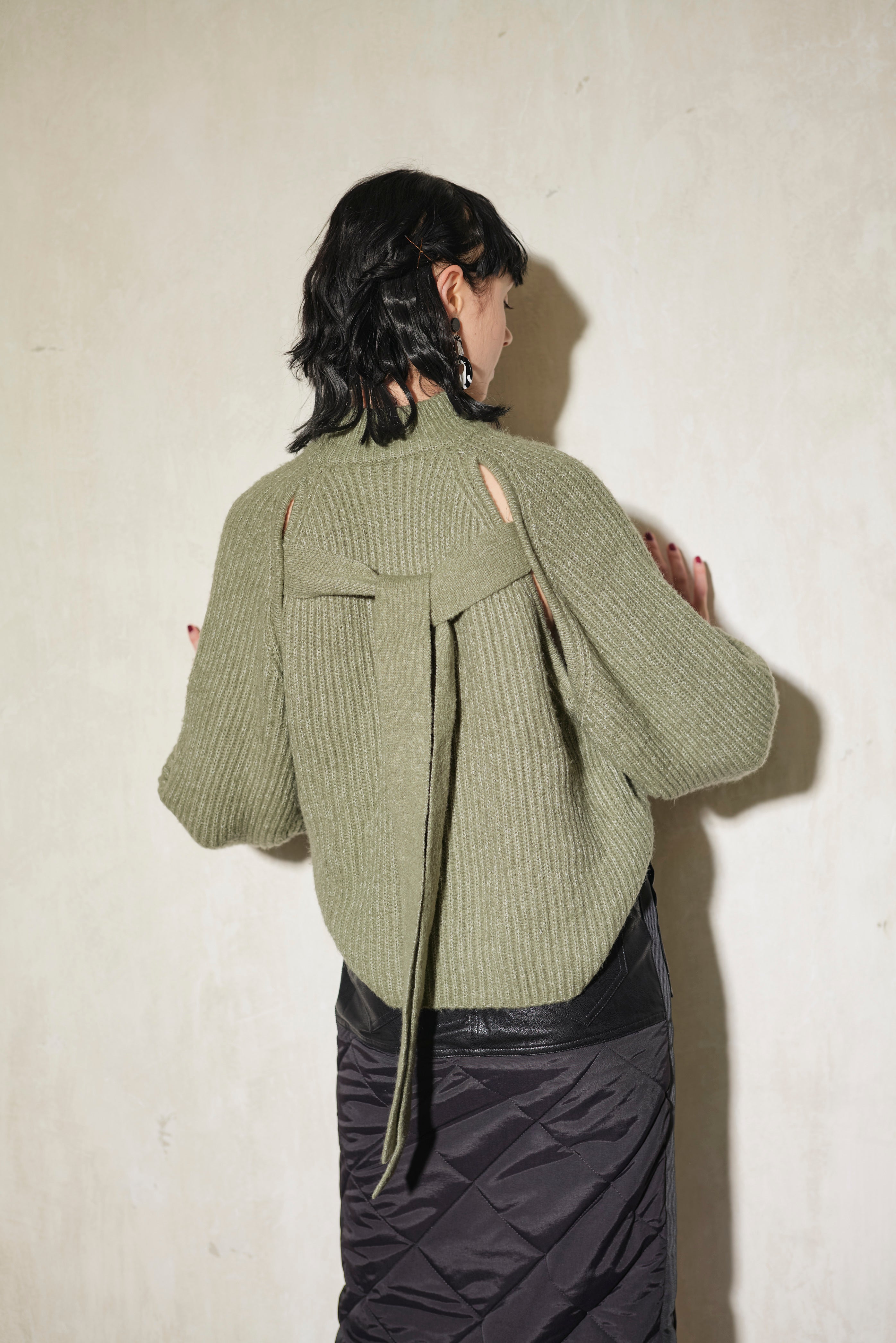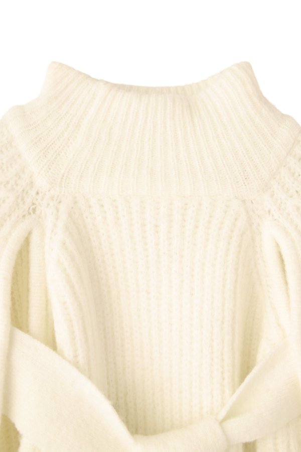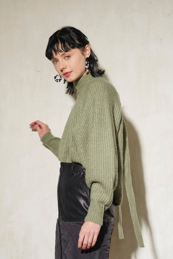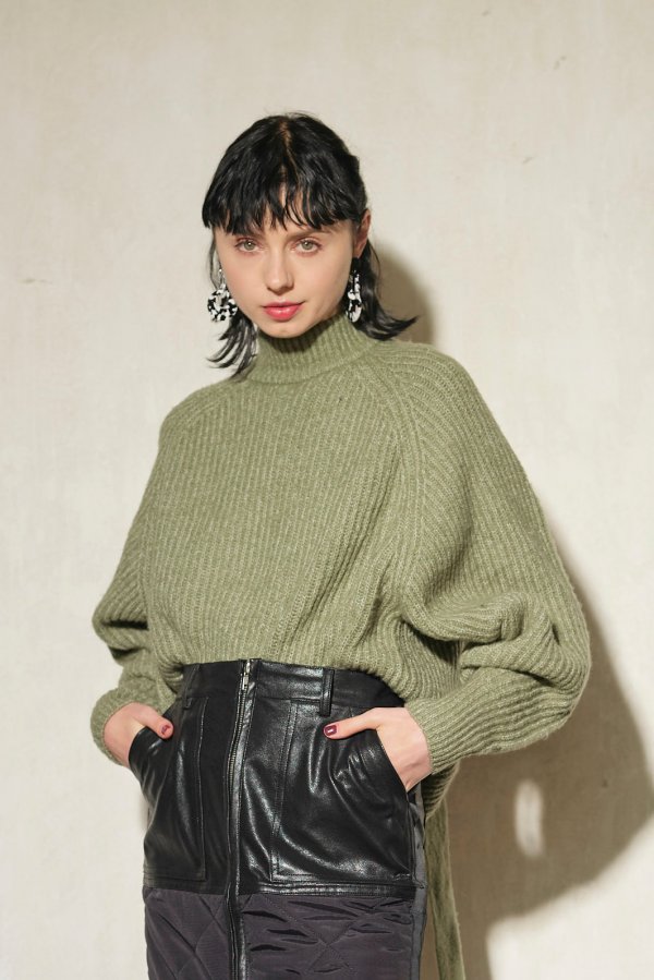 前後どちらでも着られる2way仕様のボリュームスリーブニット。