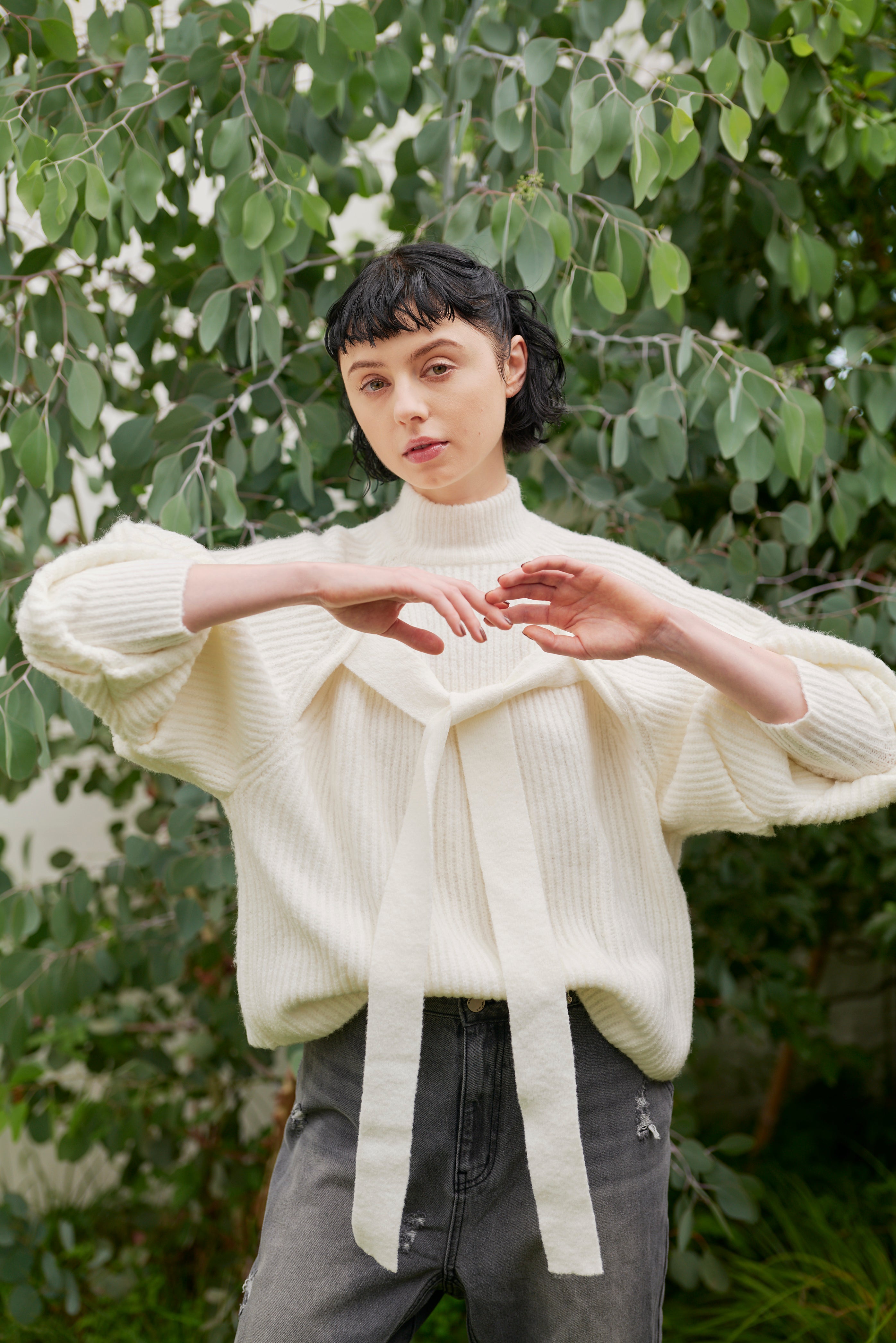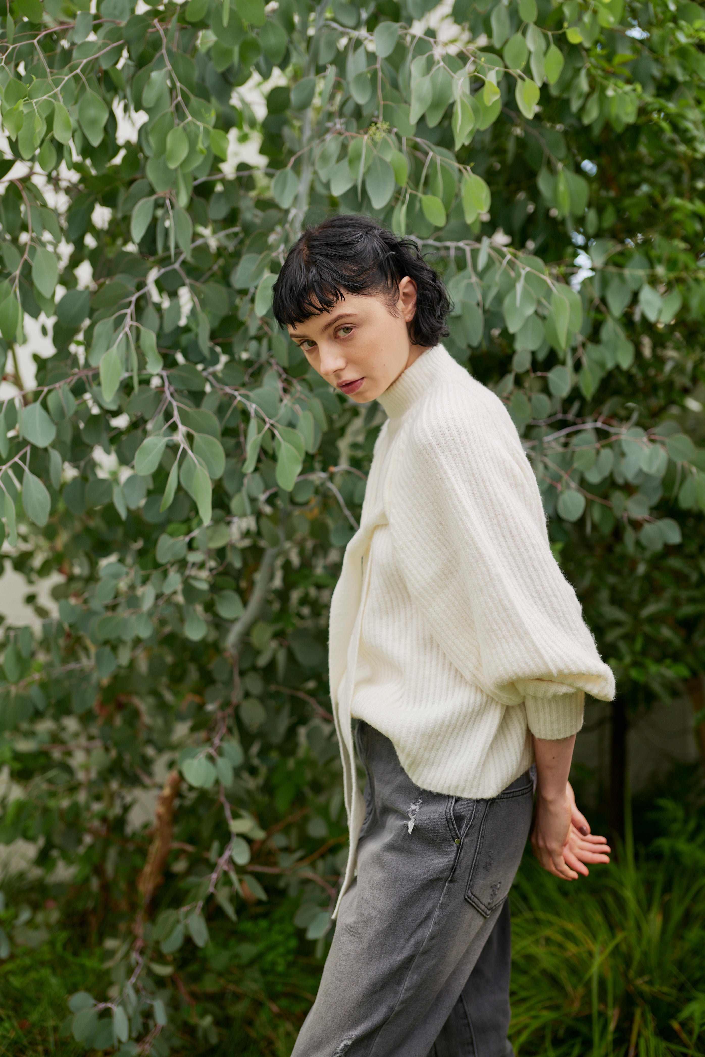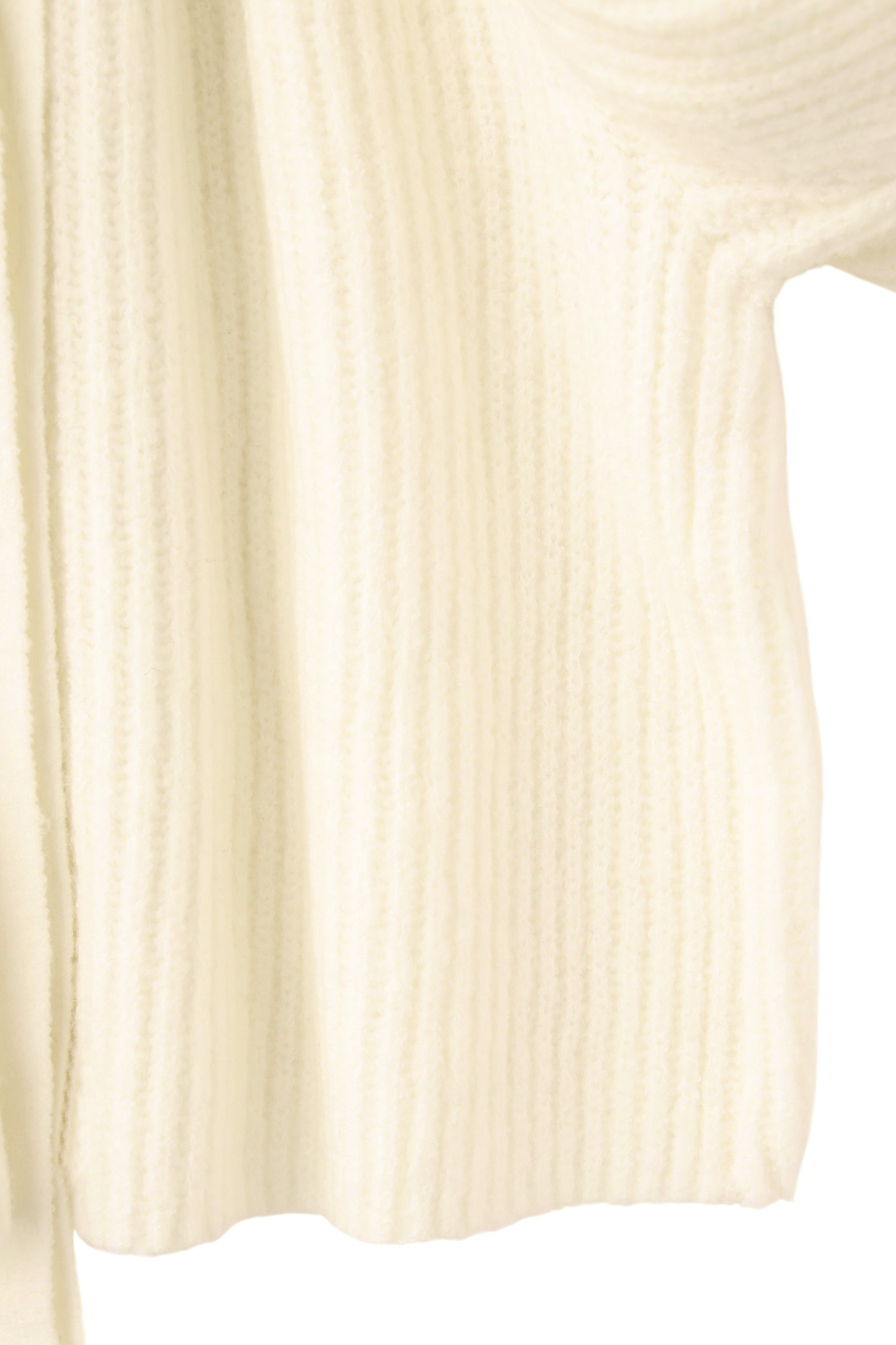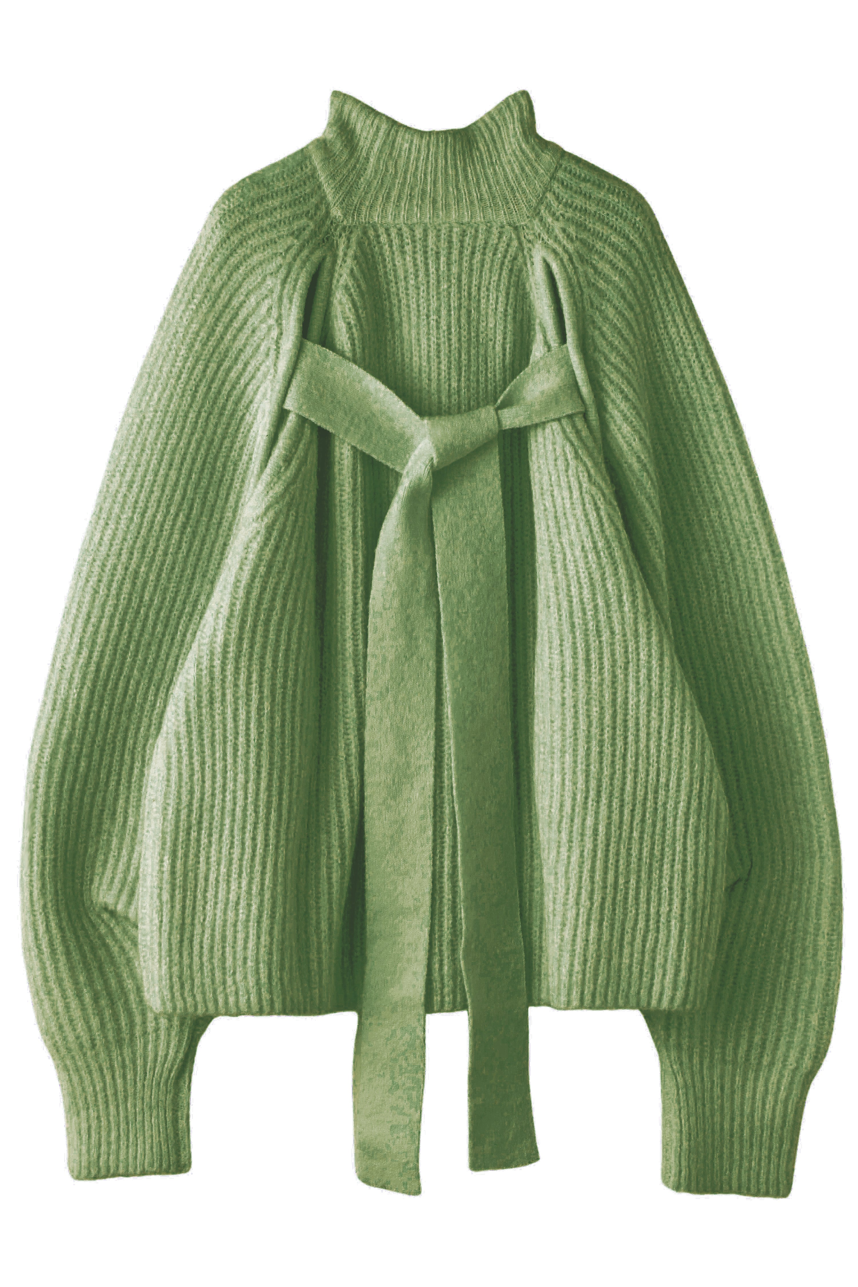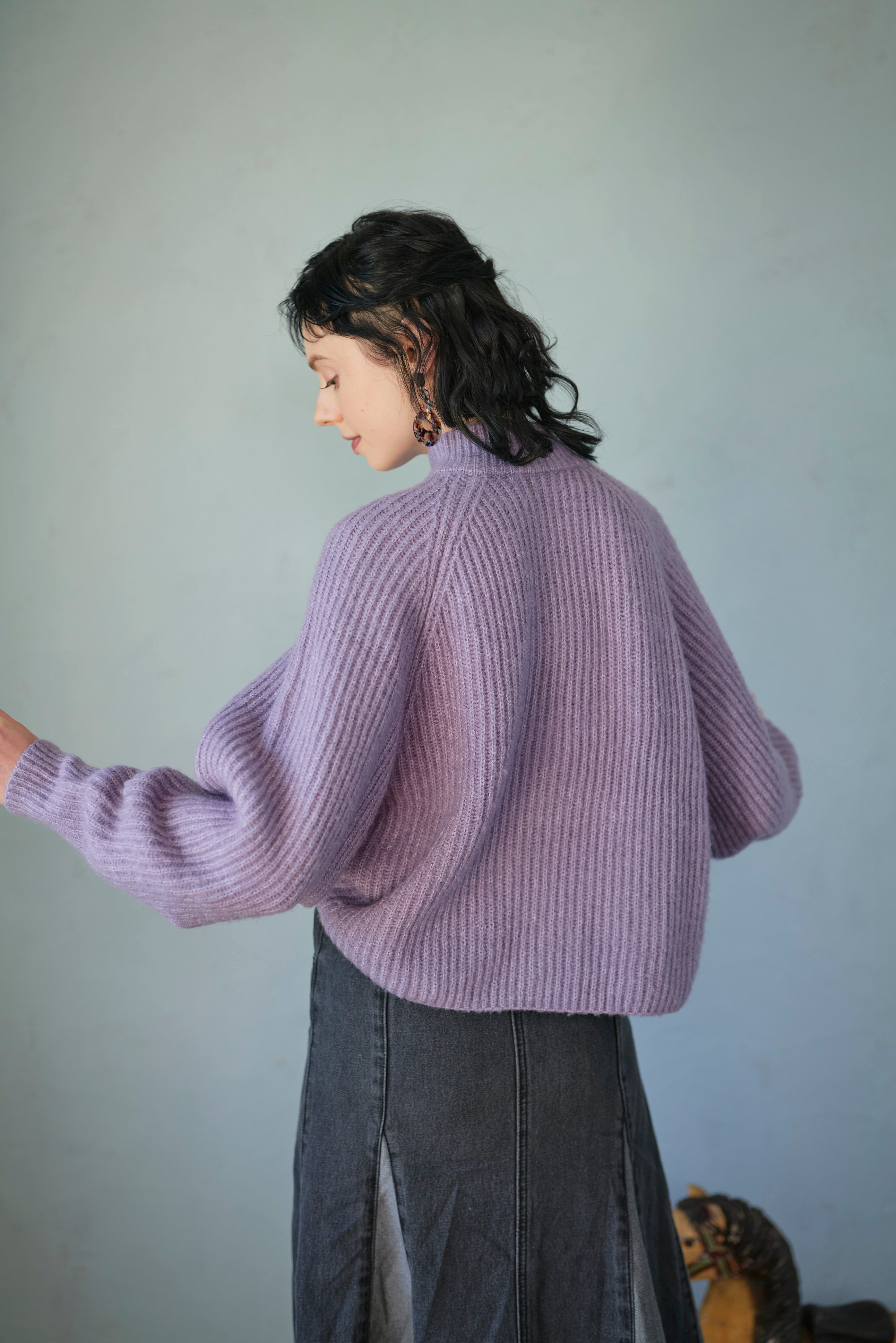 前後どちらでも着られる2way仕様のボリュームスリーブニット。