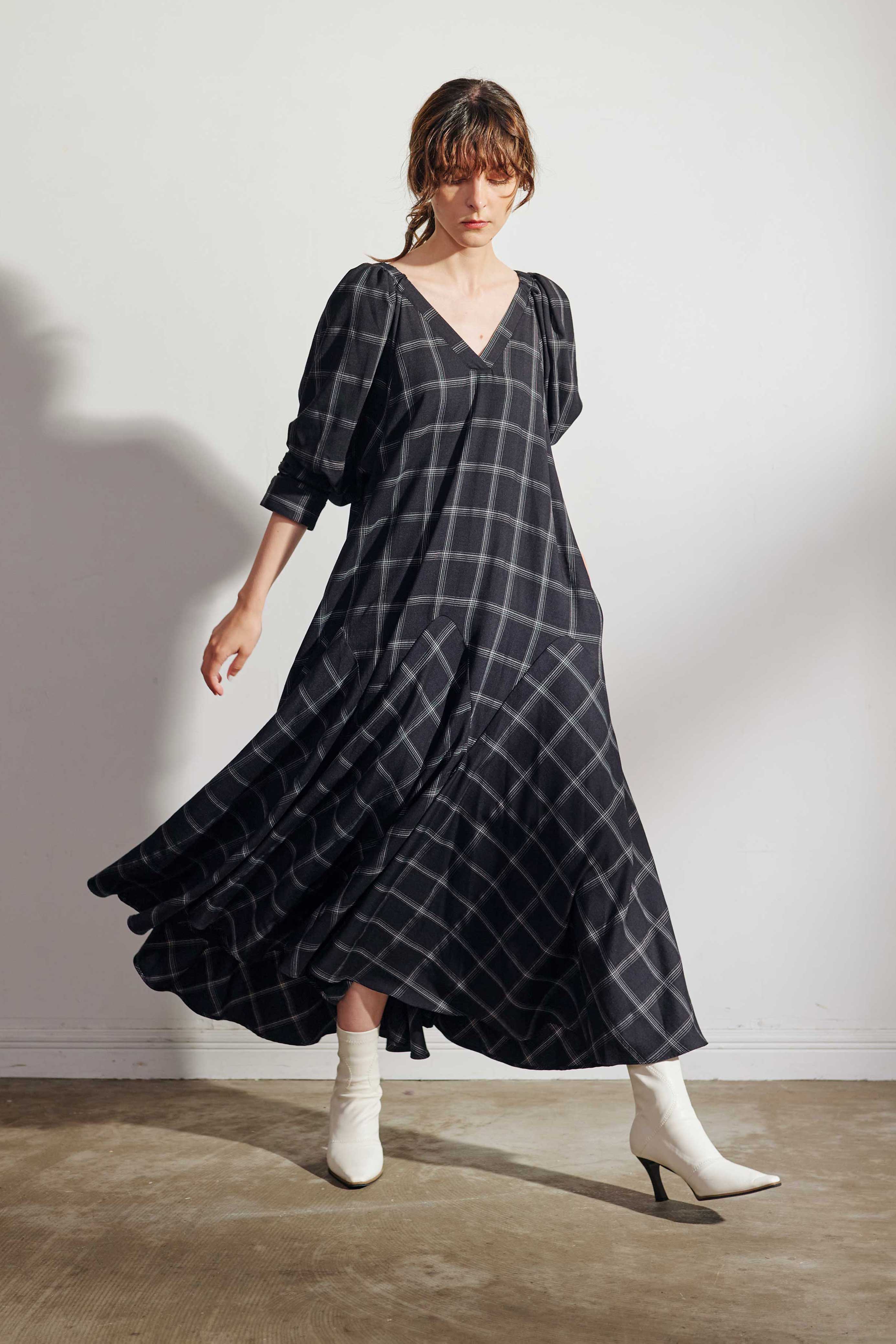 腰回りはフィットしつつも裾にたっぷりと分量感をもってくることで、上はストン、下はたっぷりフレアでスタイルアップがかないます。