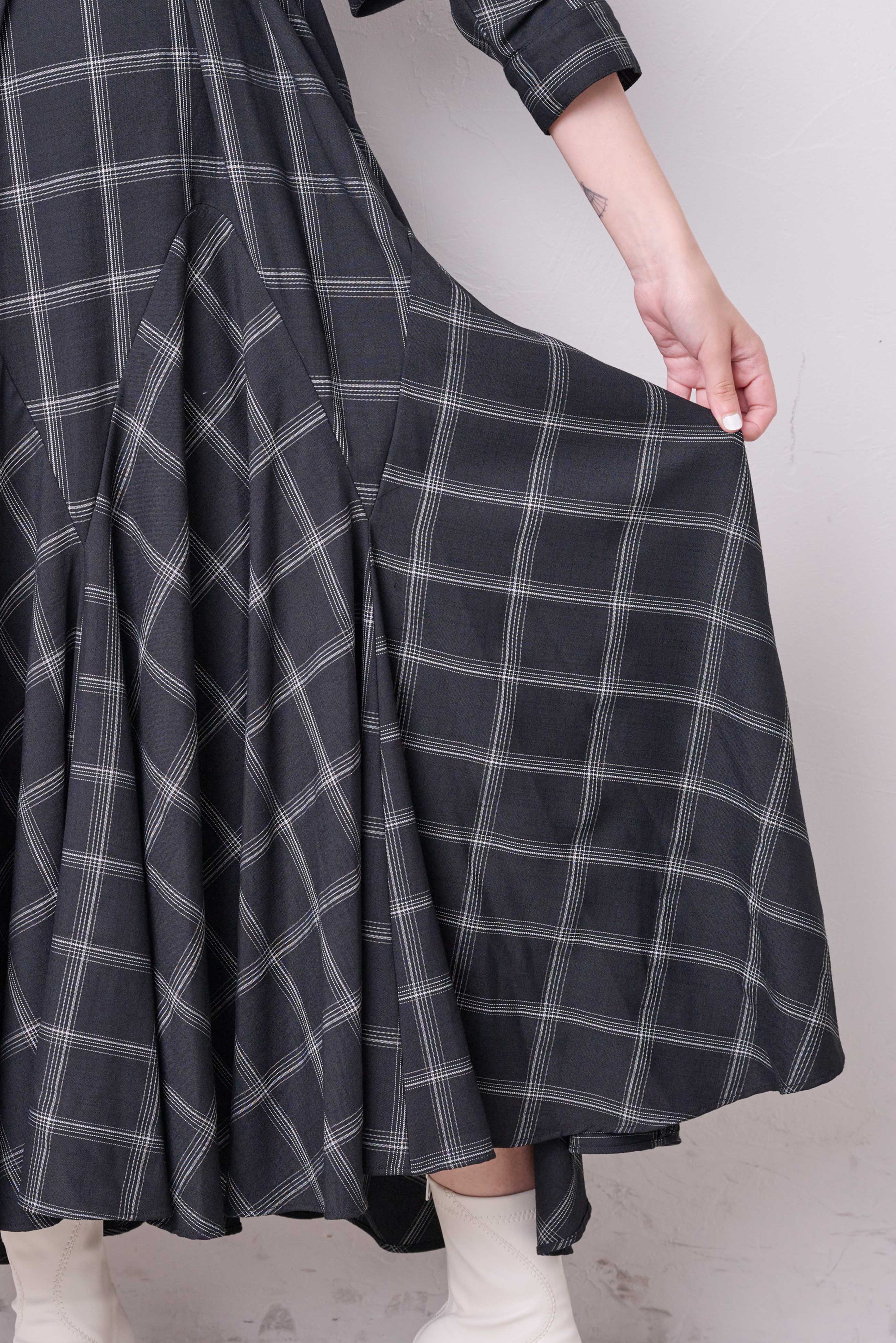 スカートの切り替えラインにもこだわり山状のカーブに切り替えた上、フレアパーツはバイヤスで裁断するという贅沢な仕様。