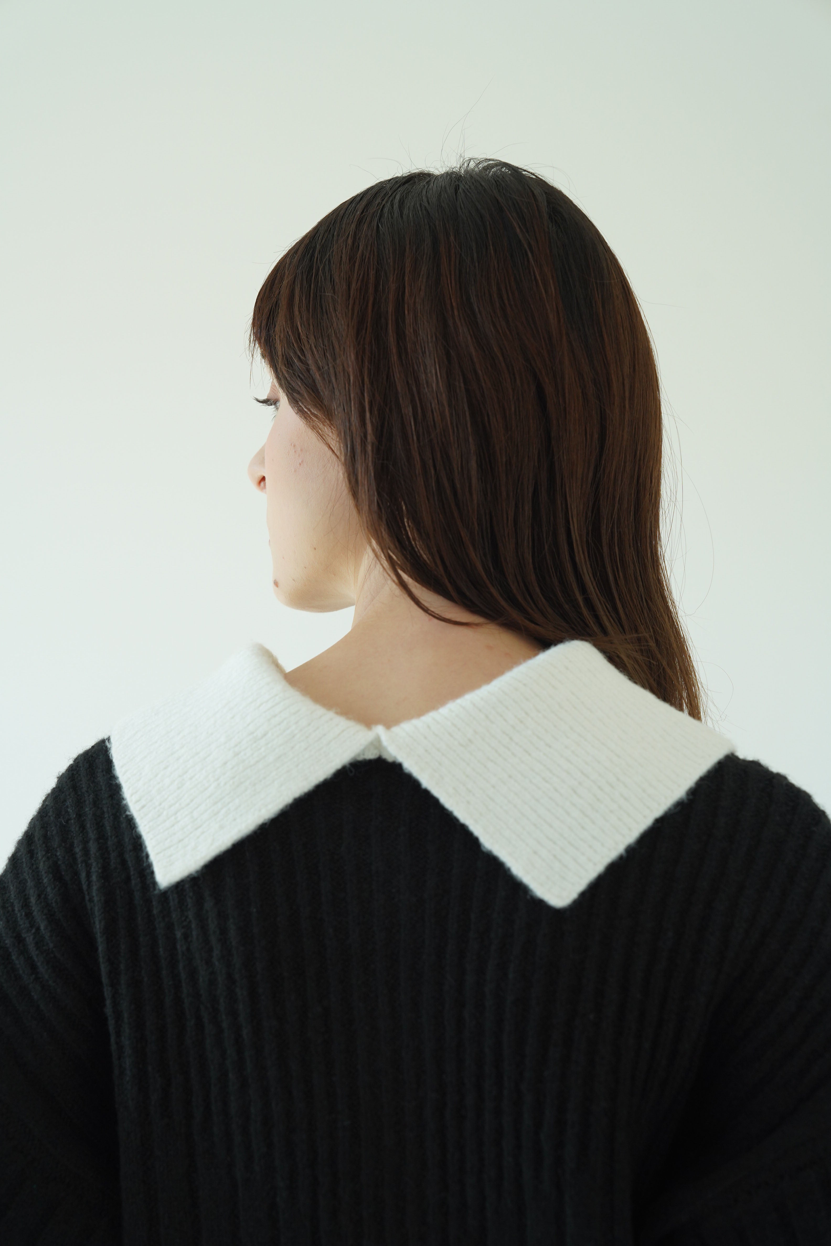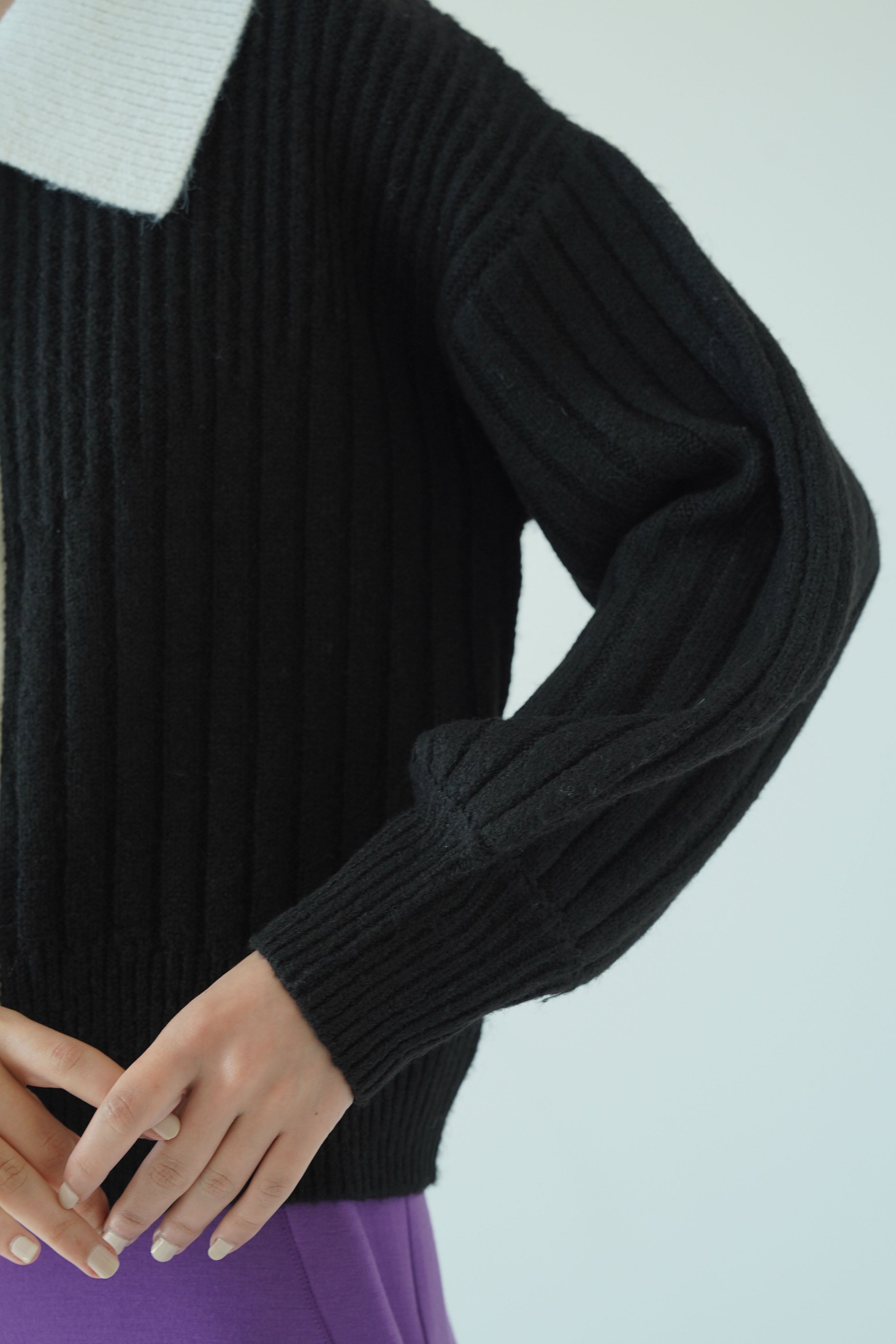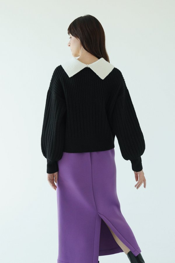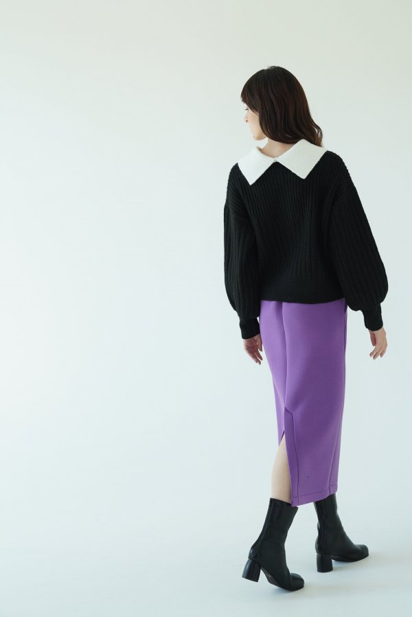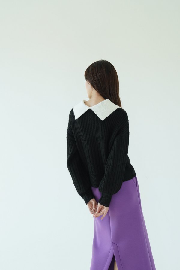 一見するとシンプルなリブニットですがリブの編み地がV字の切り替えから太さが変化しており、視覚効果ですっきり見えが叶います。