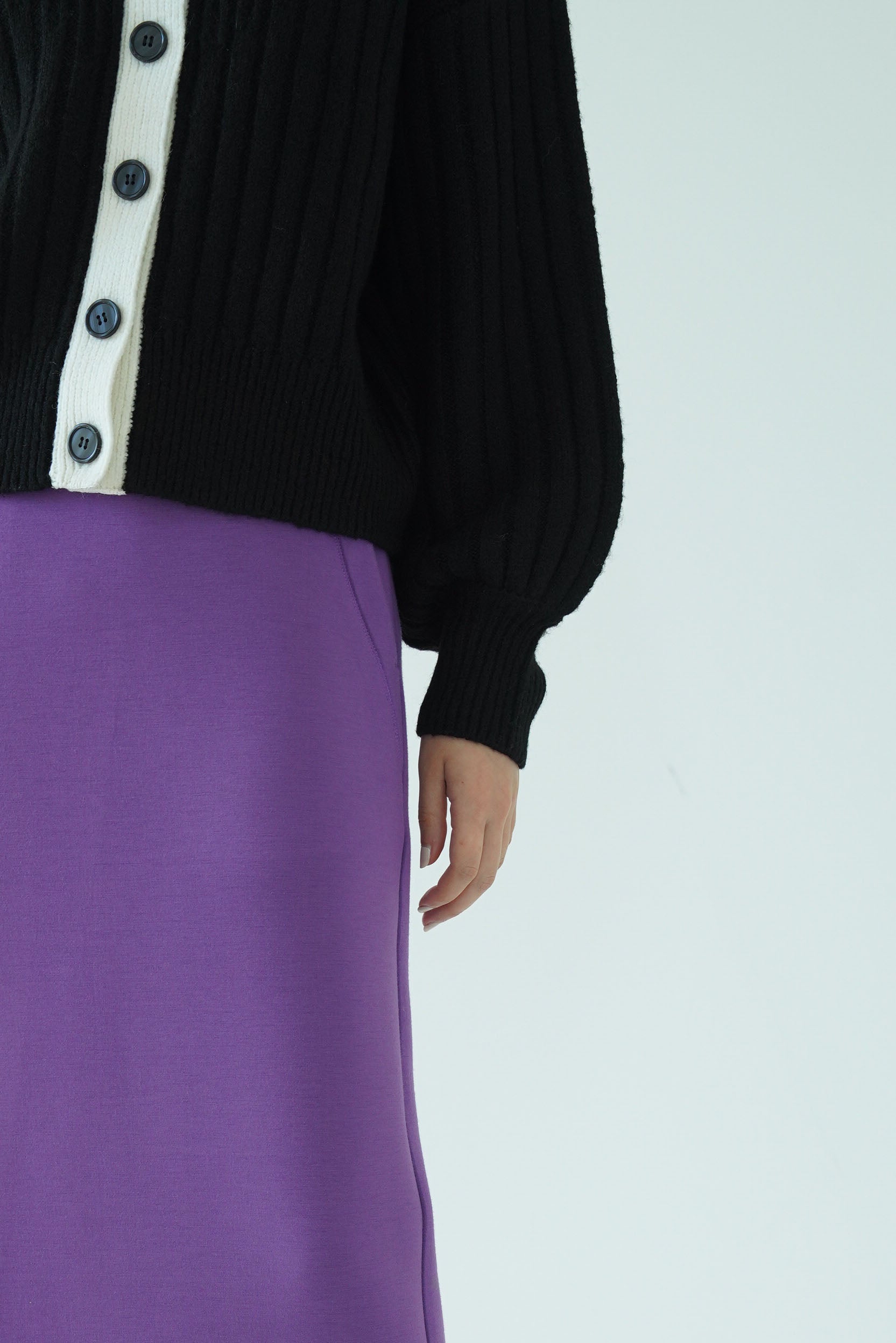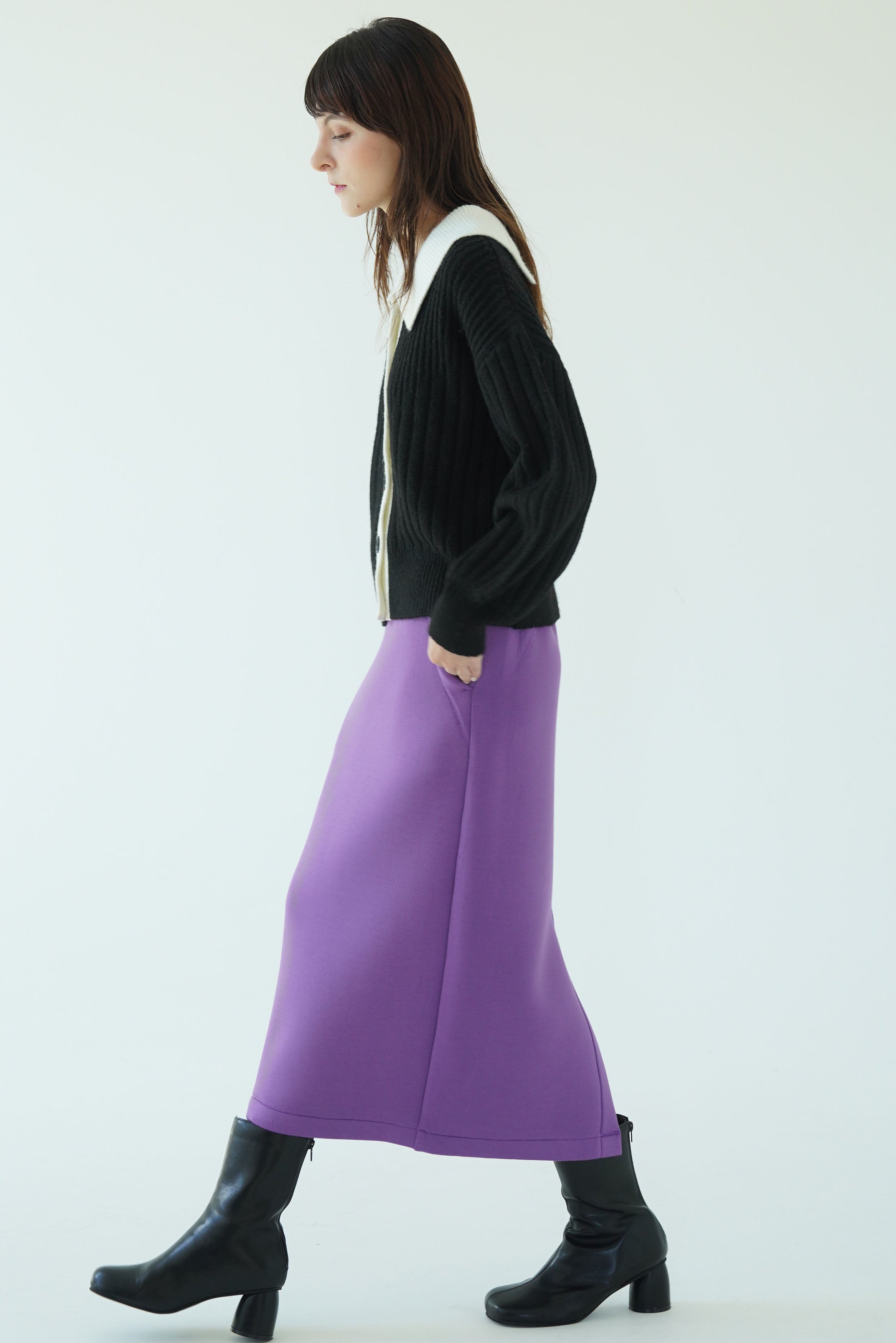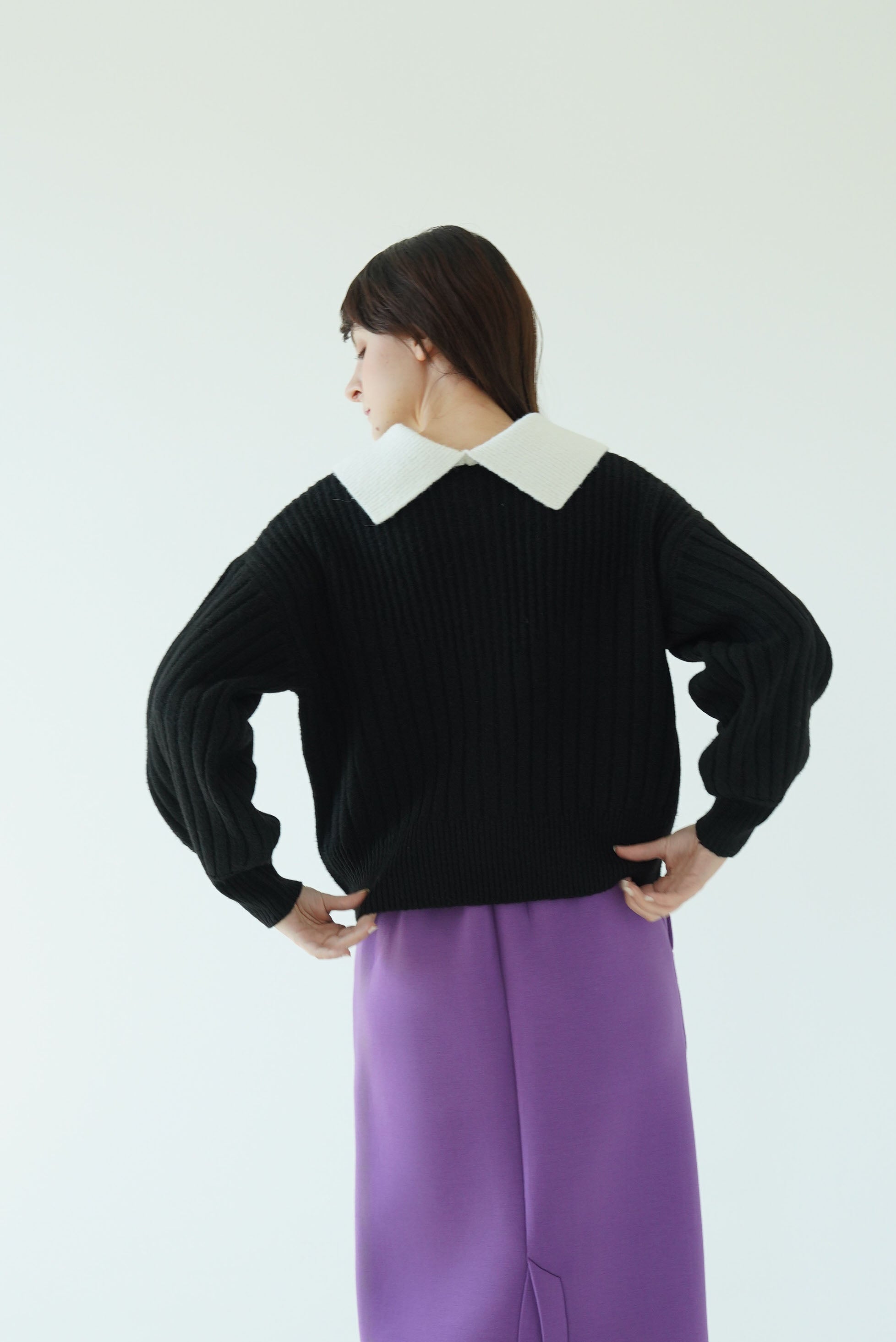 一見するとシンプルなリブニットですがリブの編み地がV字の切り替えから太さが変化しており、視覚効果ですっきり見えが叶います。