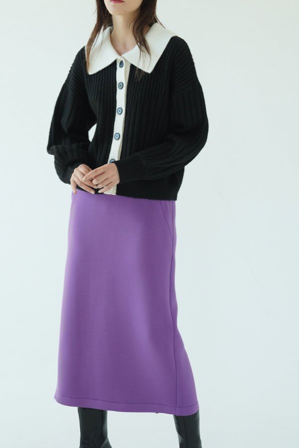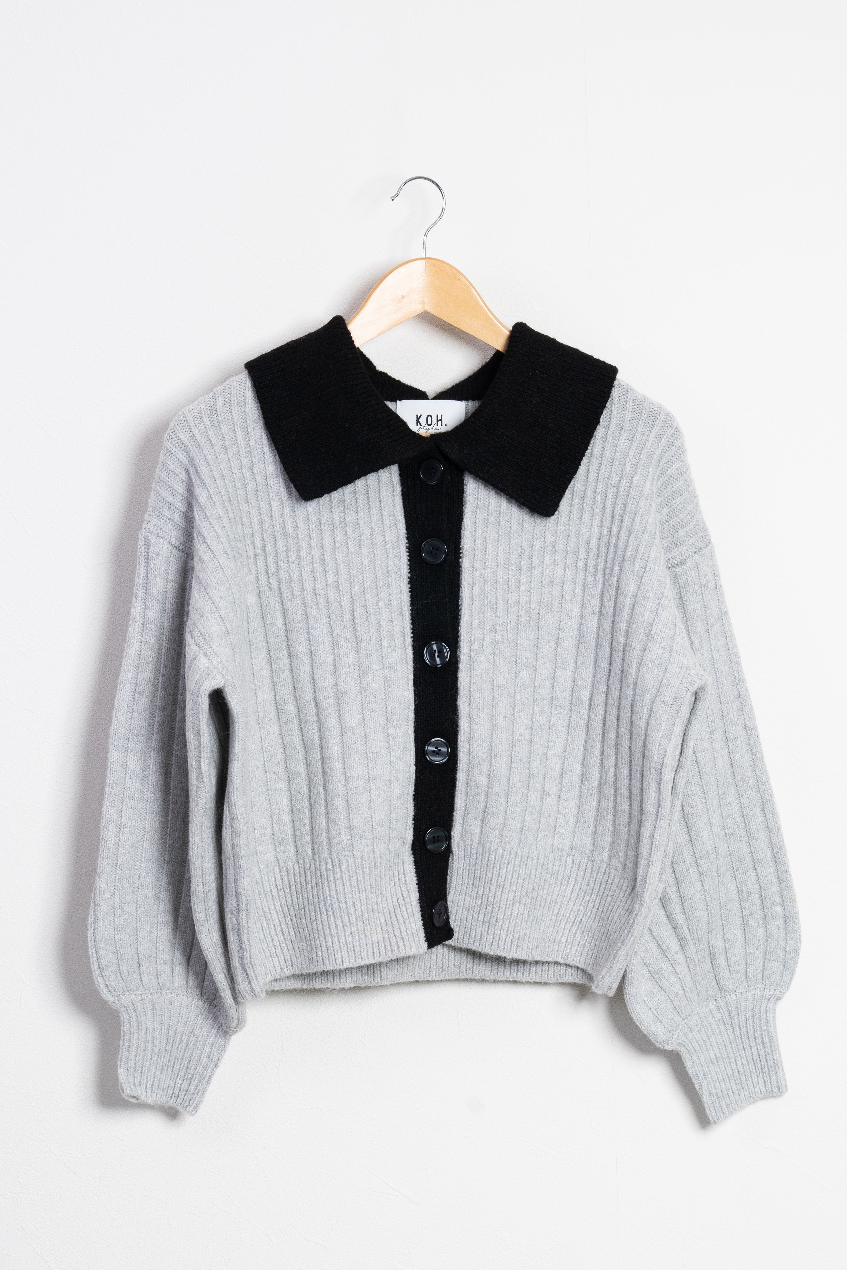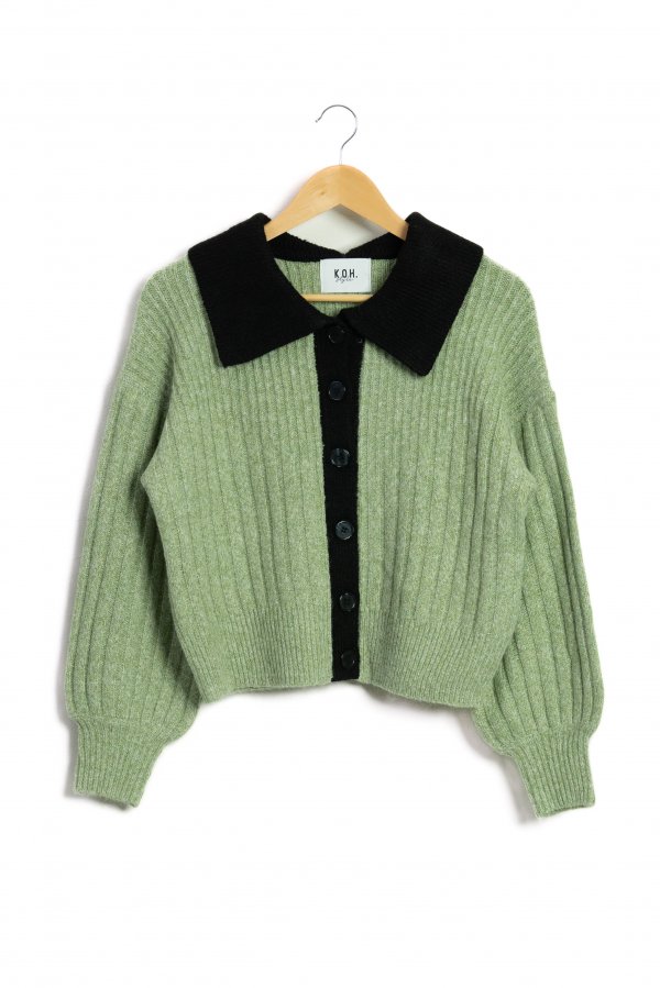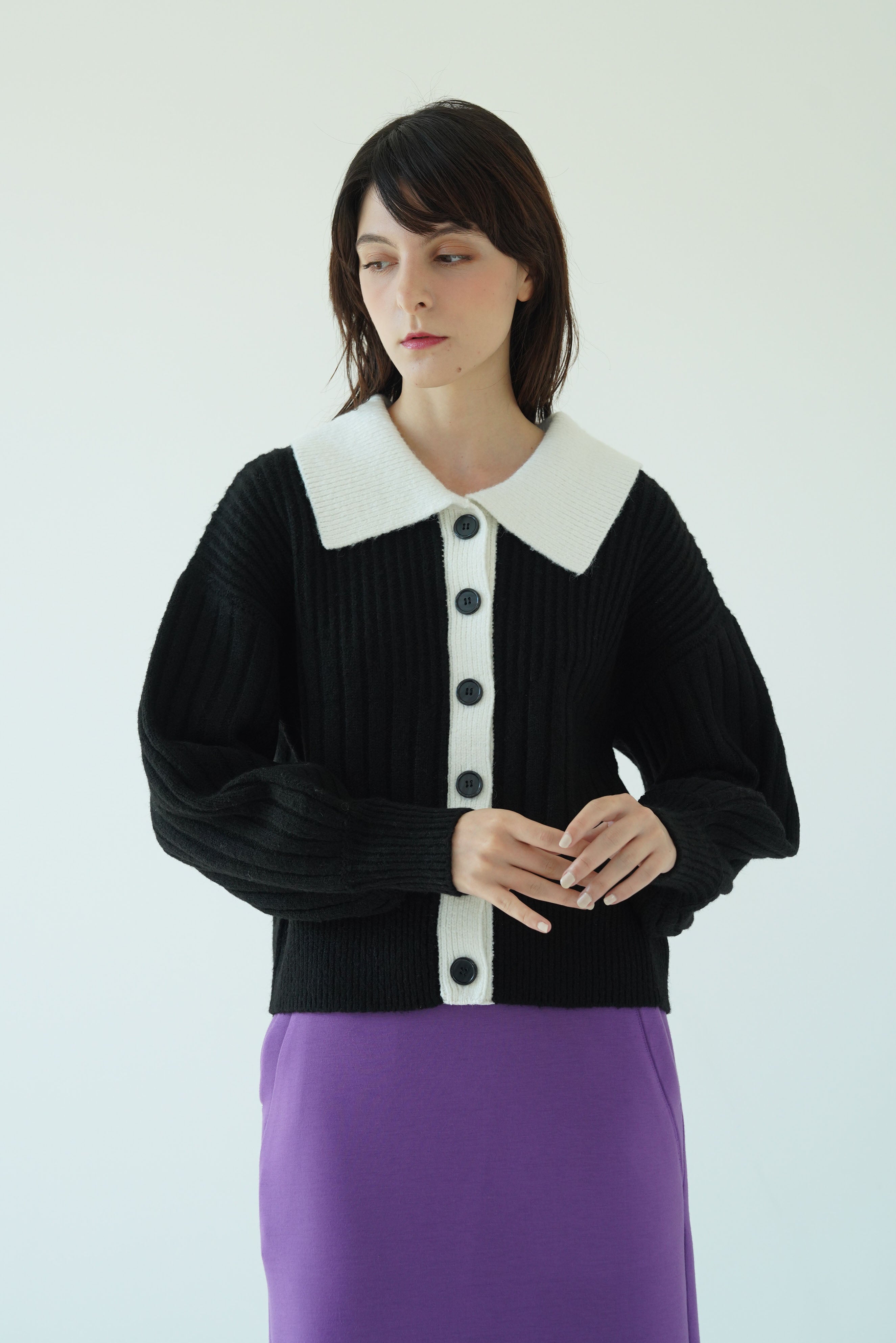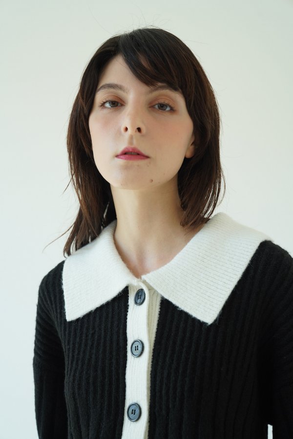 配色になった襟がレイヤード感のあるニットトップスとしても使える2WAYカーディガン。