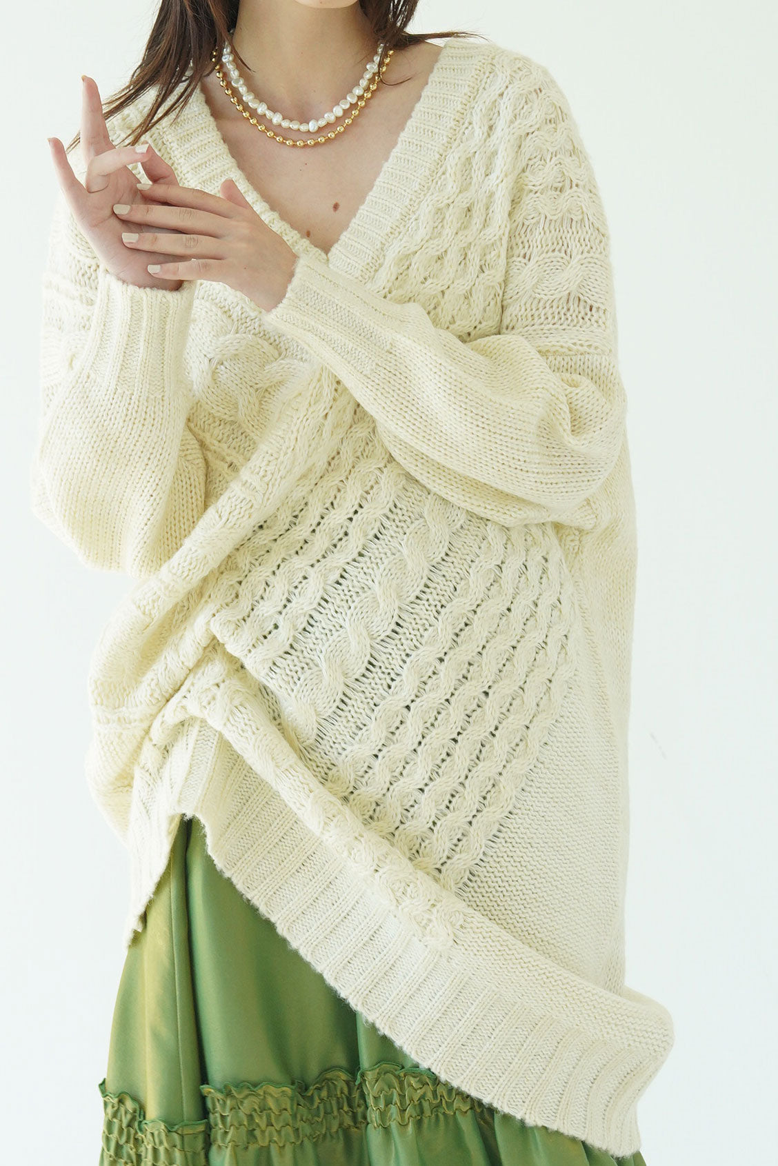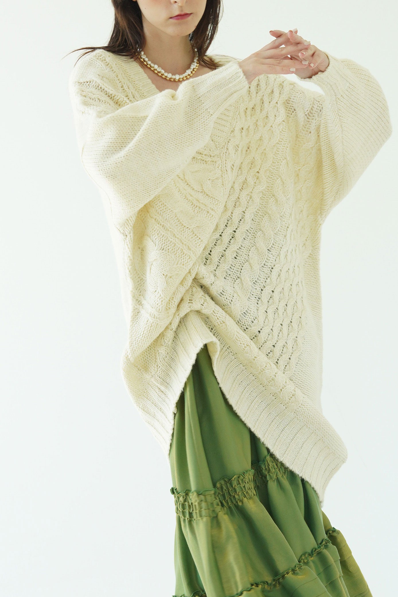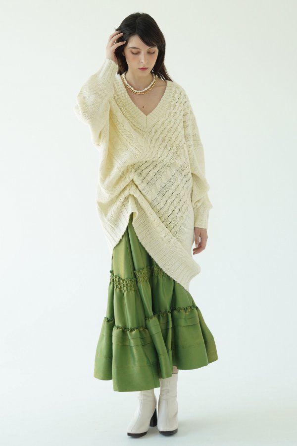 テクニックいらずでニュアンスシルエットが完成する小技ありのケーブルニットトップス。