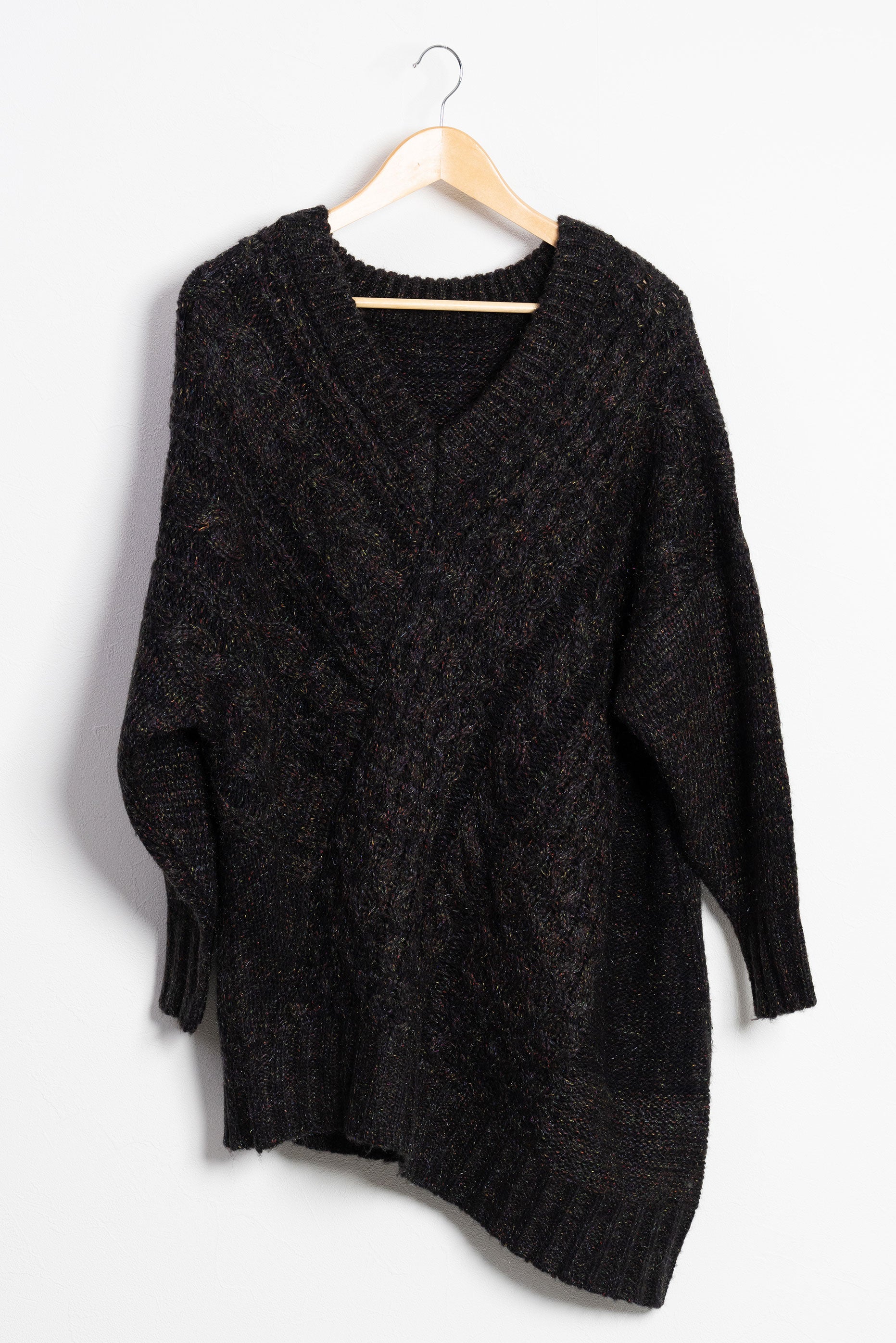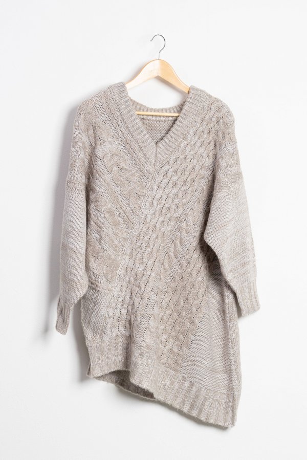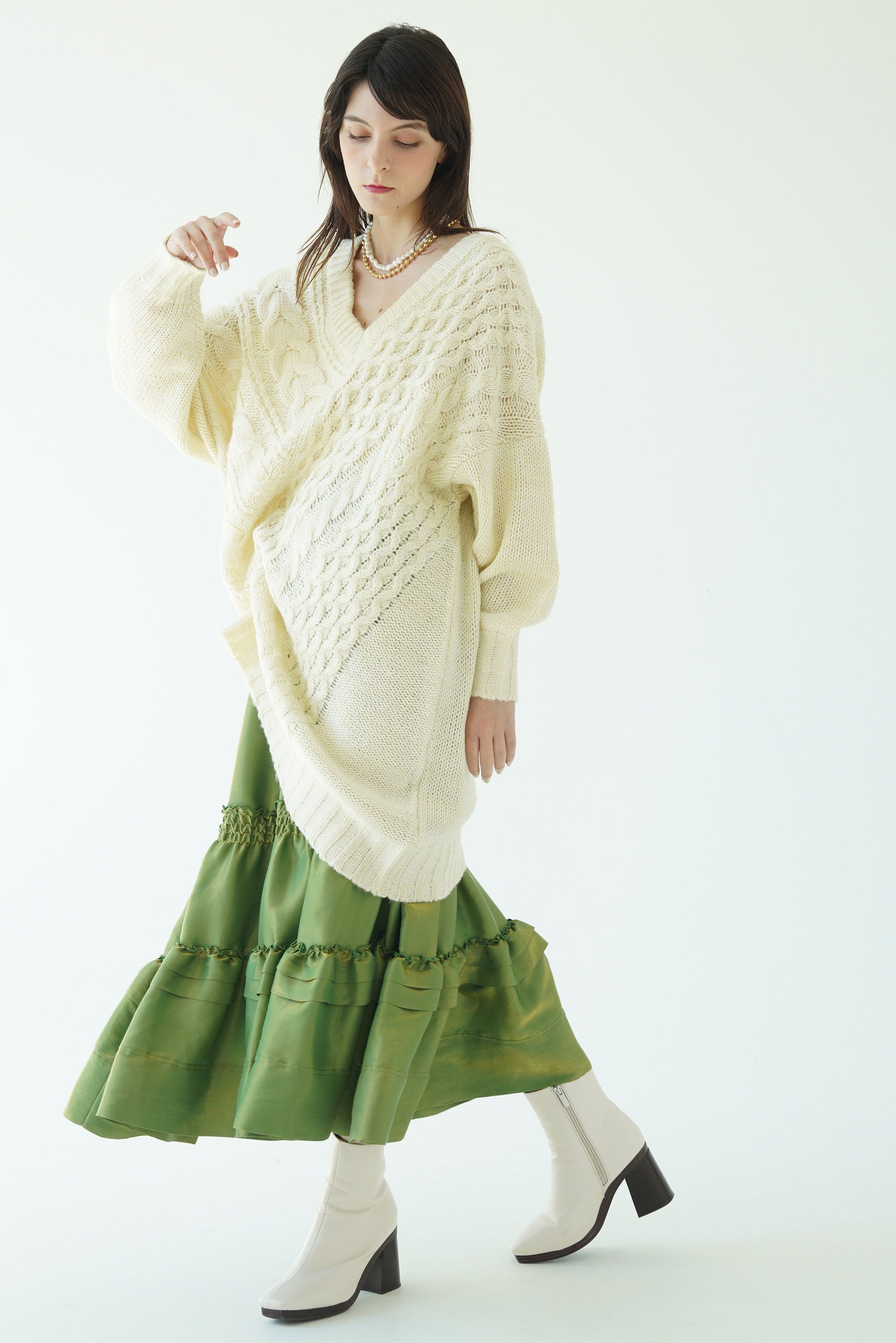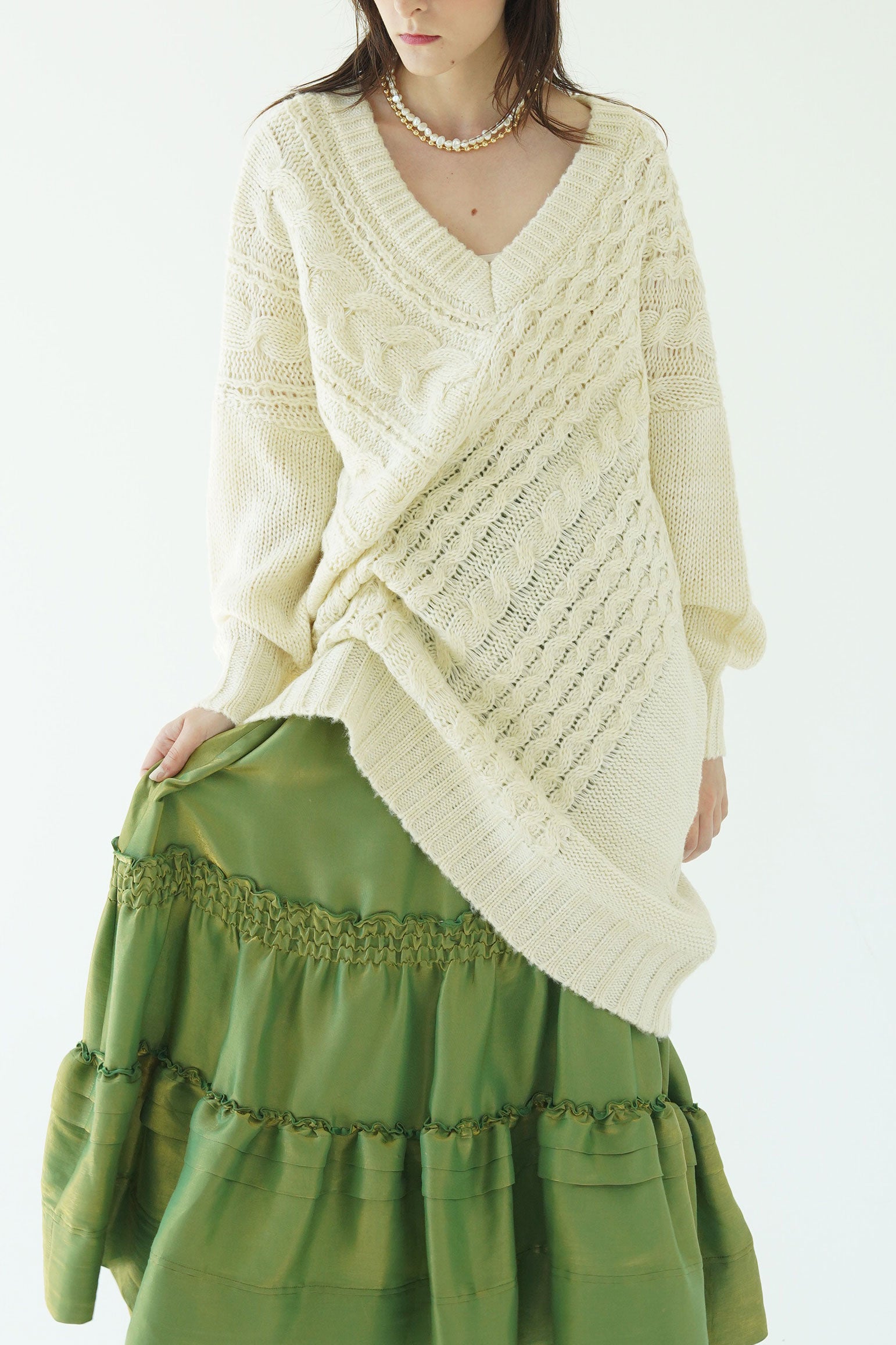 テクニックいらずでニュアンスシルエットが完成する小技ありのケーブルニットトップス。
