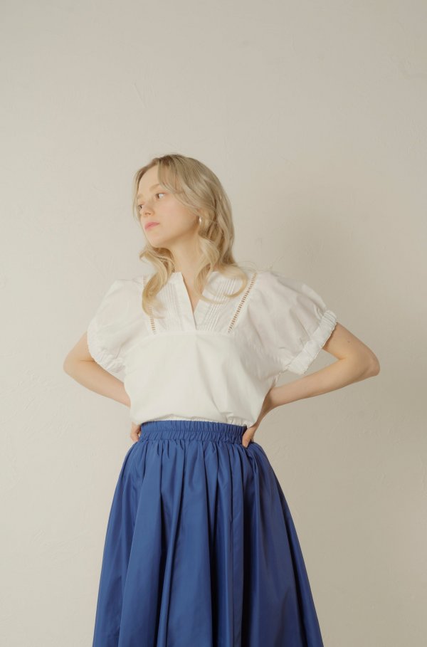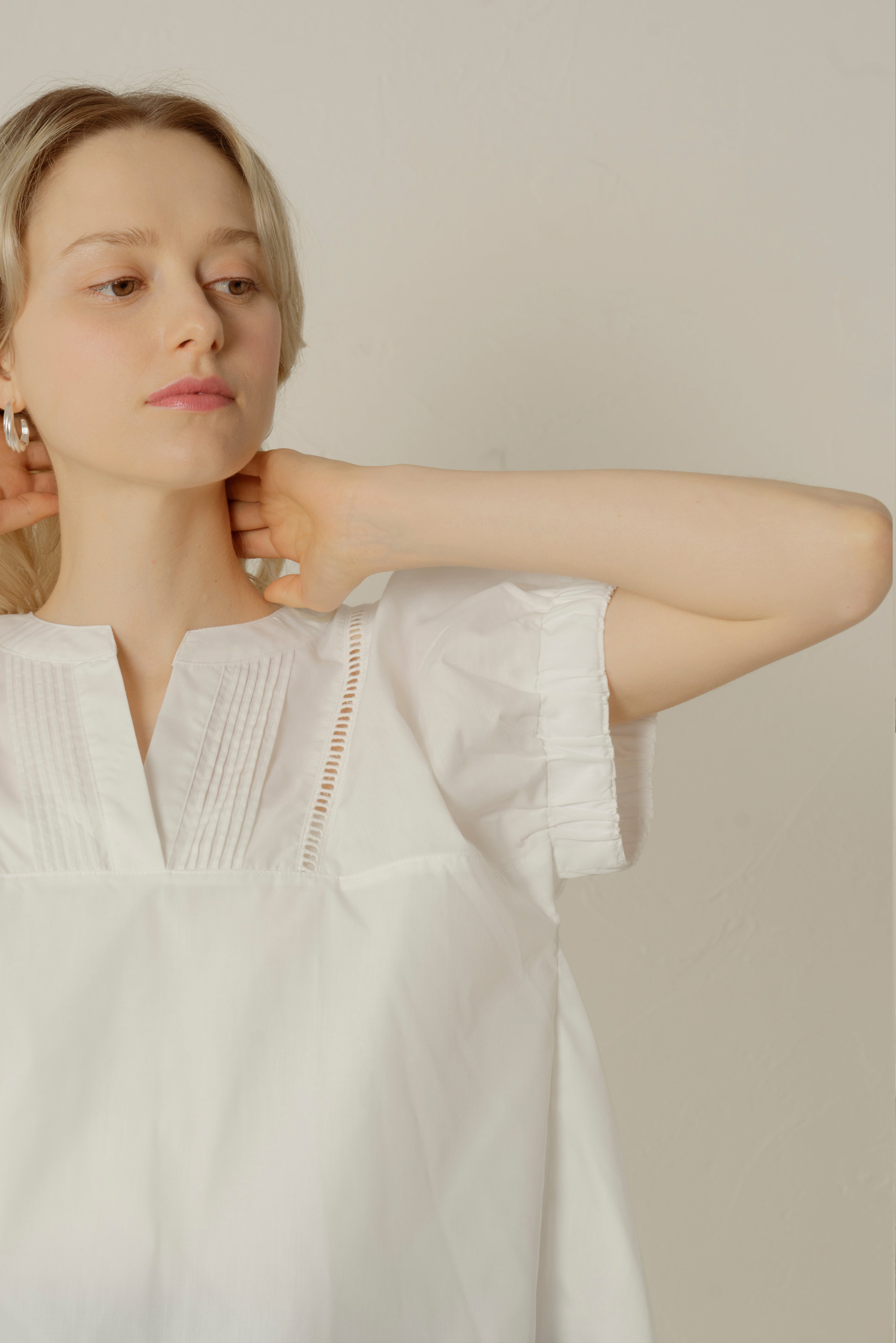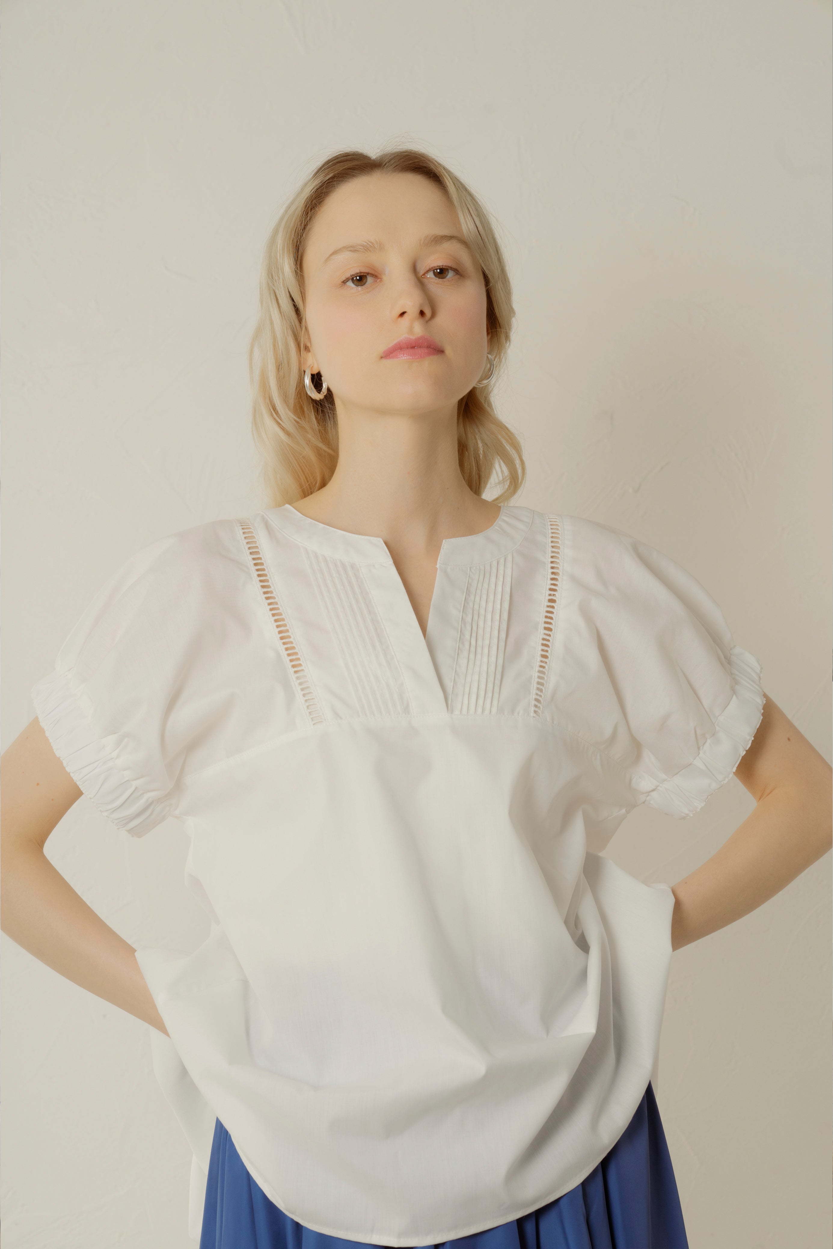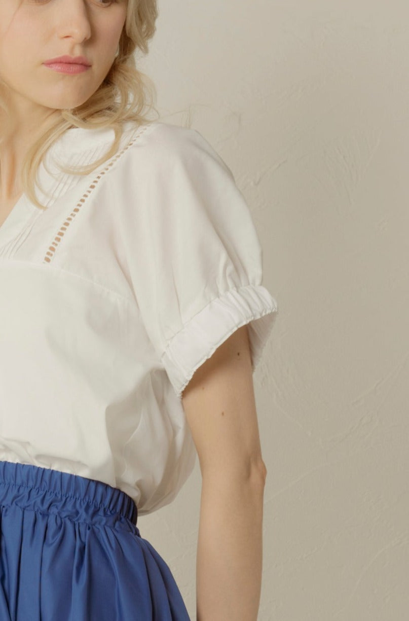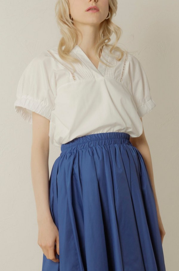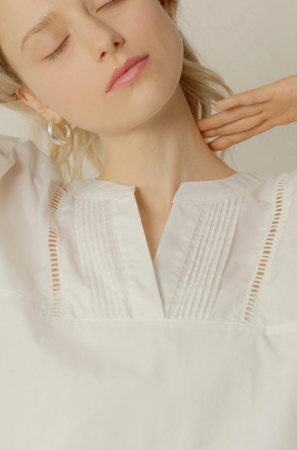 バックプリーツとデコルテ周りに繊細なハシゴレースと細やかなタックがポイントの涼しげなシャツトップス。