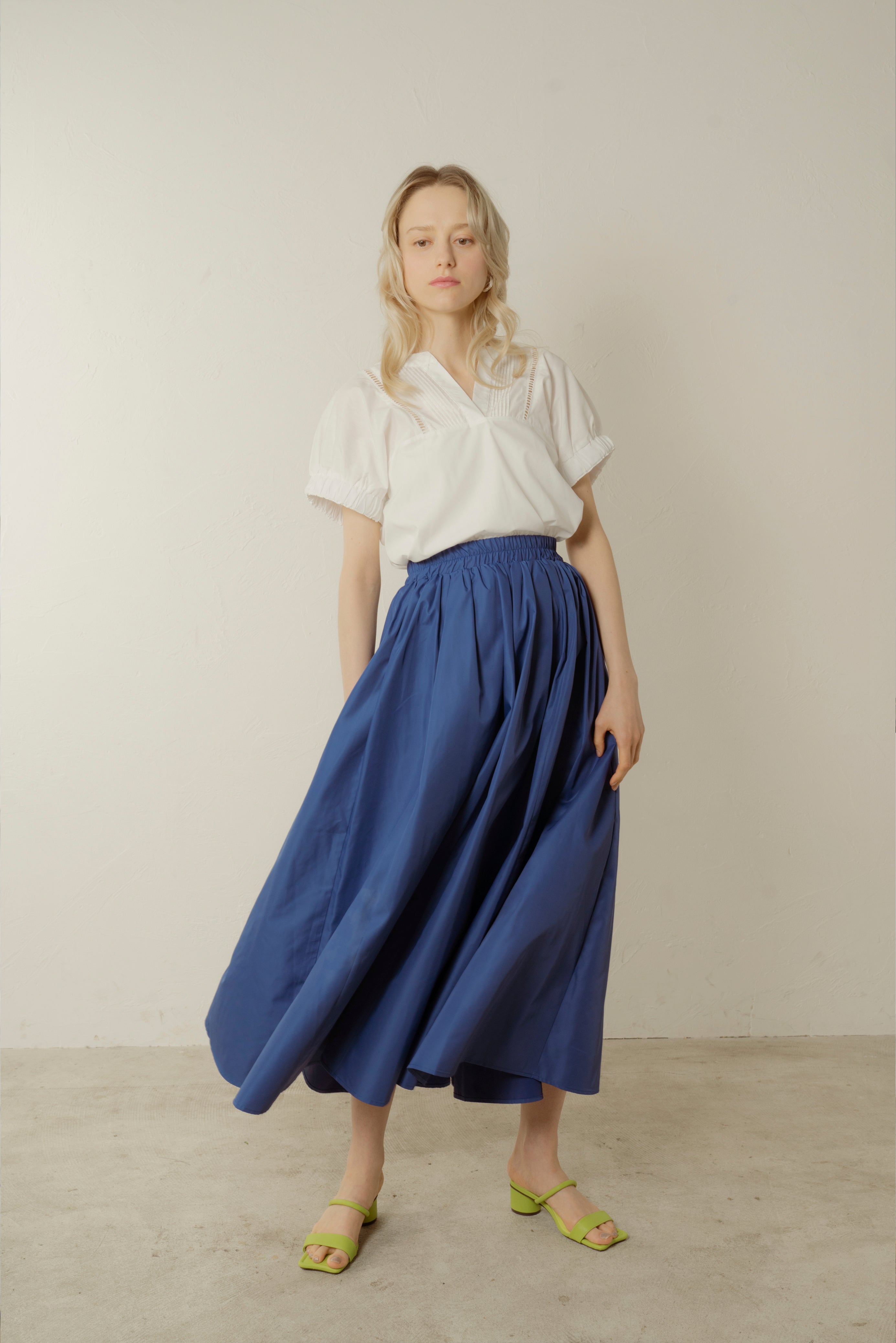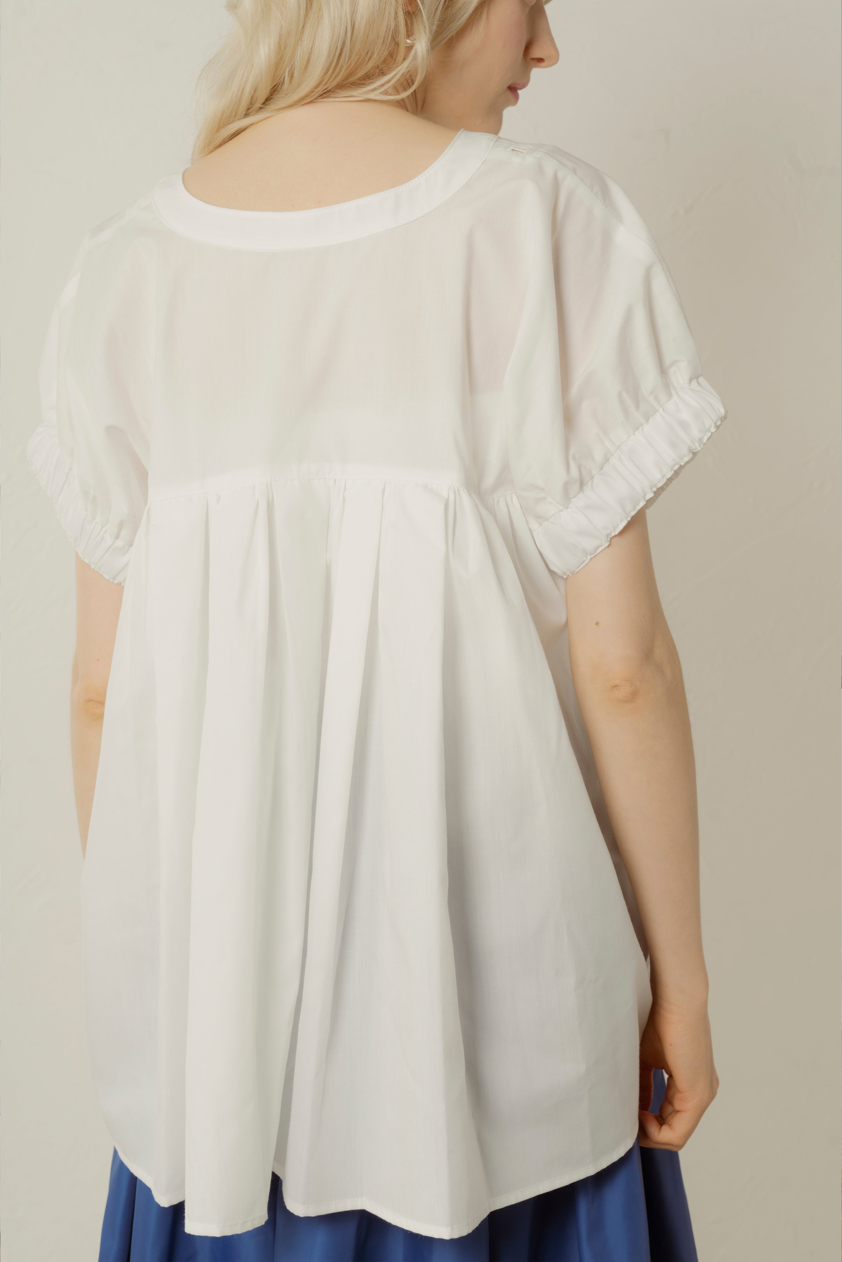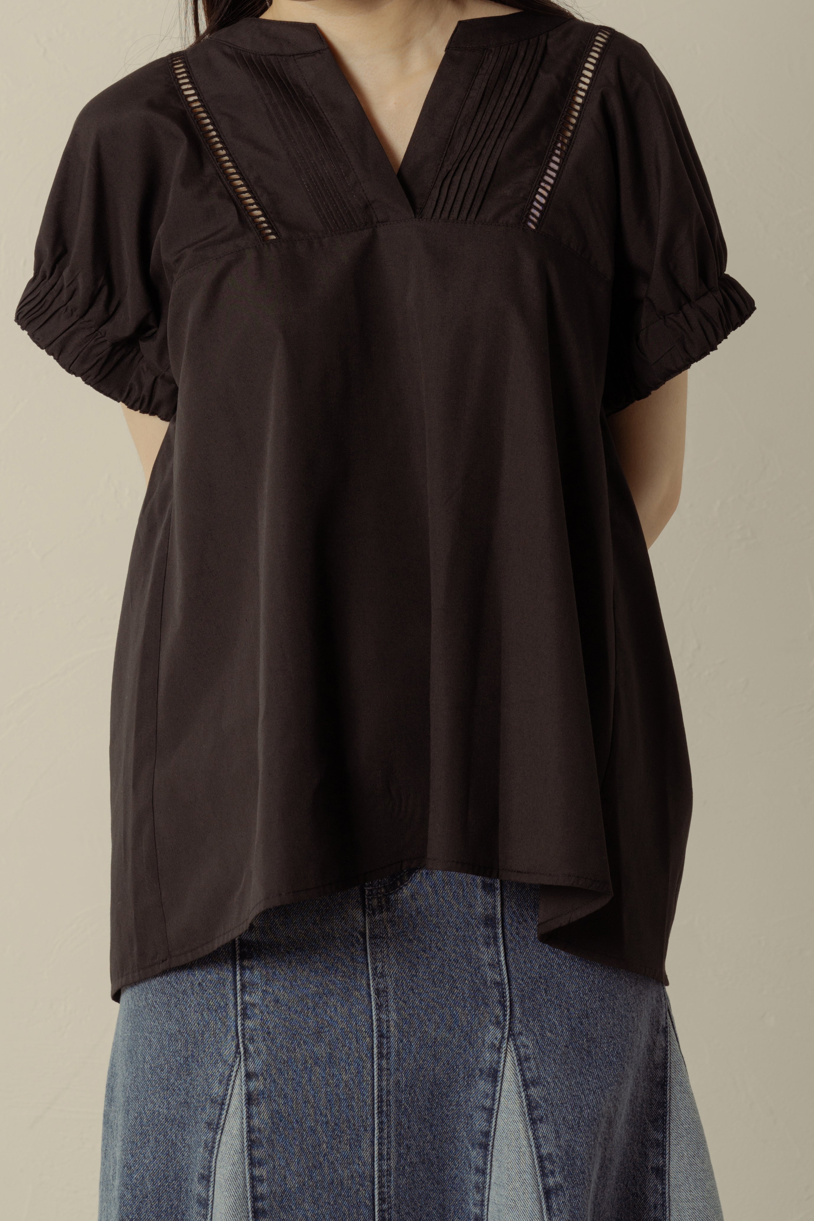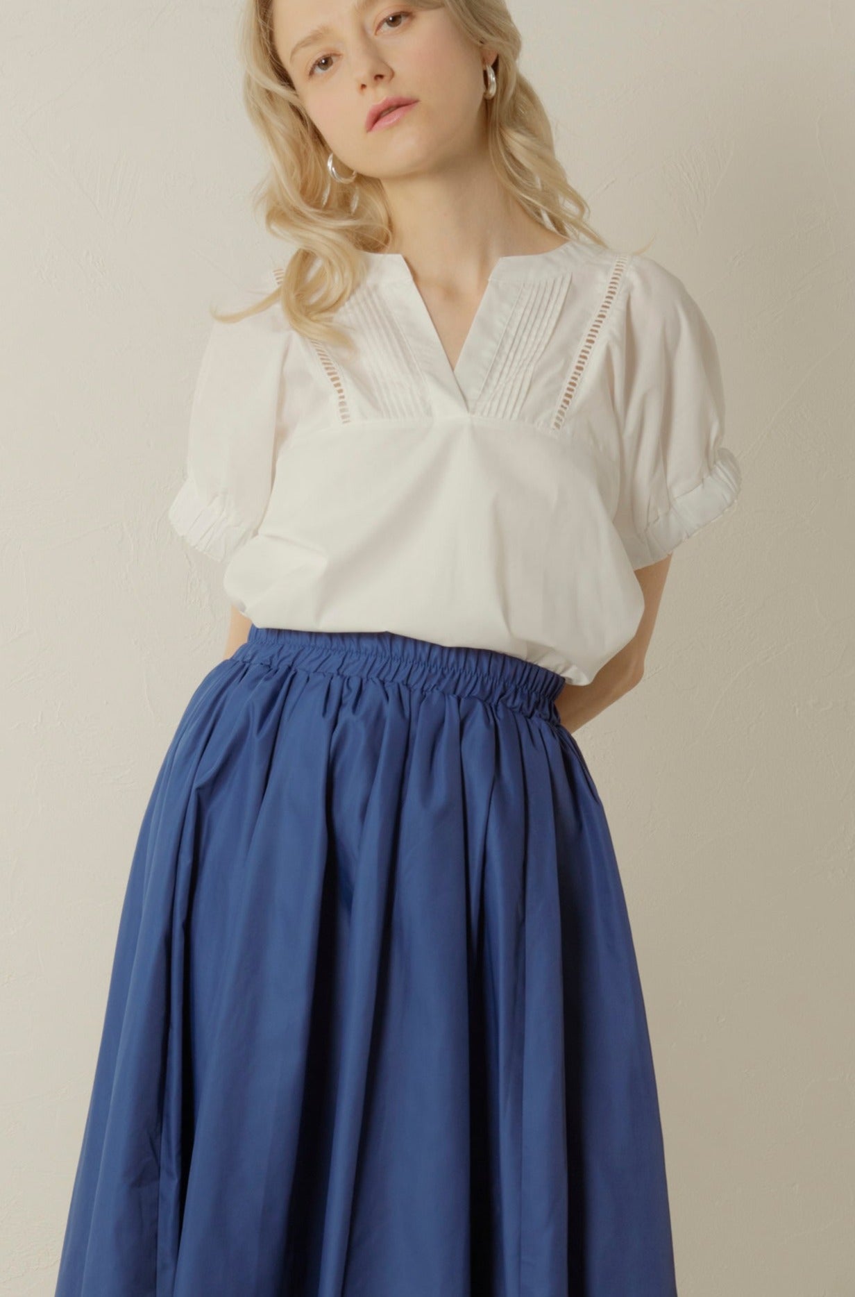 バックプリーツとデコルテ周りに繊細なハシゴレースと細やかなタックがポイントの涼しげなシャツトップス。