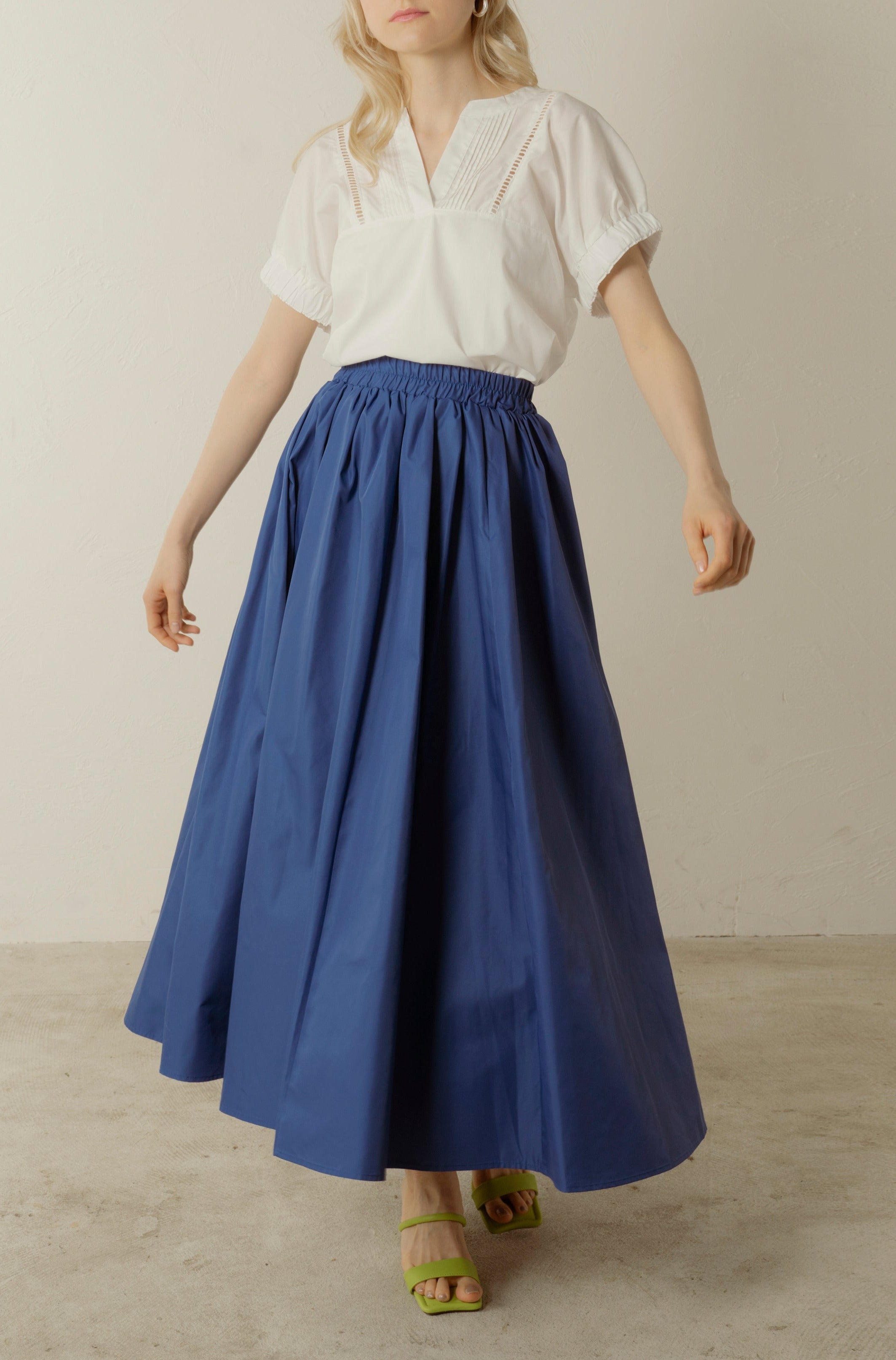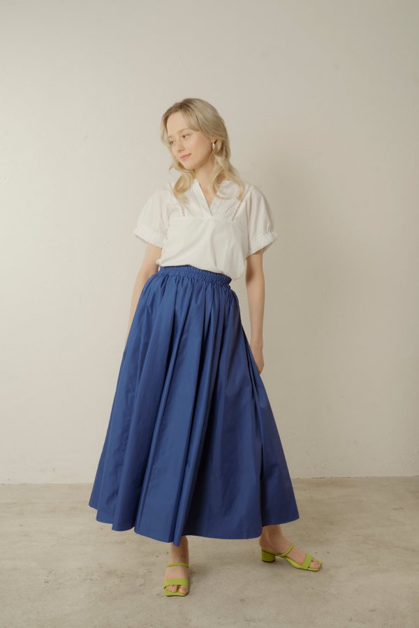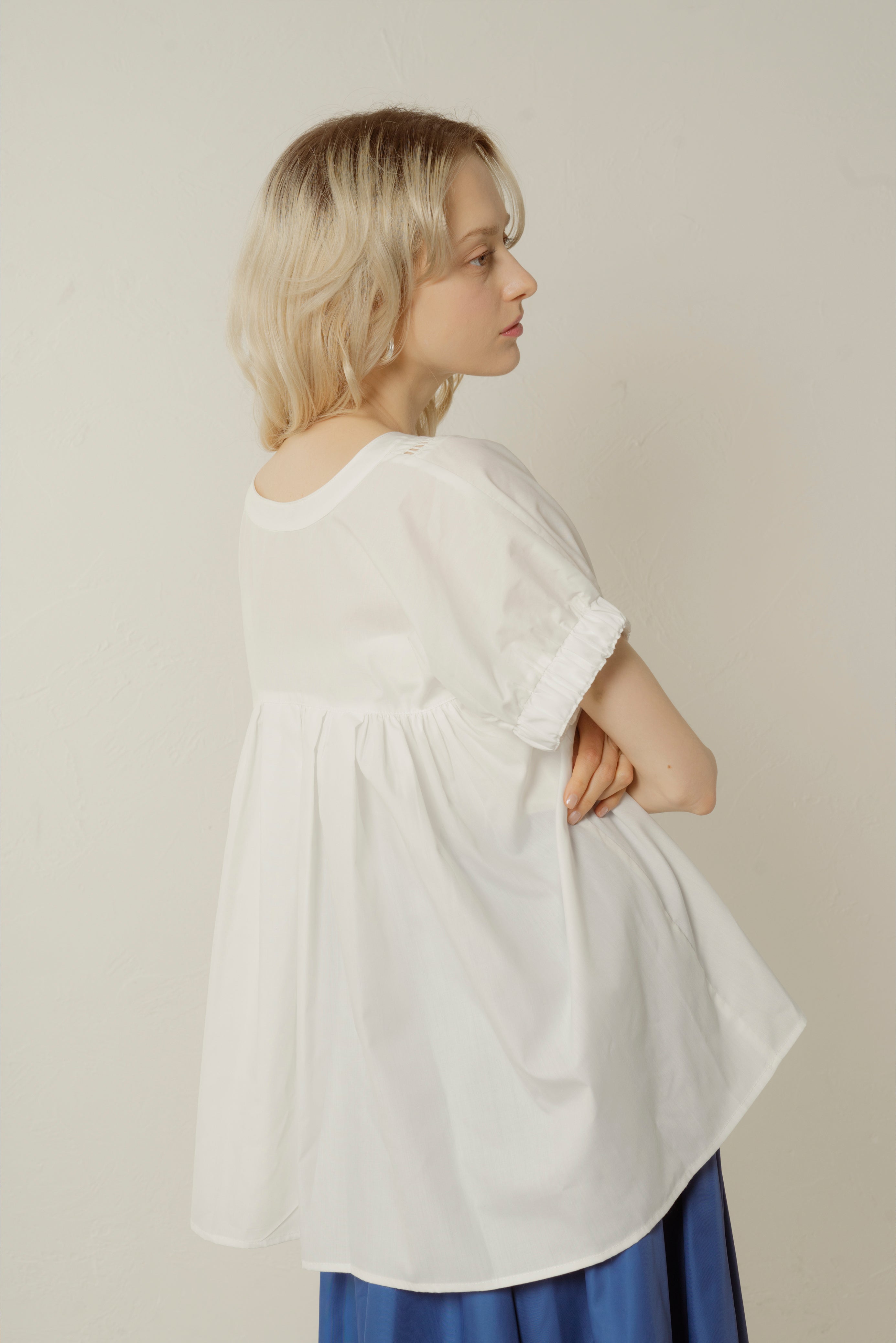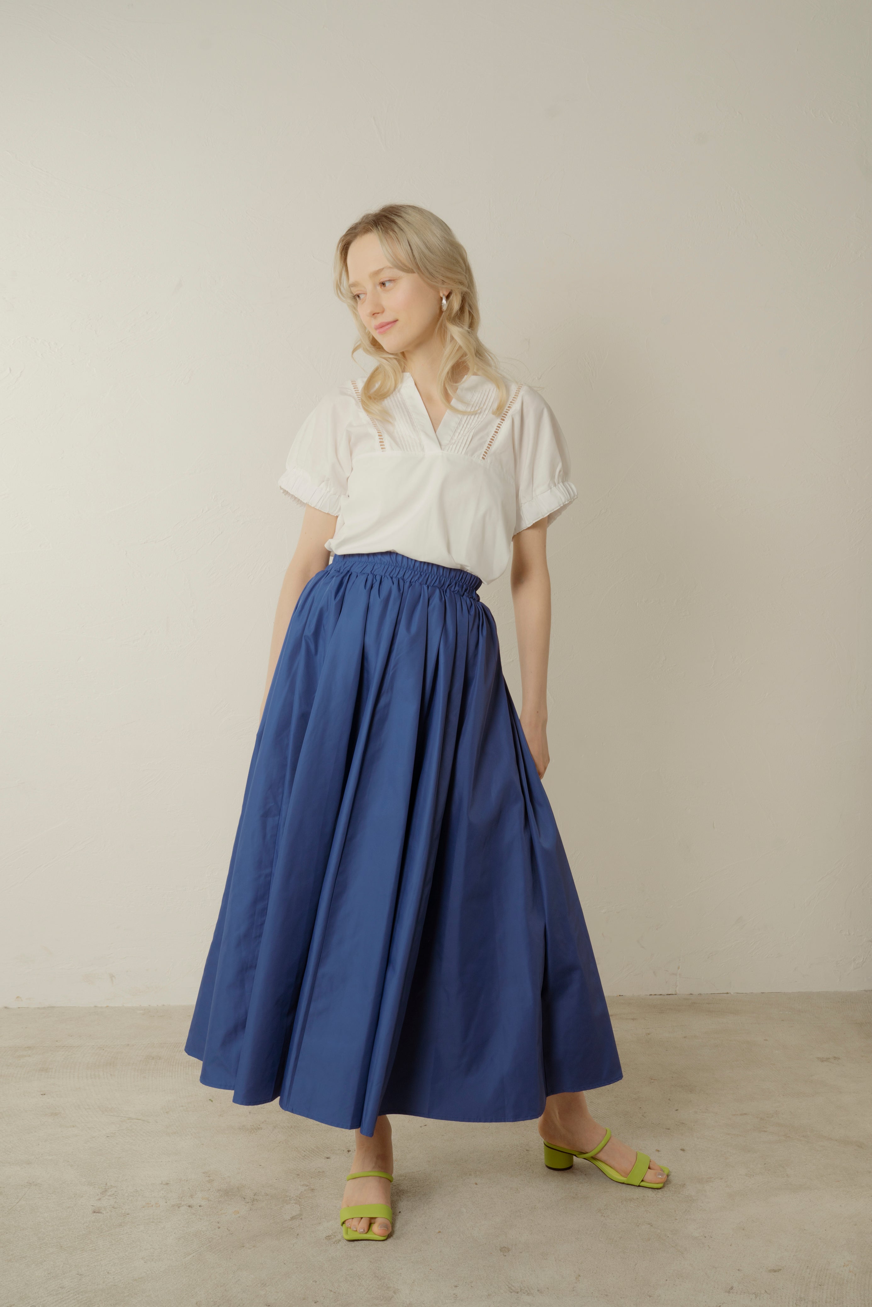 袖口は幅広いゴムでシャーリングでアイテムとしての存在感は十分ながらもキーネックで抜け感を演出。