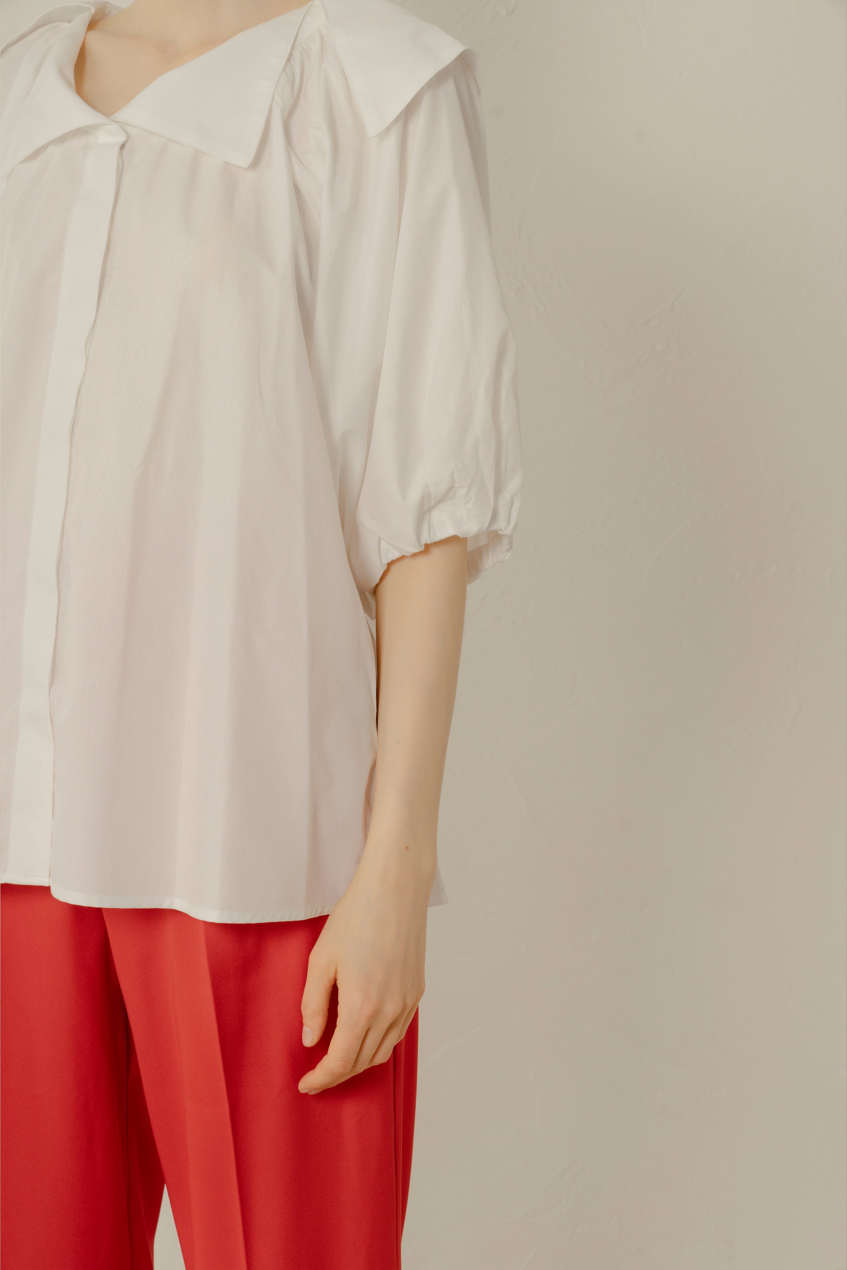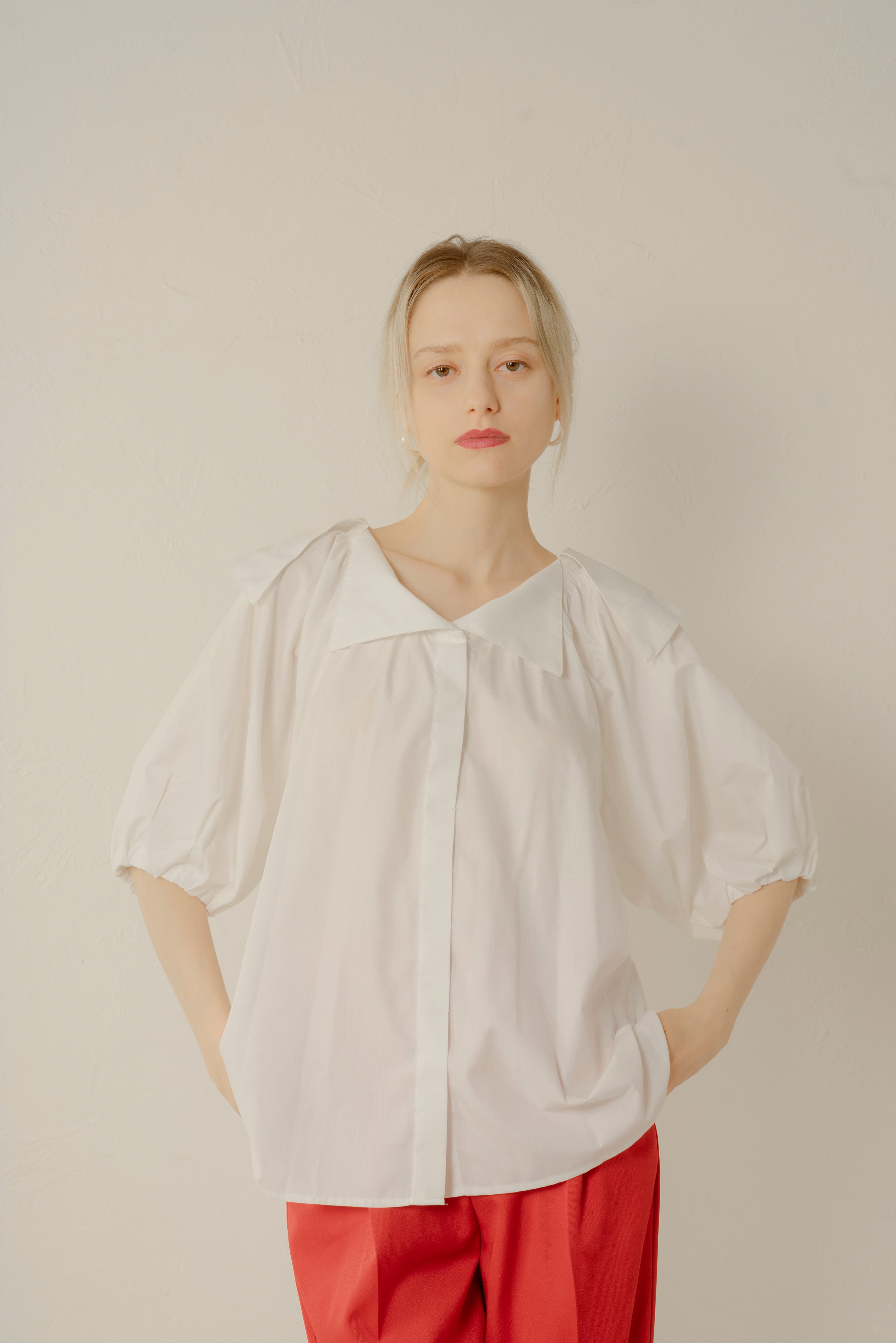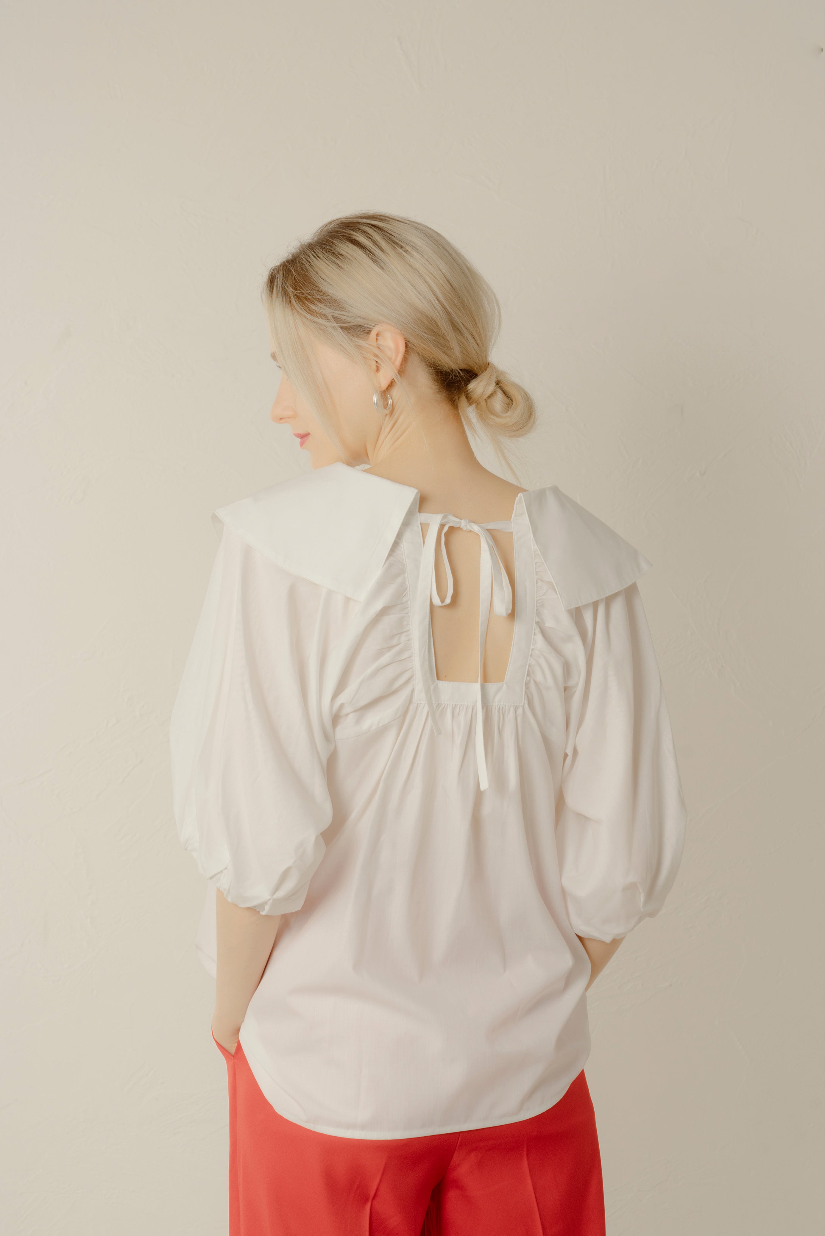 花びらのような襟とほどよく開いたバックスタイルがポイントのシャツブラウス。