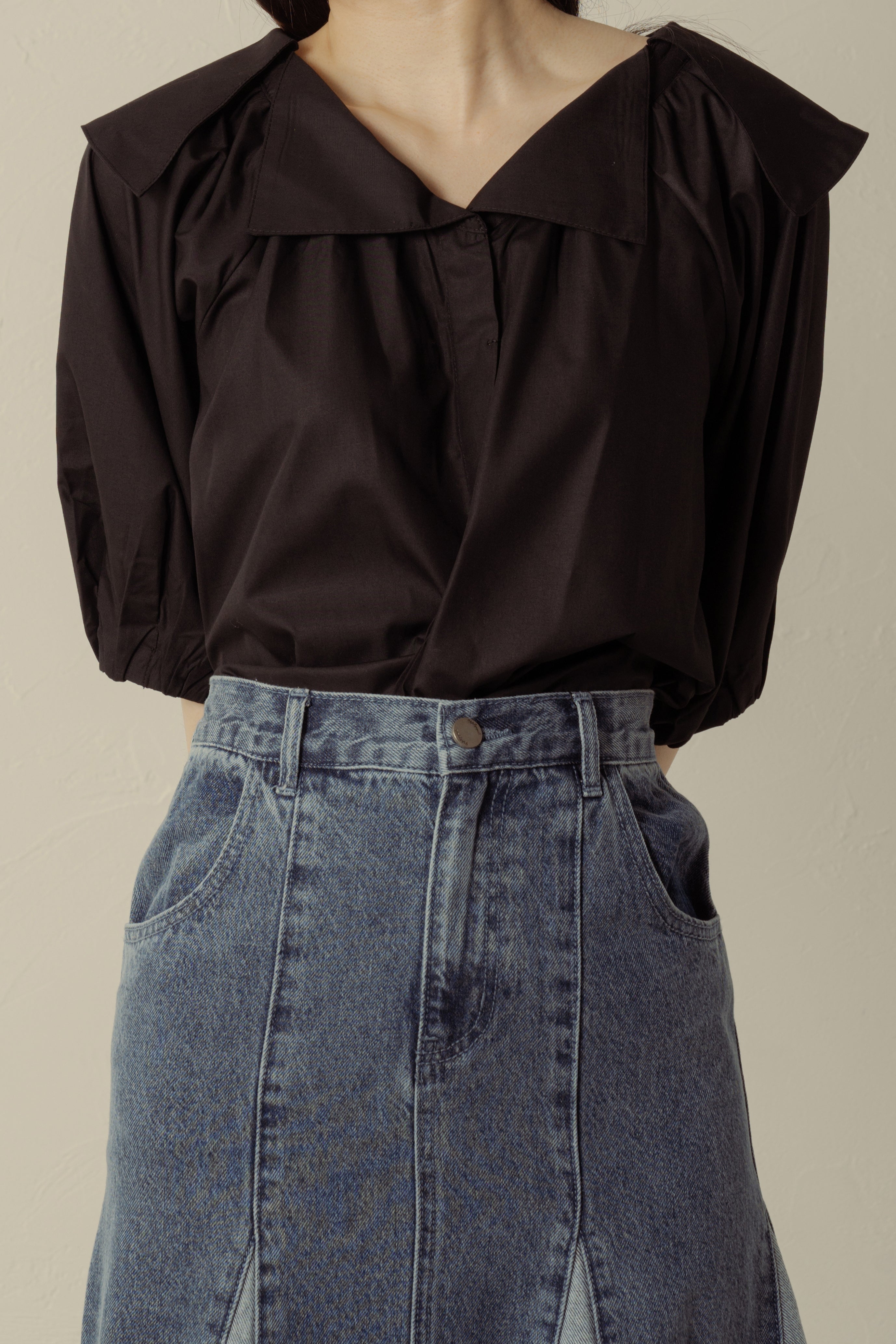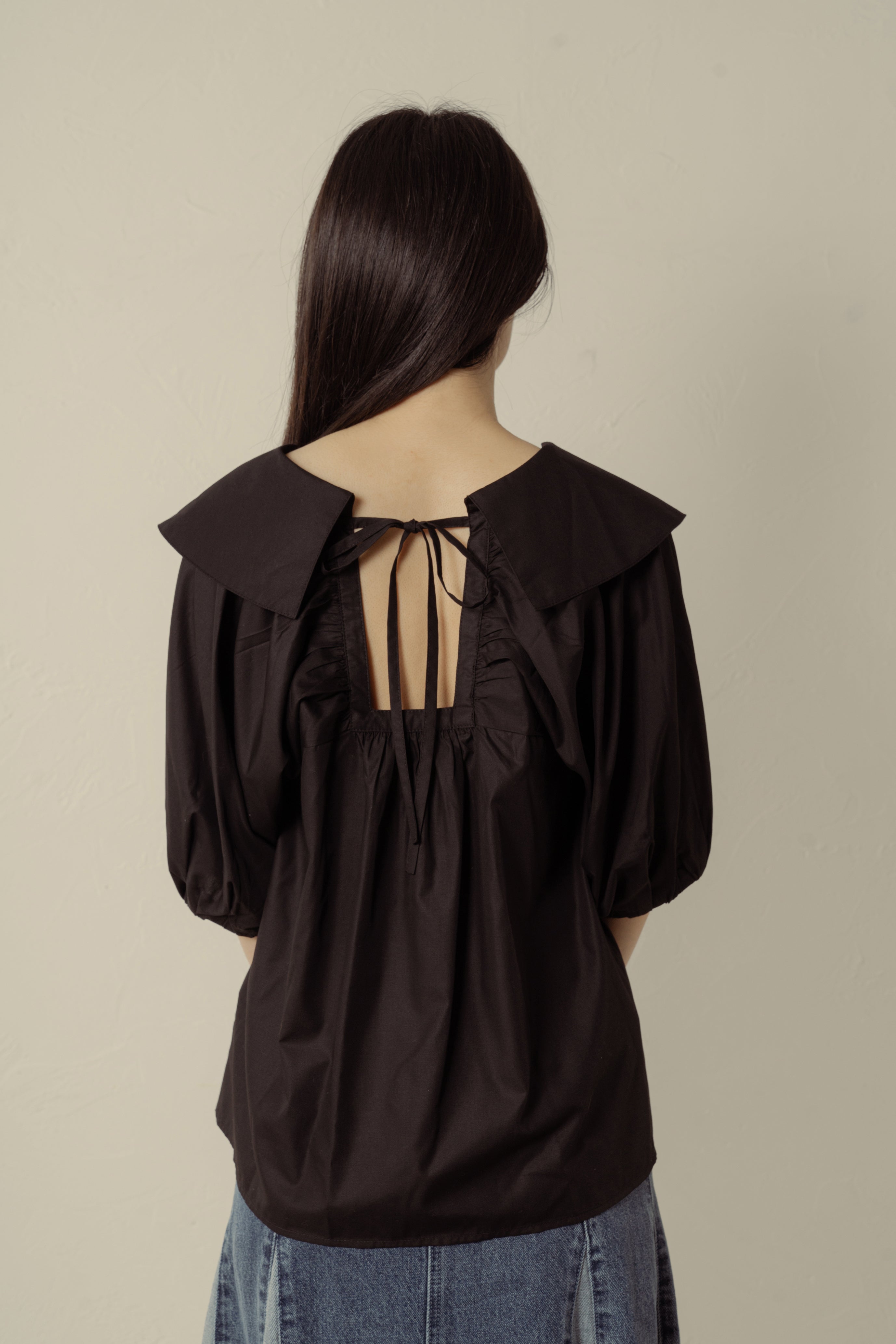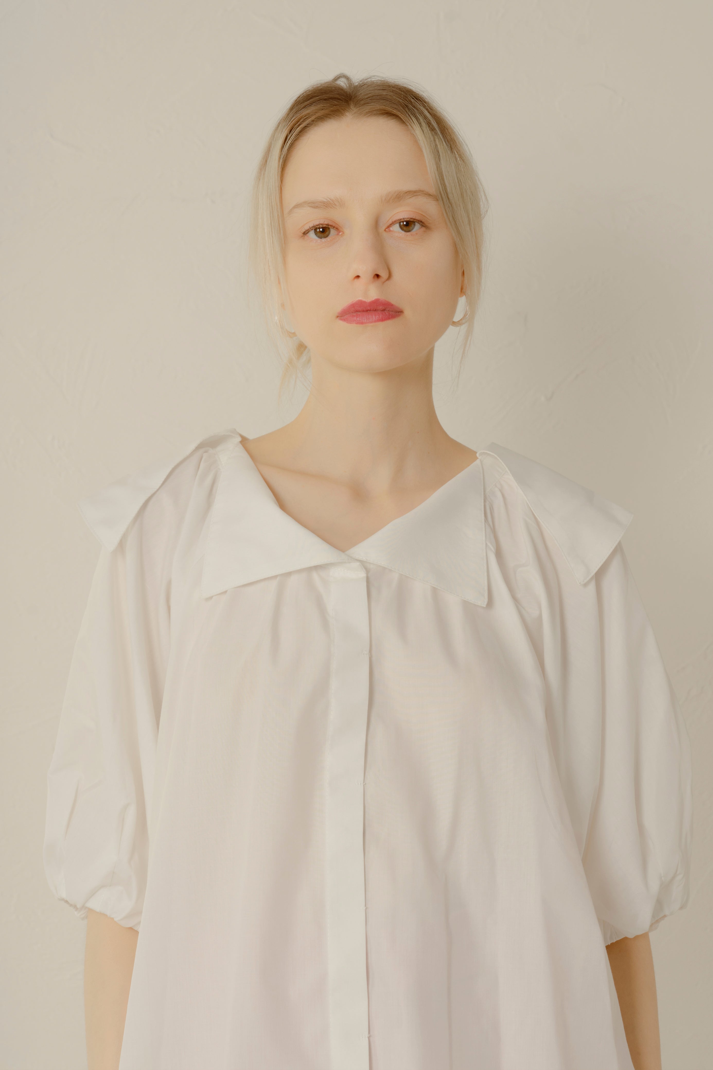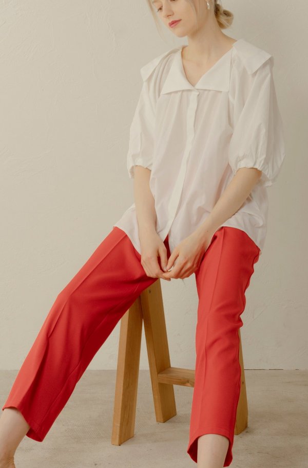 花びらのような襟とほどよく開いたバックスタイルがポイントのシャツブラウス。