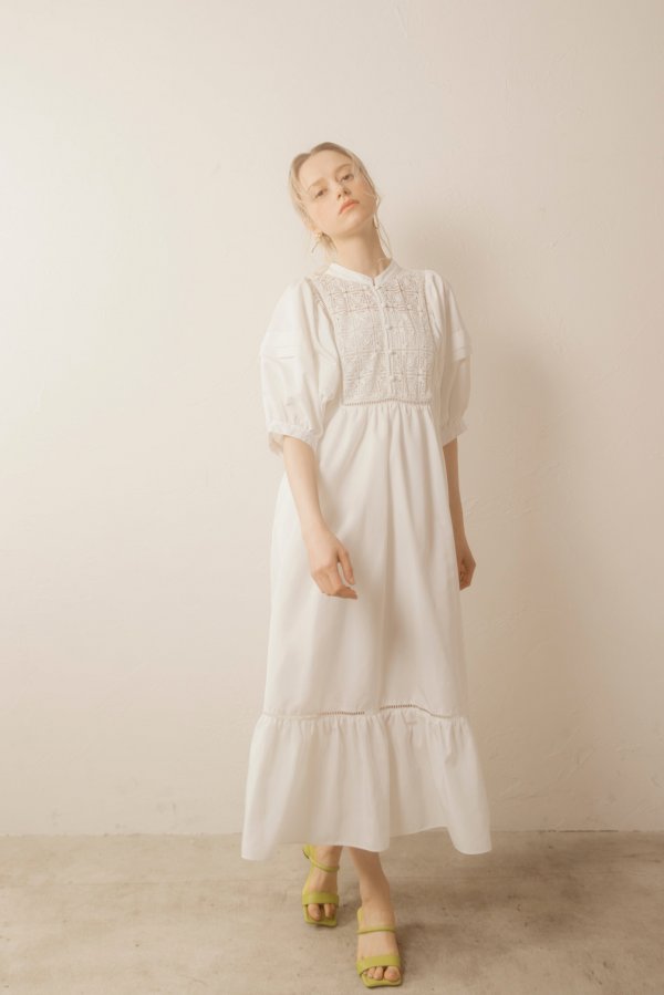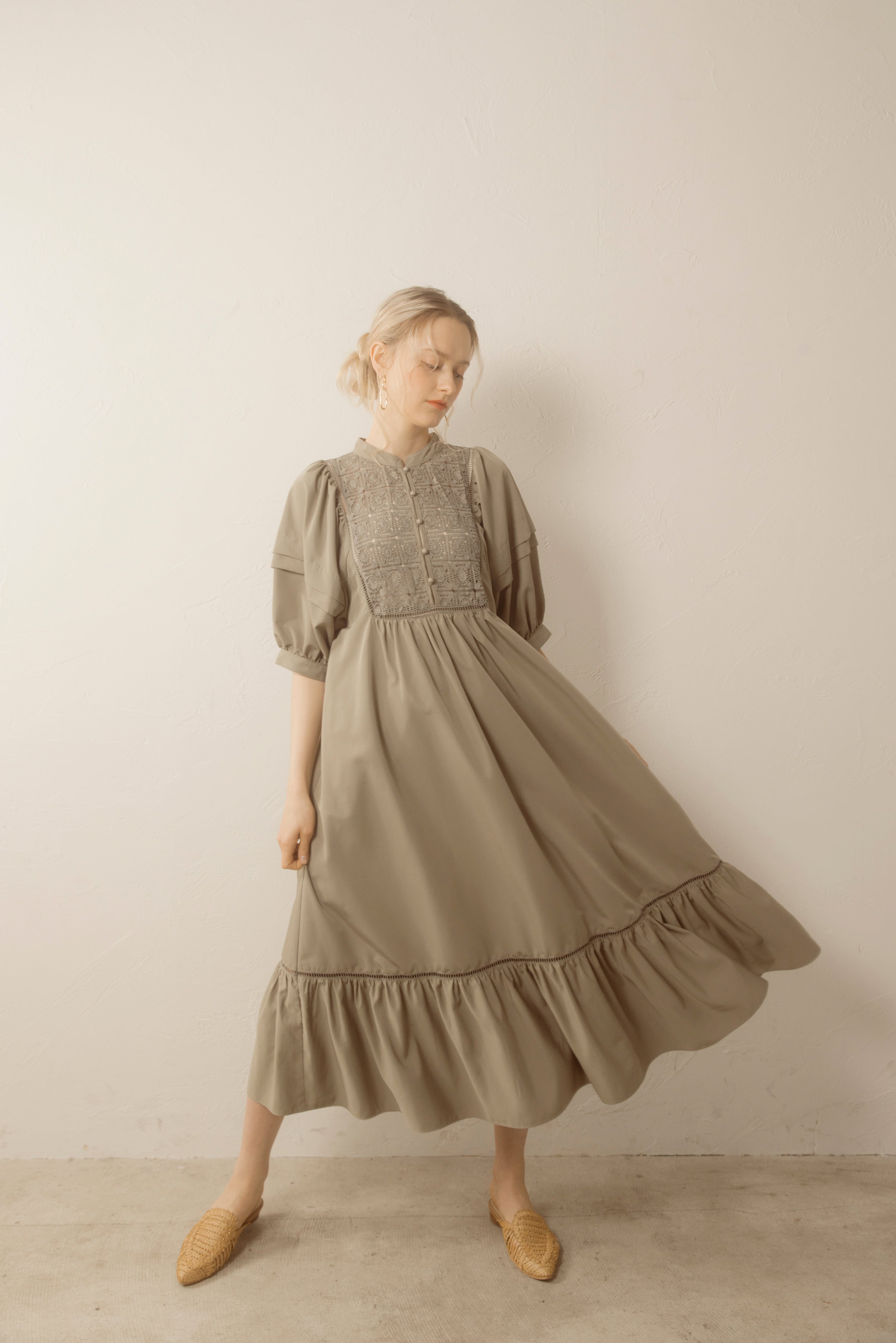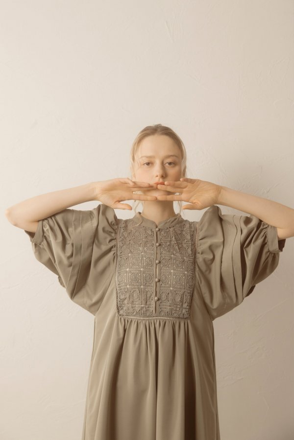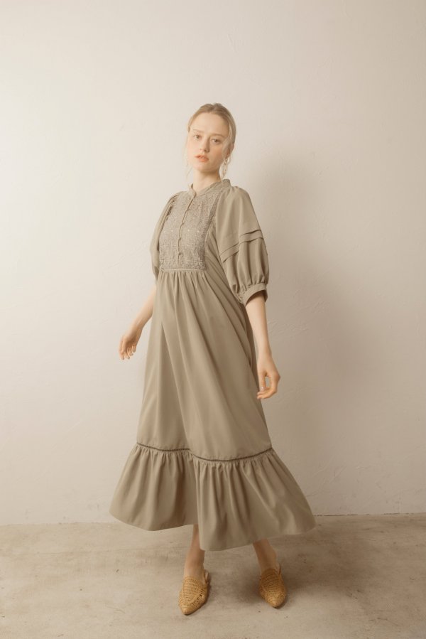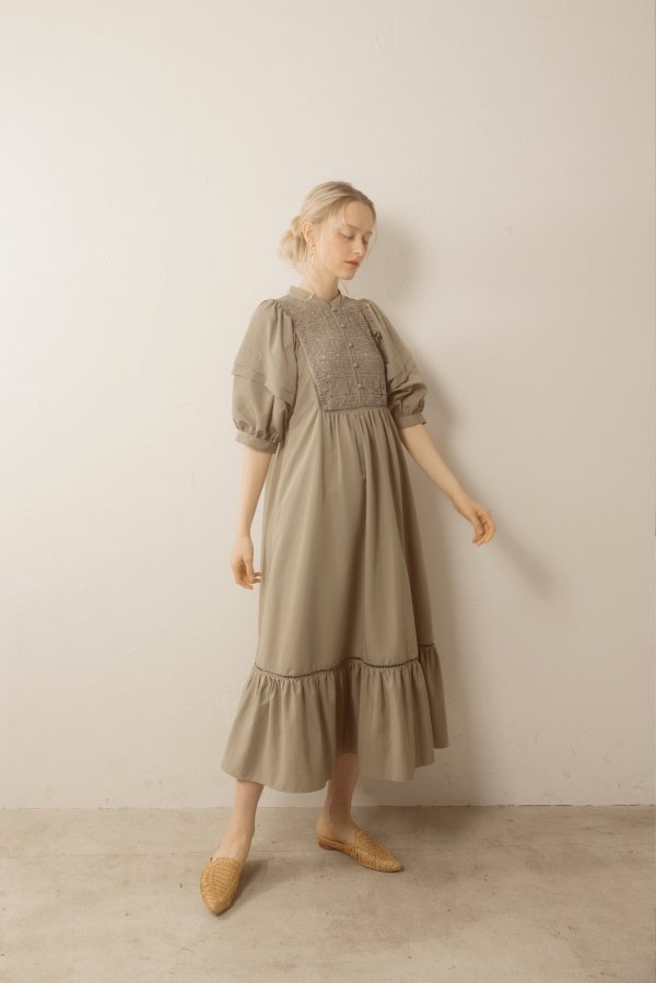デコルテとティアード切り替え部分のはしごレースの透け感がさりげない肌見せがを演出してくれます。