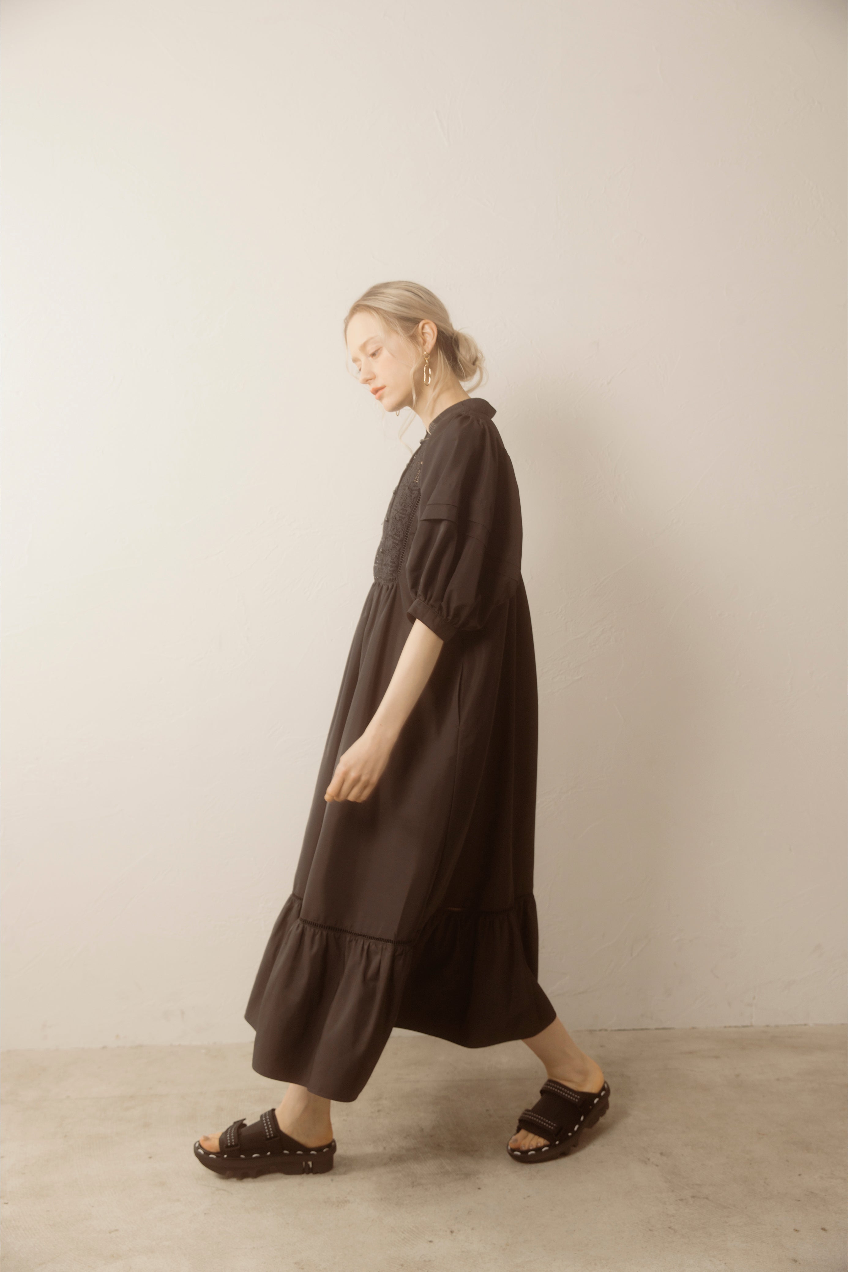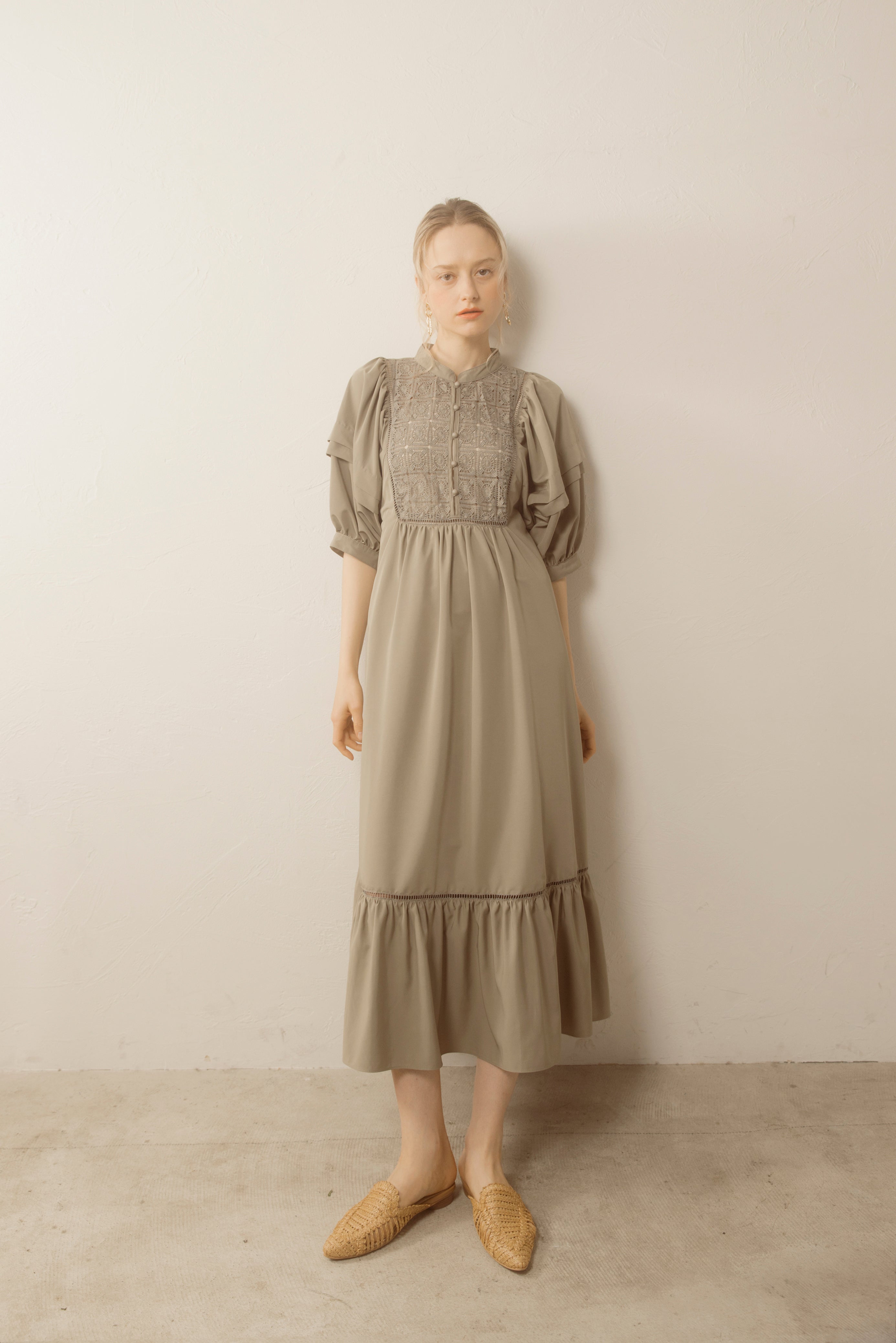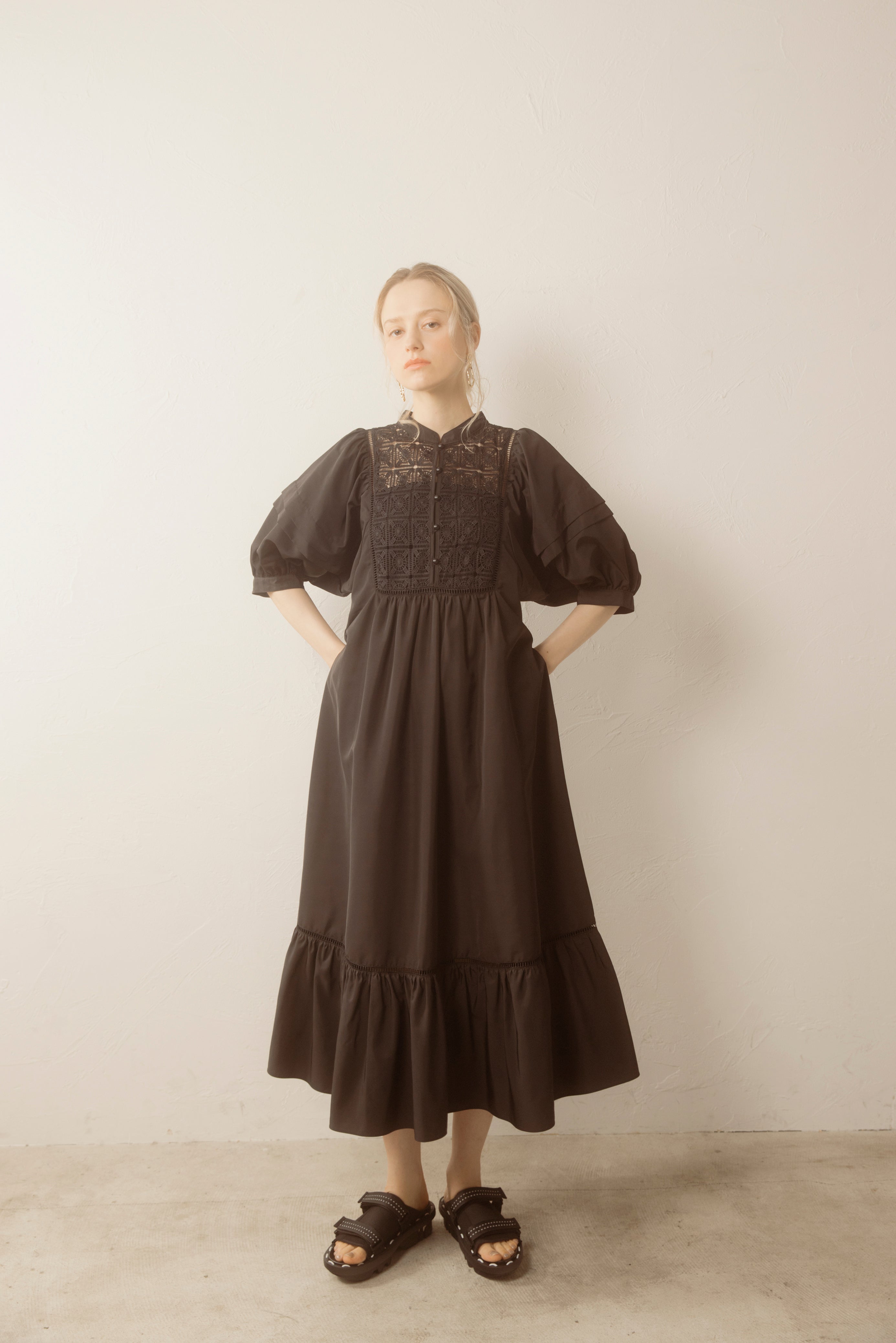デコルテとティアード切り替え部分のはしごレースの透け感がさりげない肌見せがを演出してくれます。