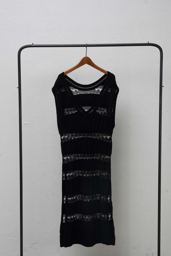 質感の異なる二種類の糸を組み合わせたレース見えの透かし編みがポイントになった異素材ロングニットベスト。