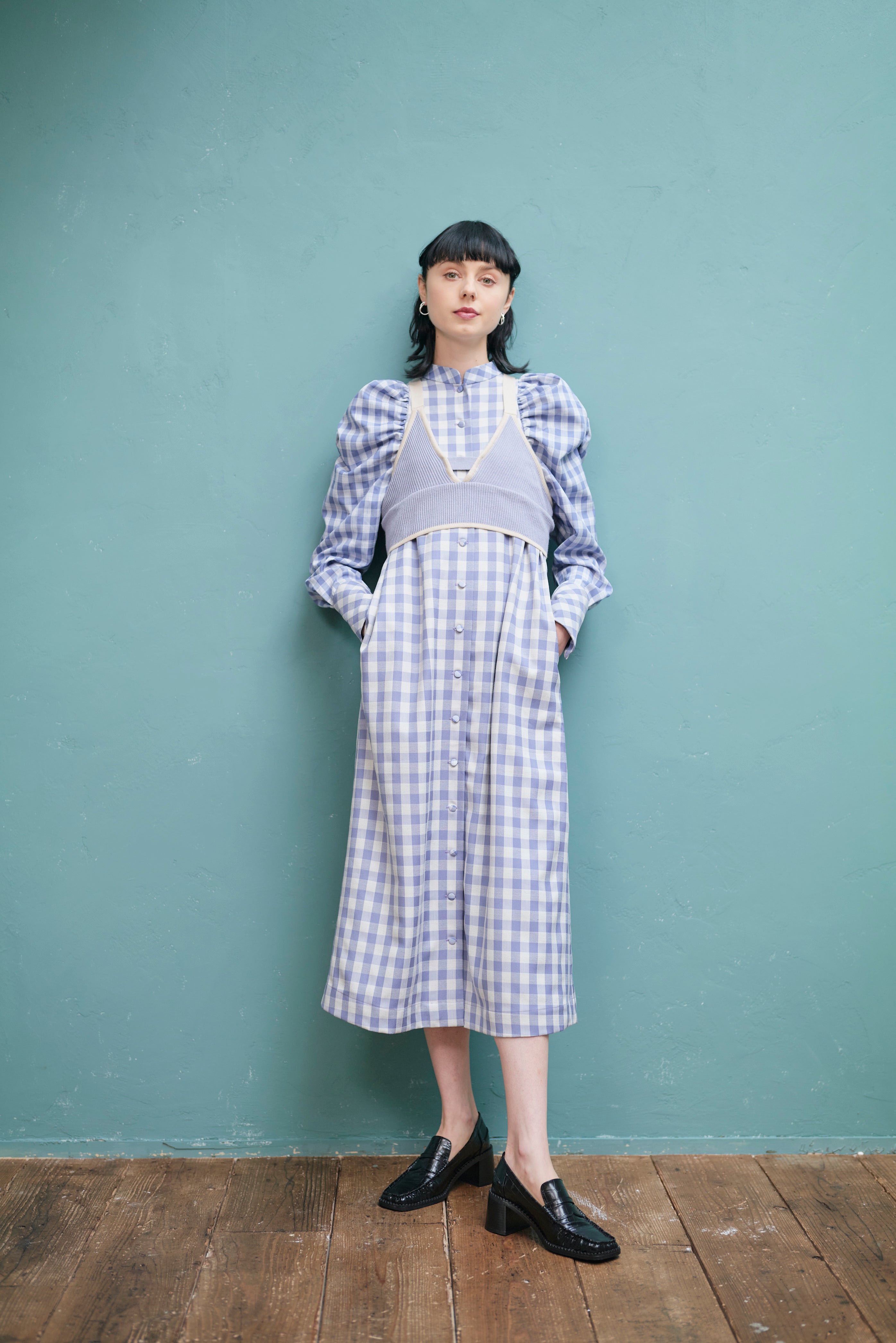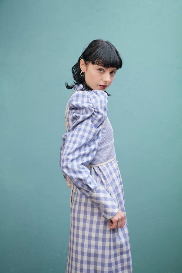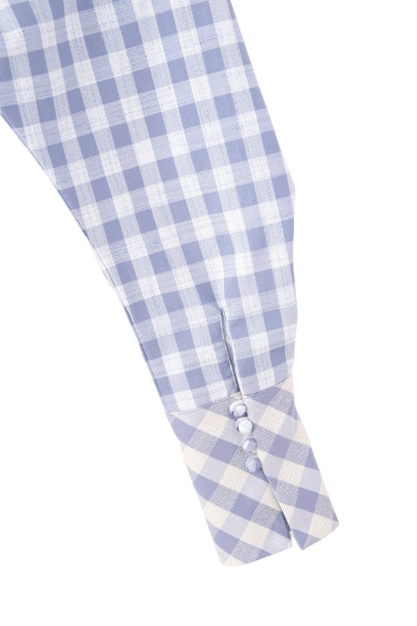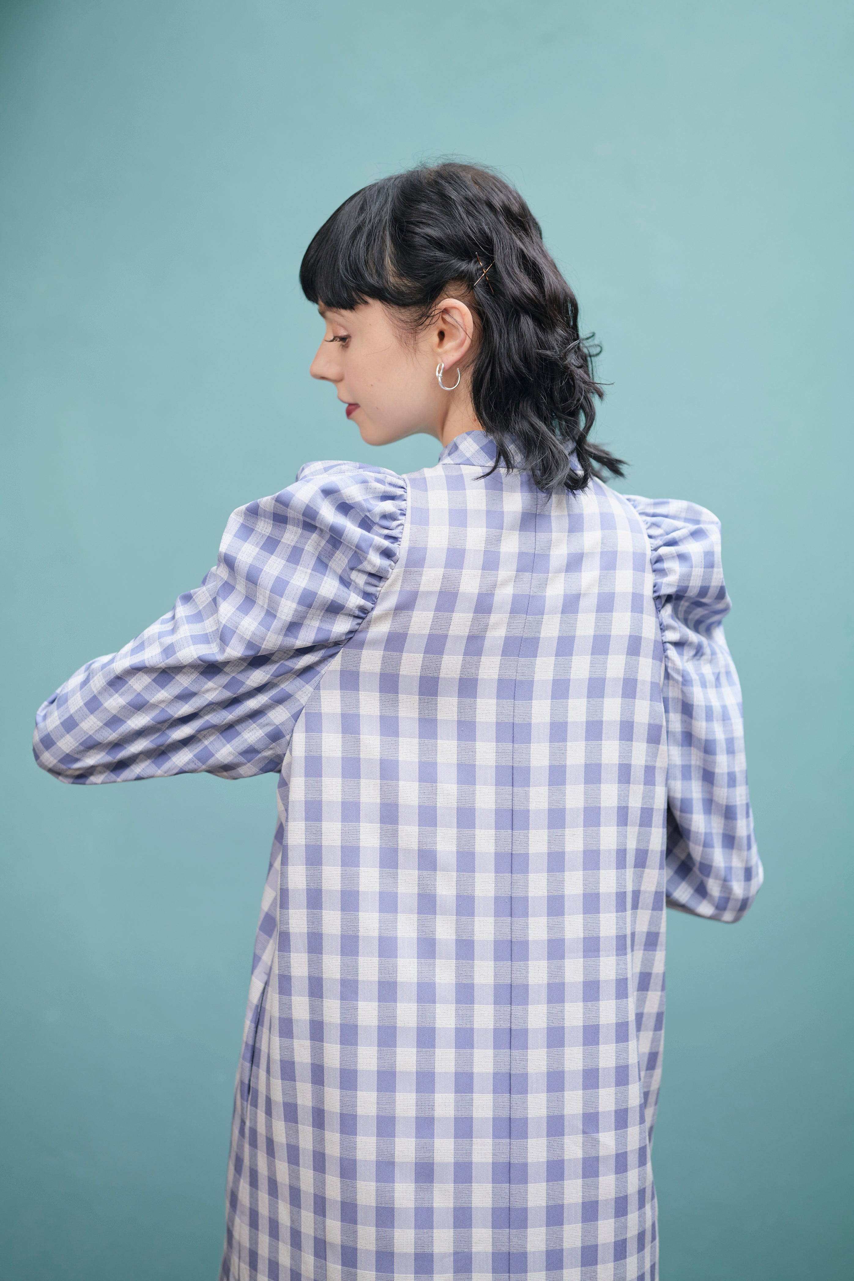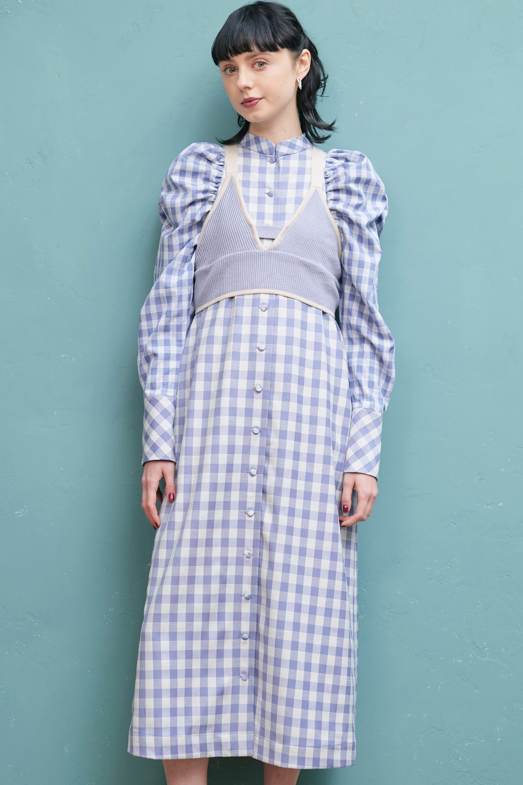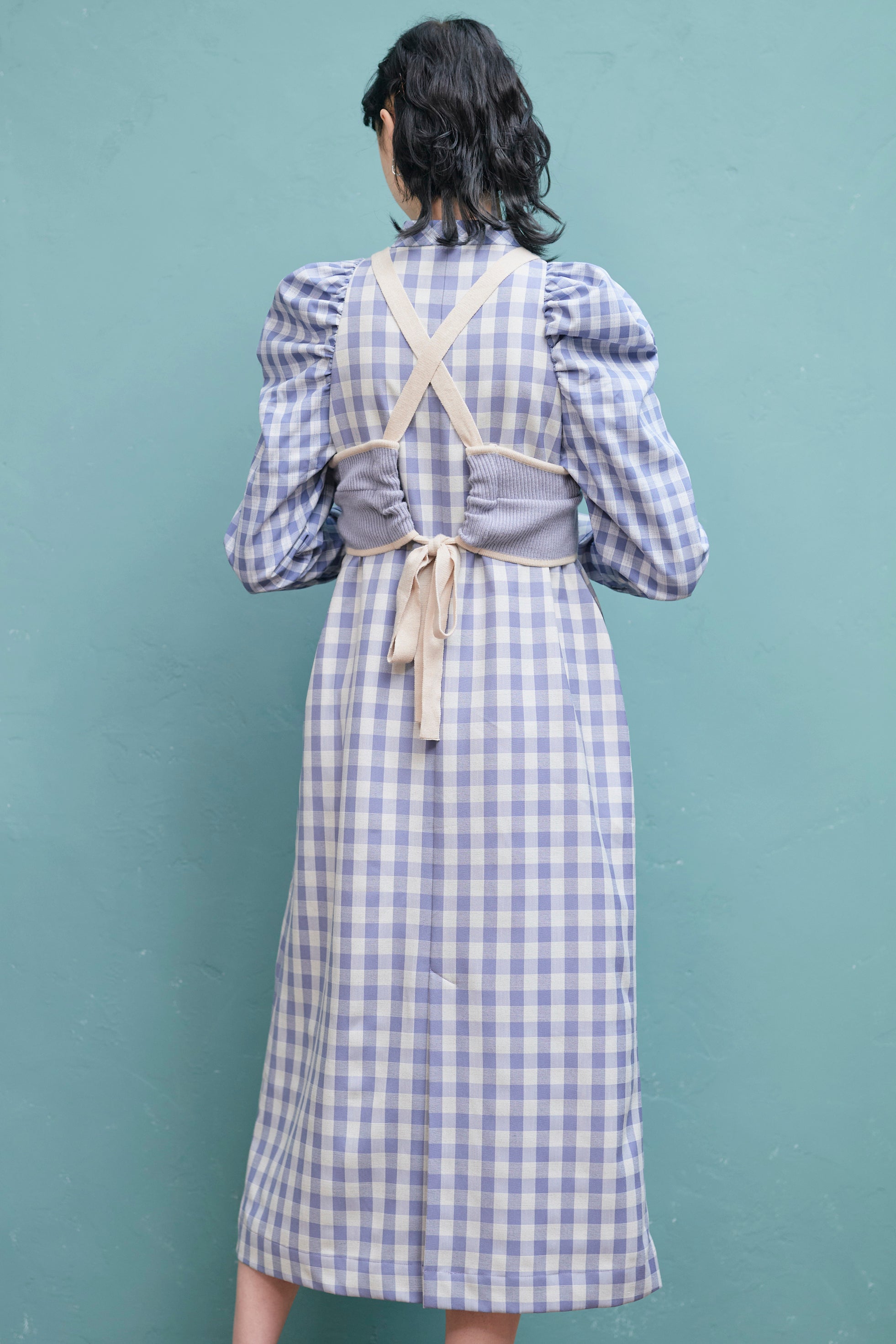 大きいさの違う2種類のギンガムチェックを使用したワンピース。