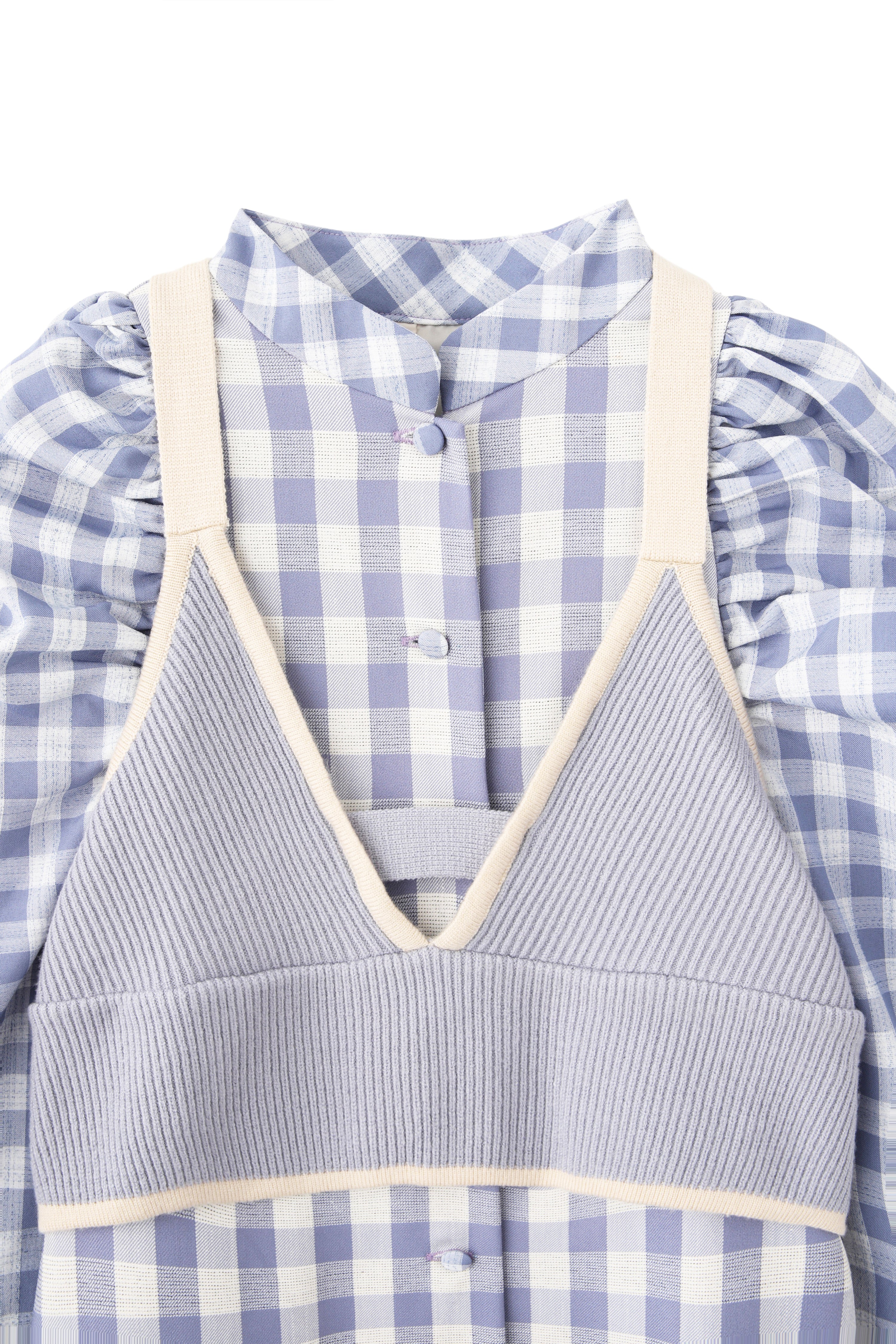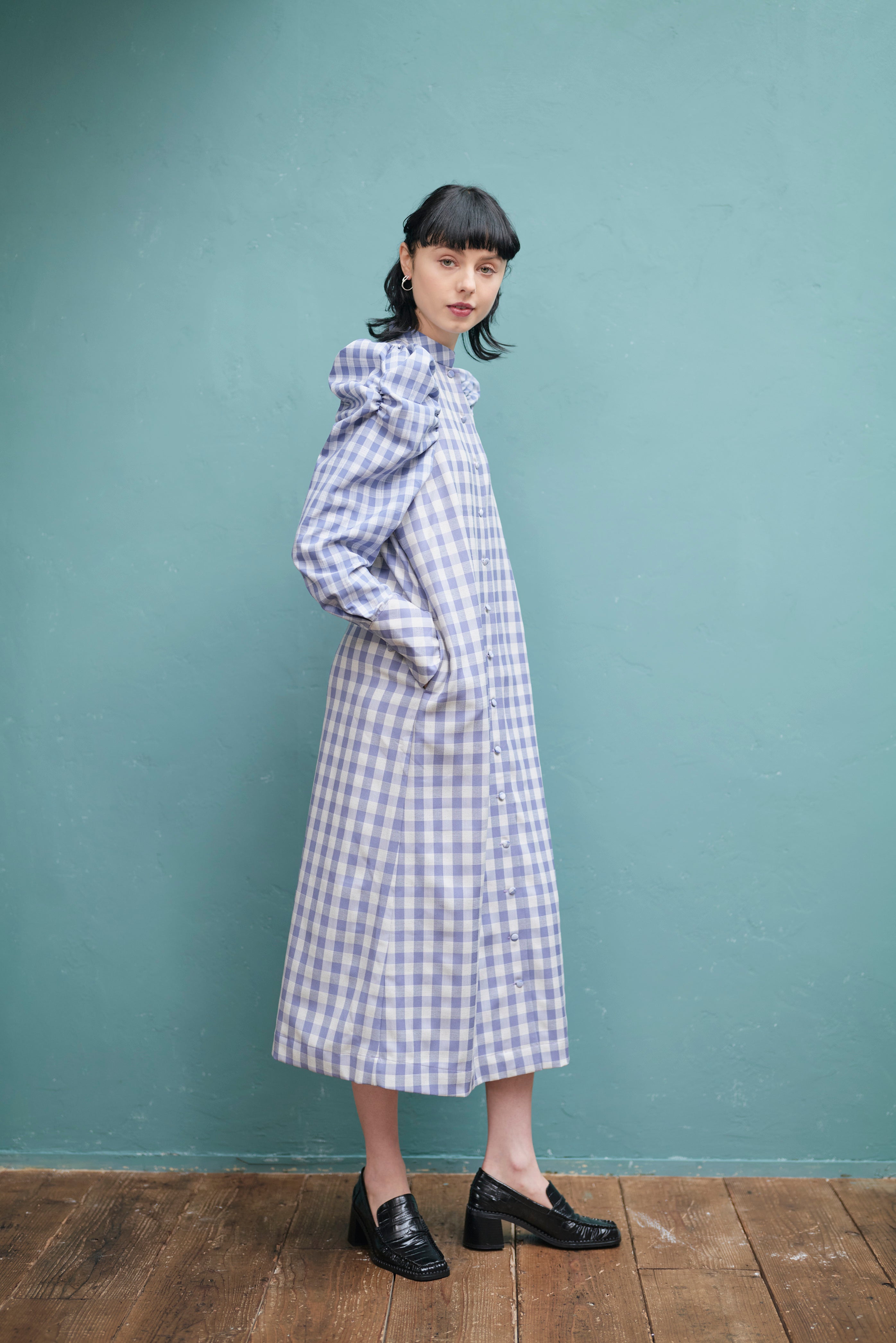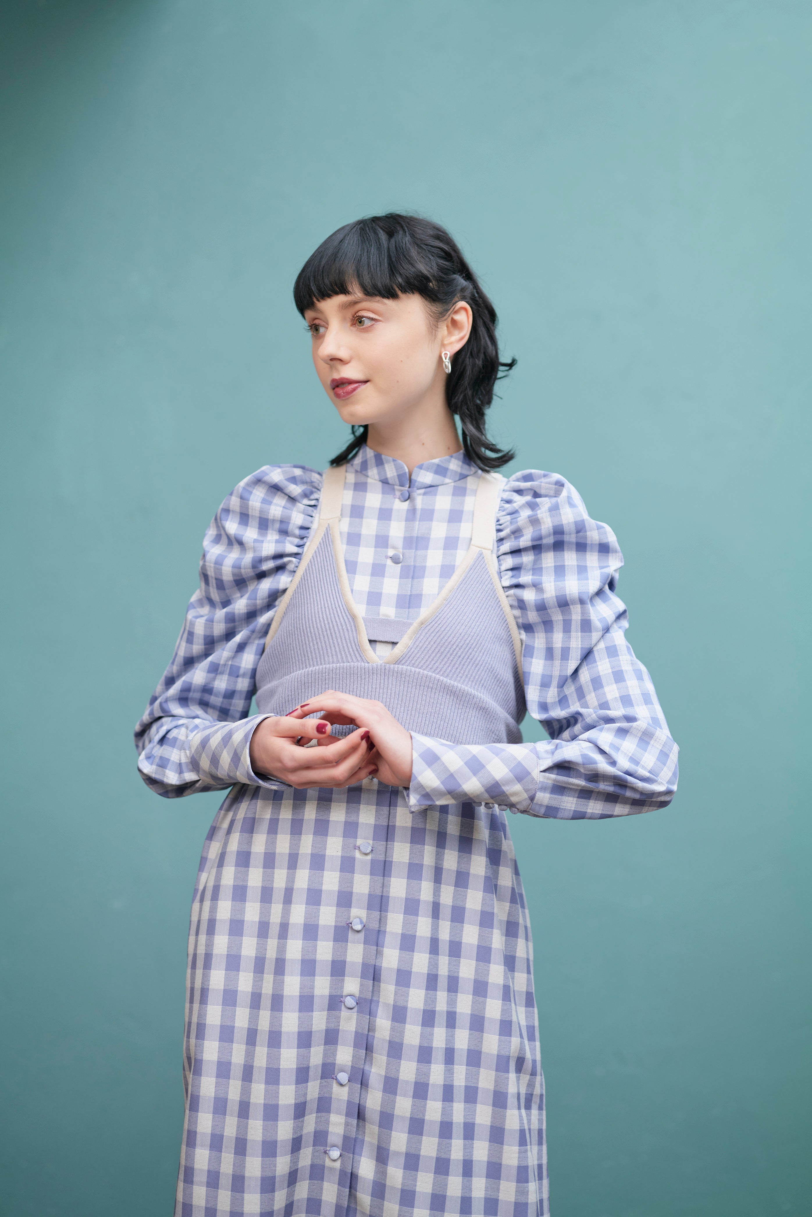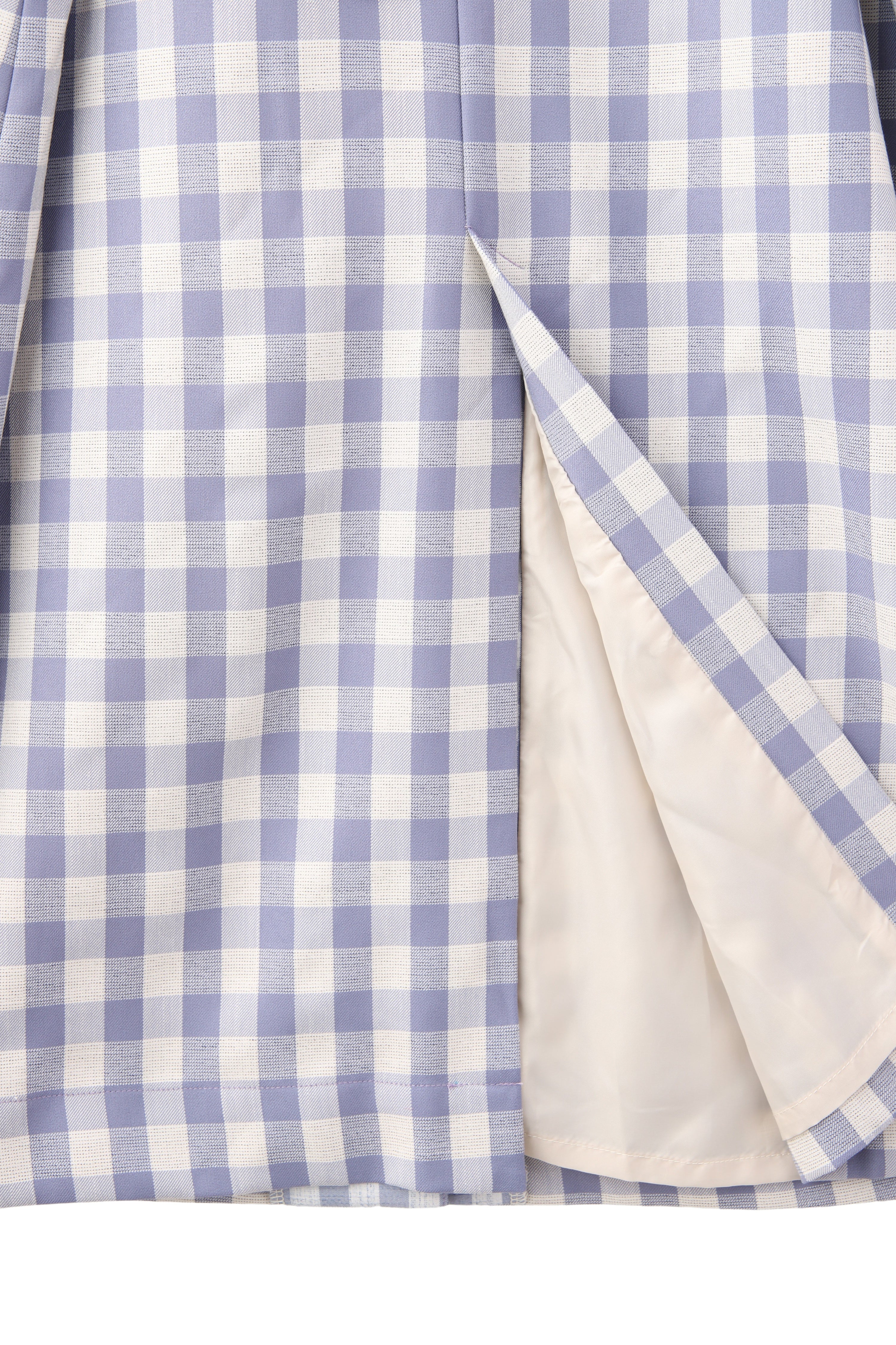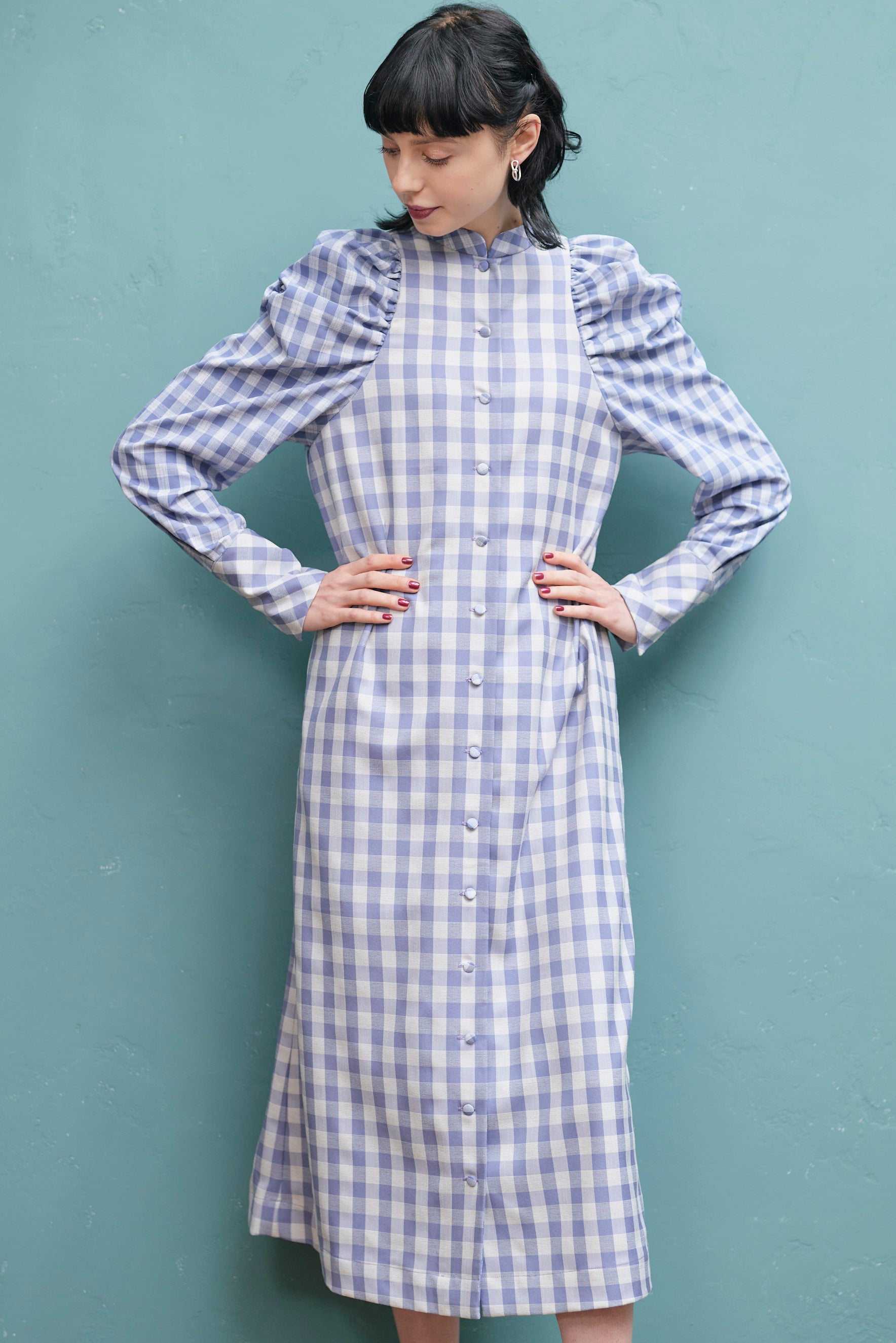 大きいさの違う2種類のギンガムチェックを使用したワンピース。