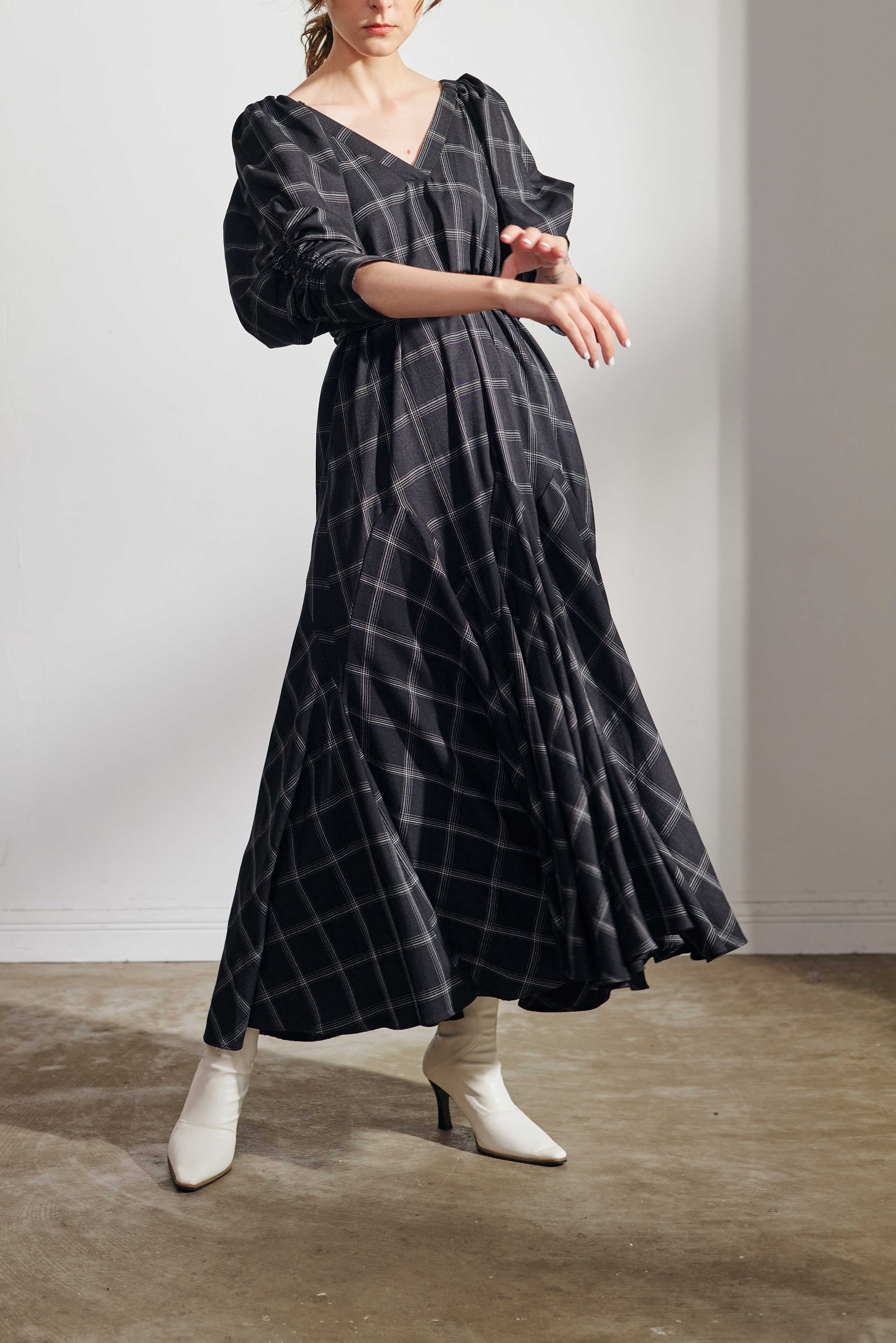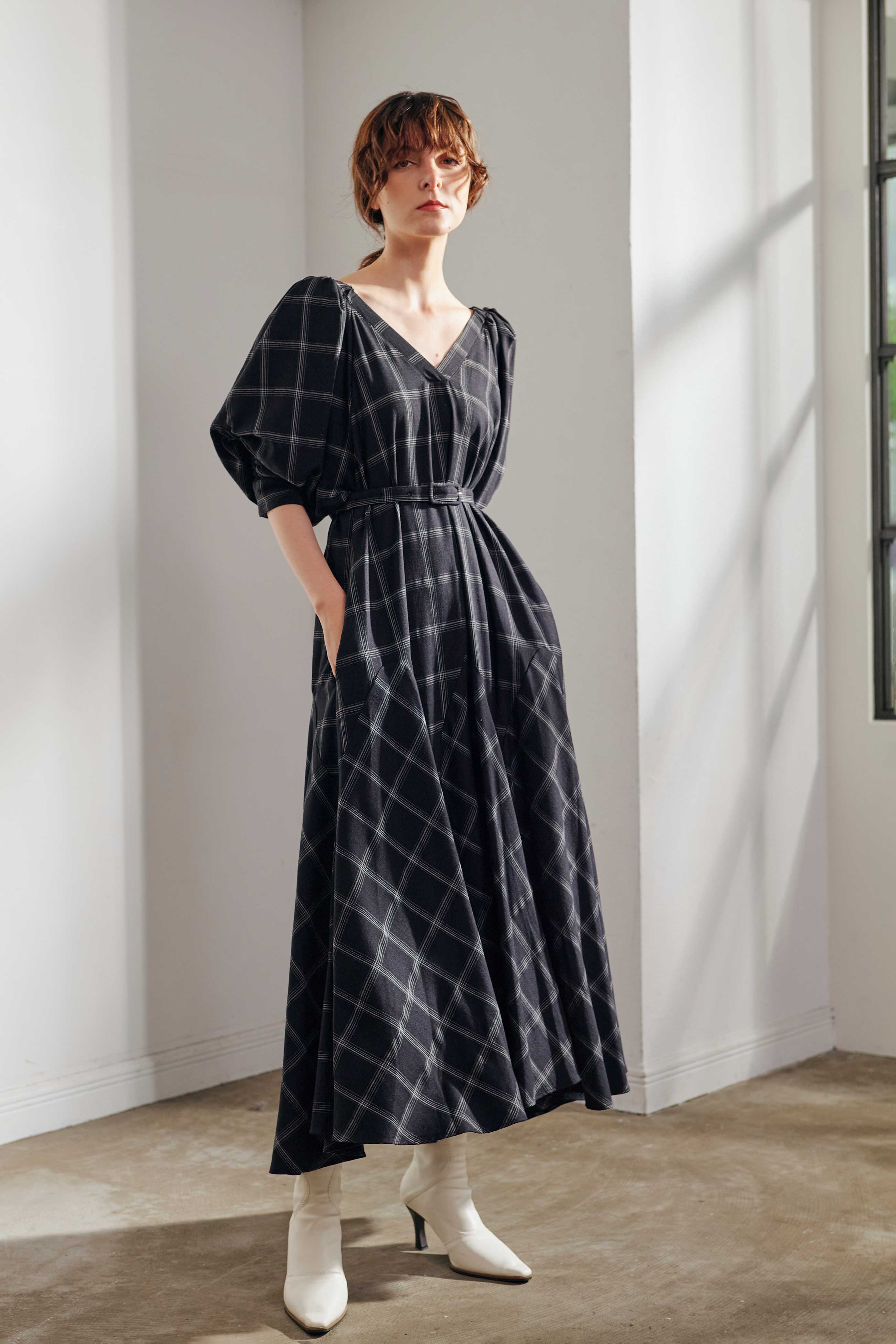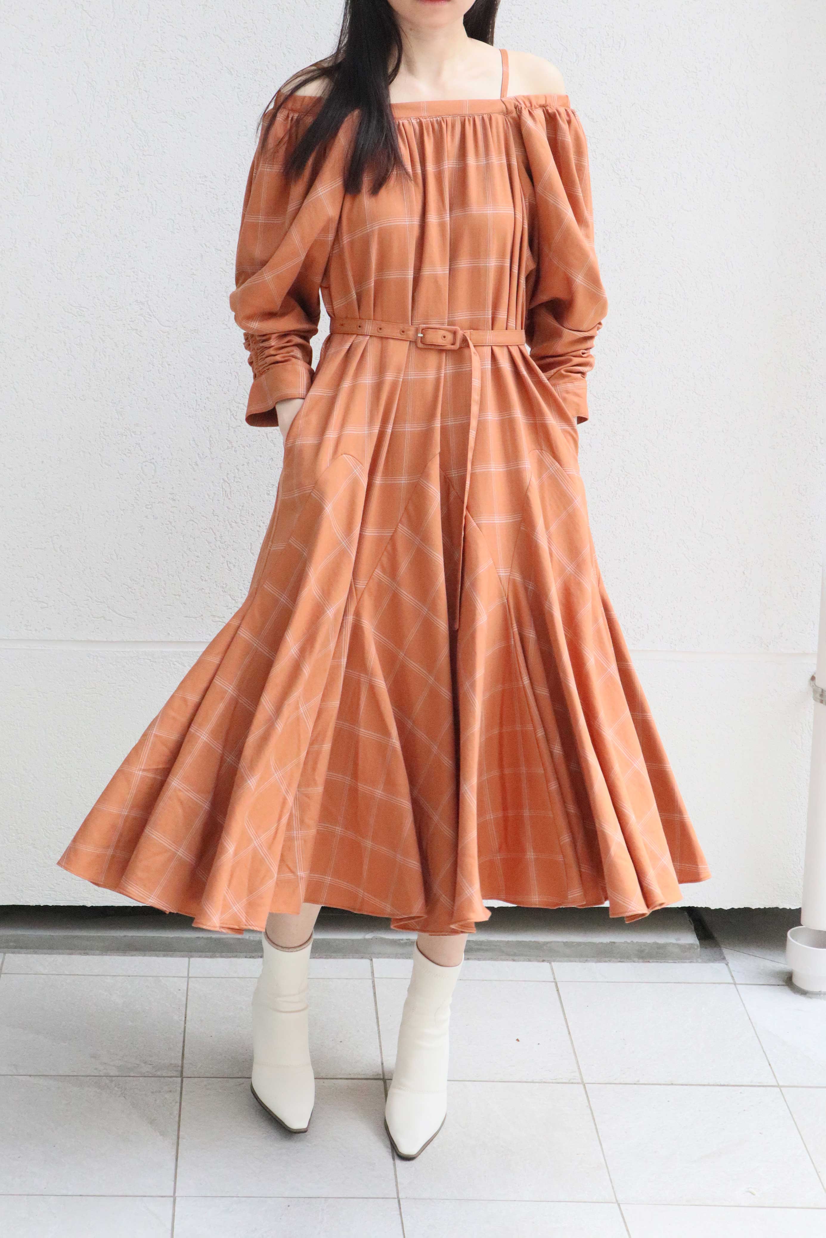 腰回りはフィットしつつも裾にたっぷりと分量感をもってくることで、上はストン、下はたっぷりフレアでスタイルアップがかないます。