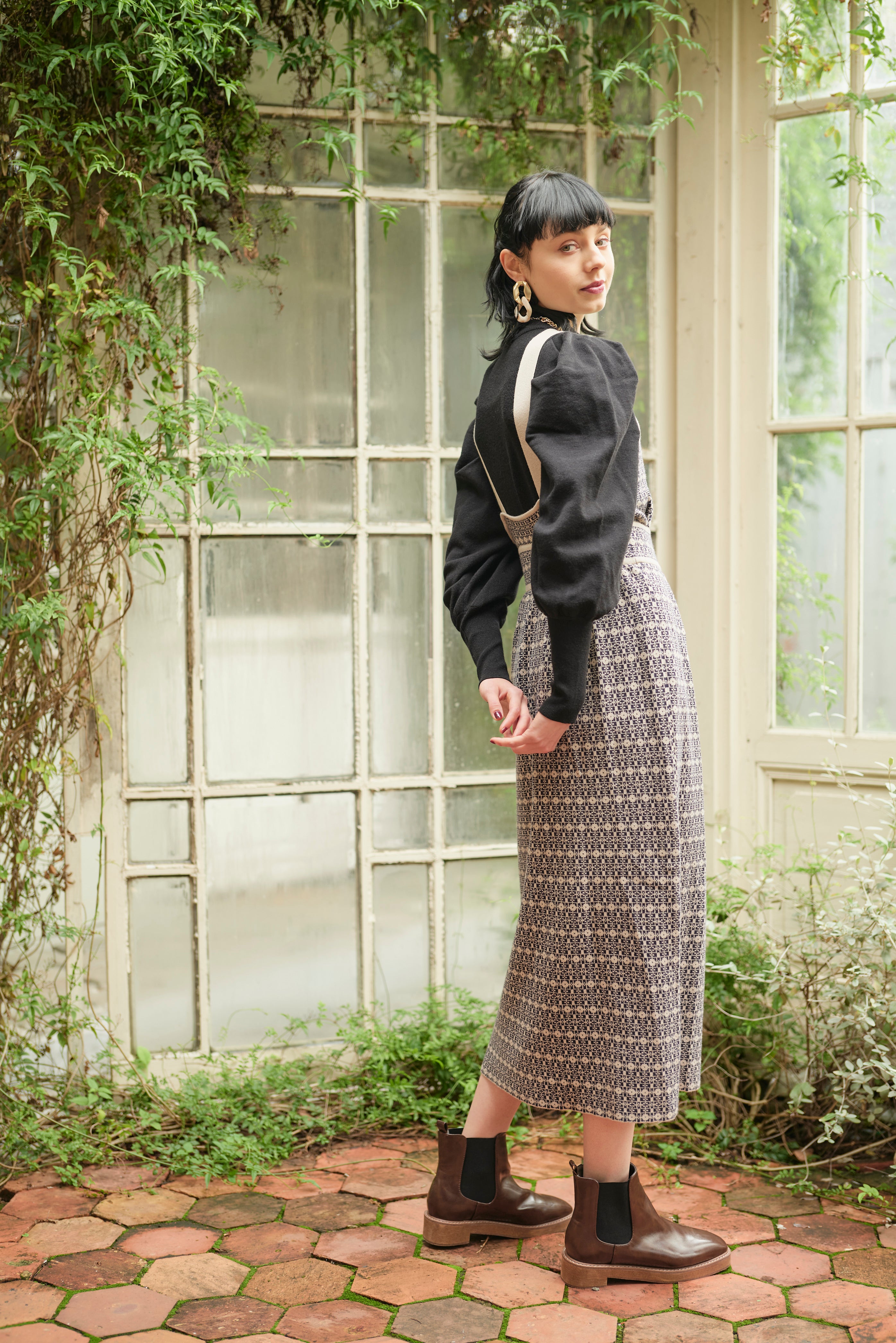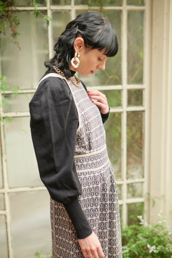 格子総柄のニットジャンパースカートと