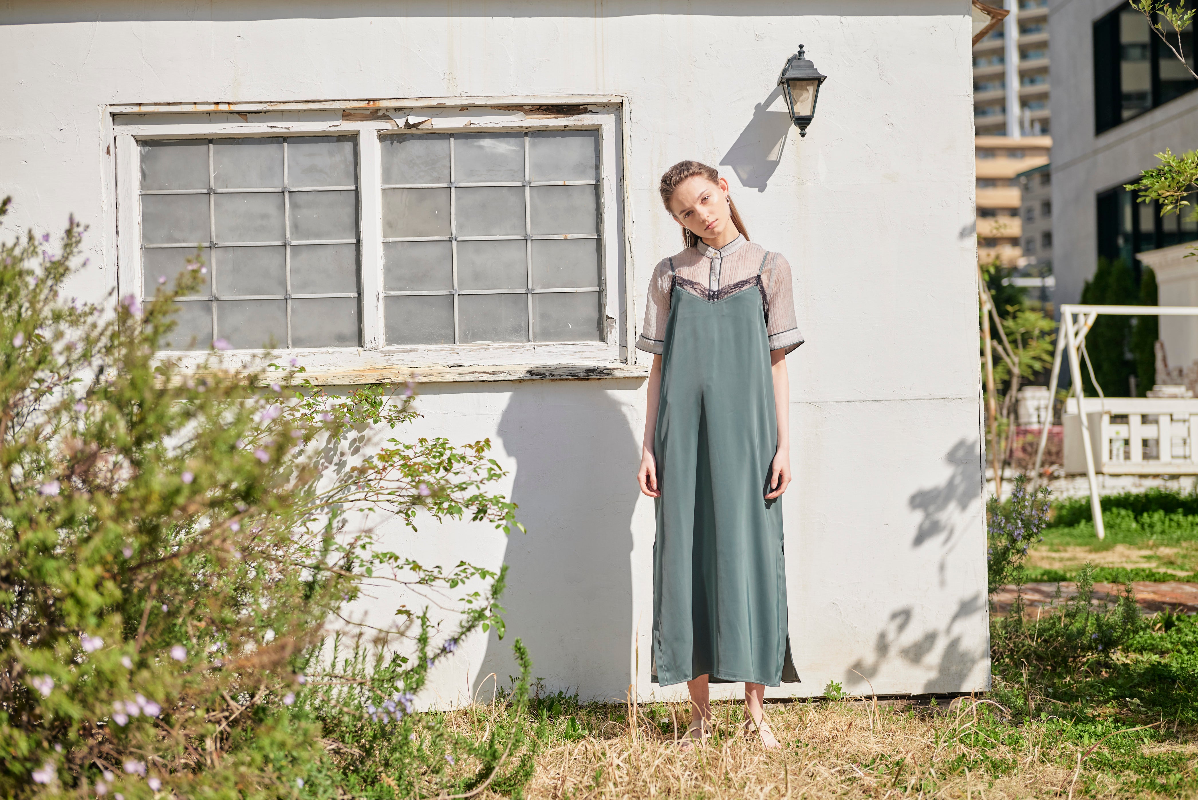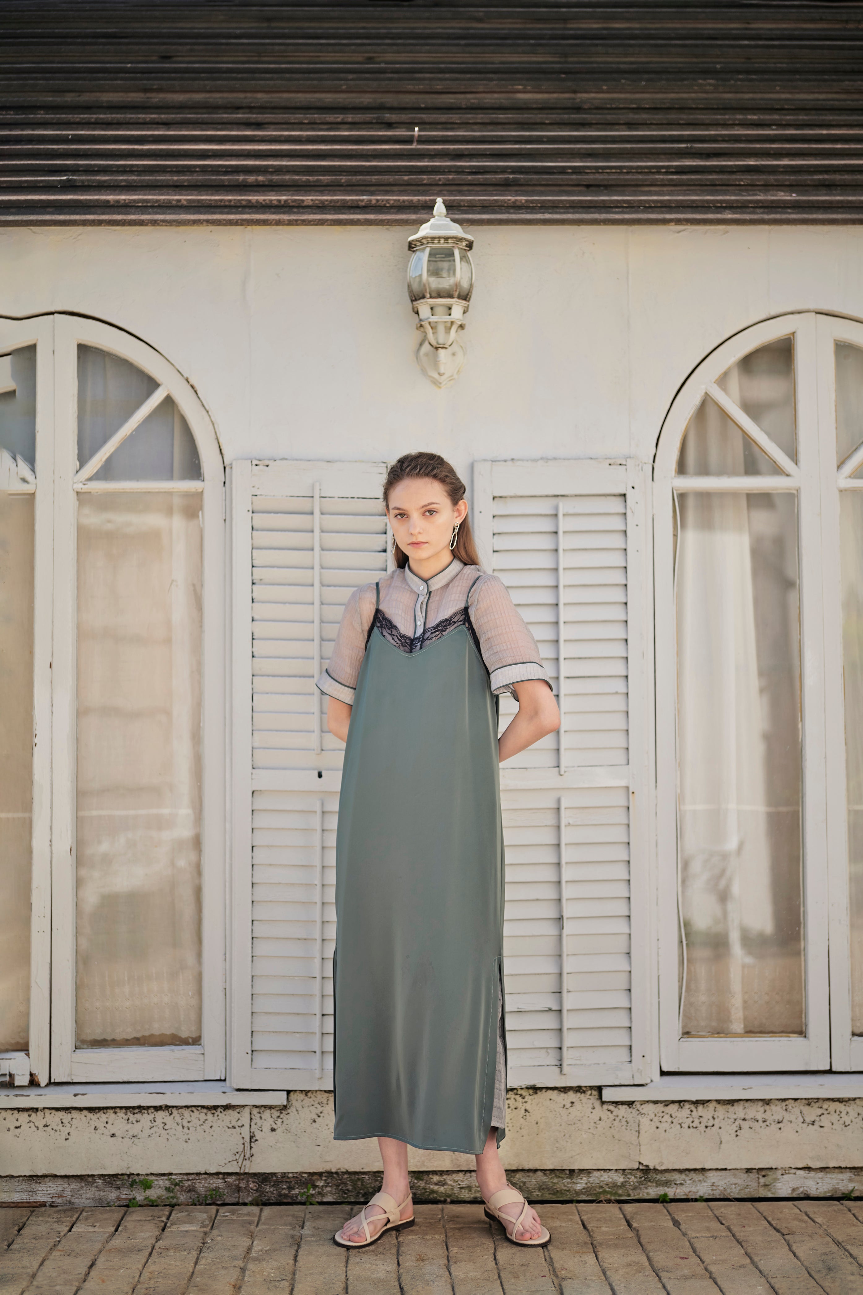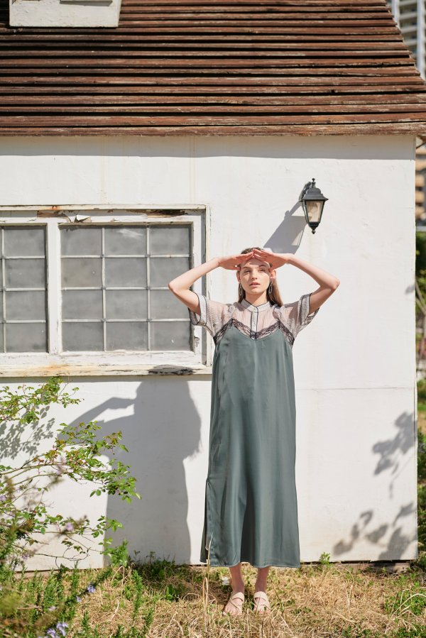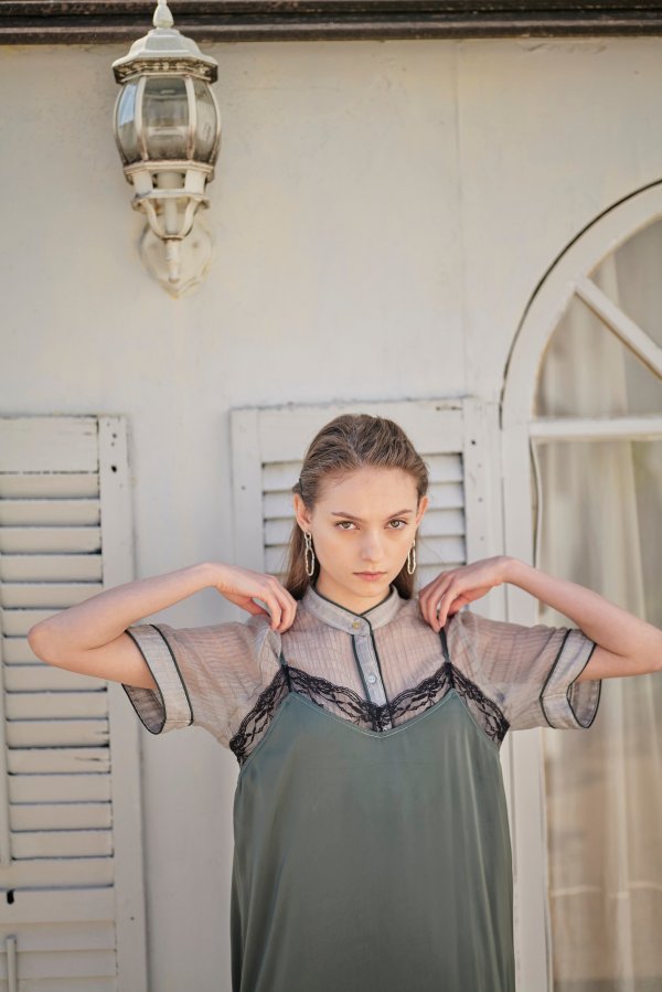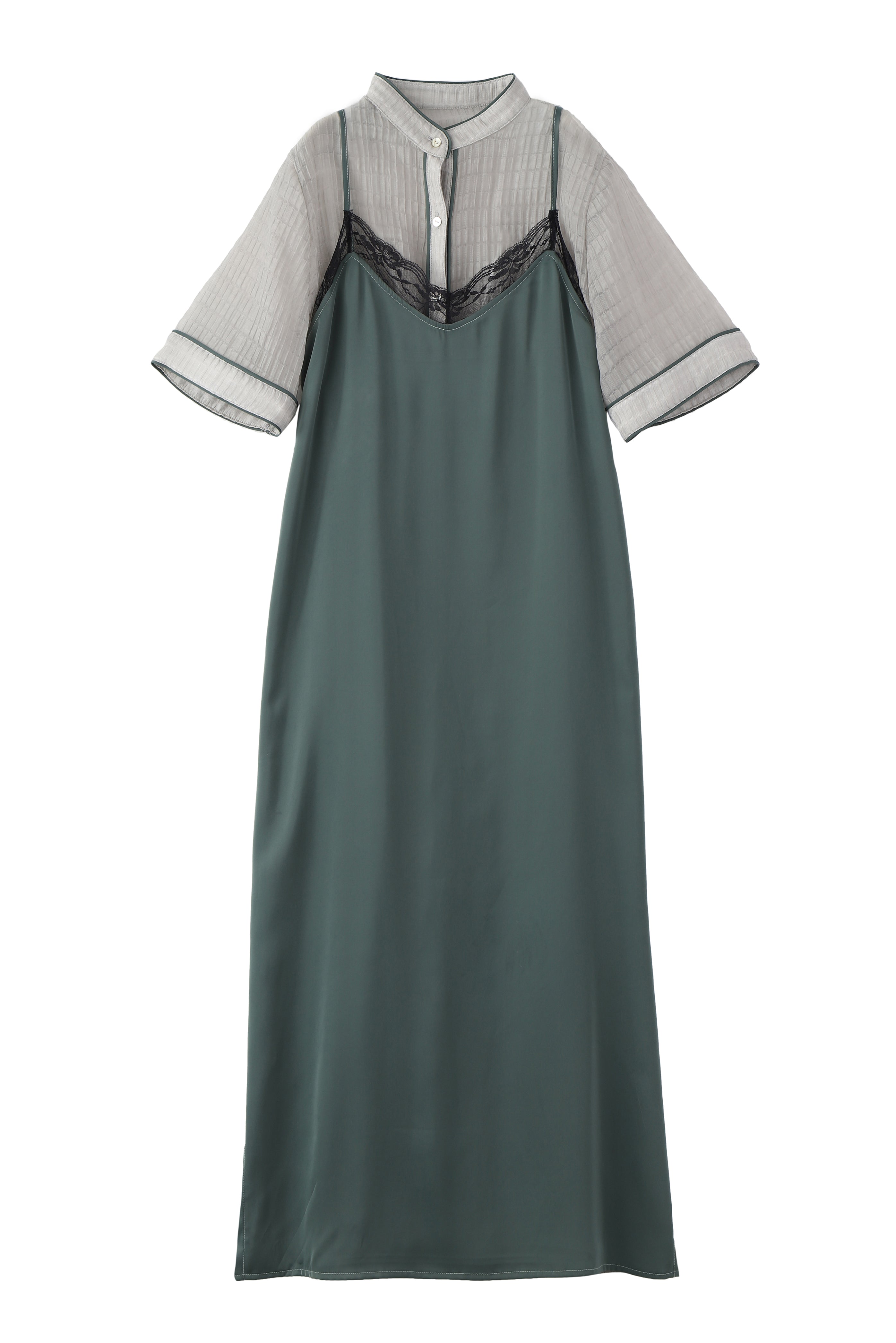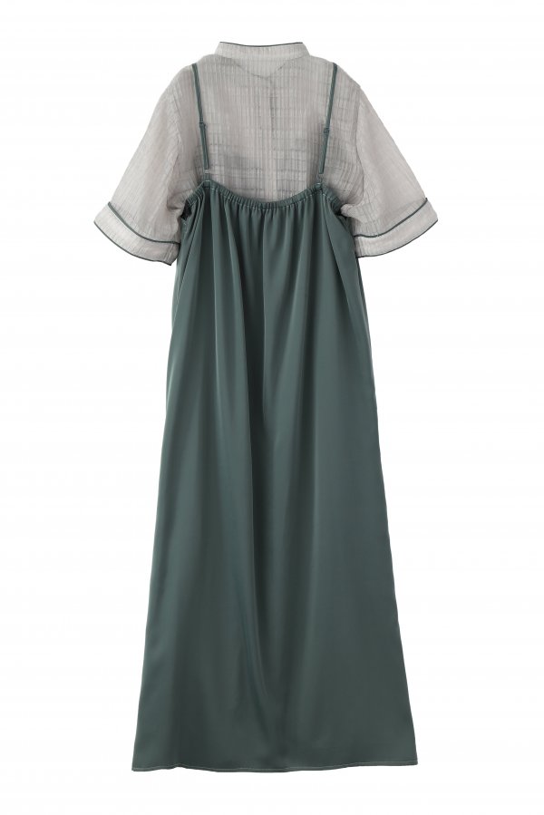 - レースxスムースサテンレイヤードキャミワンピ