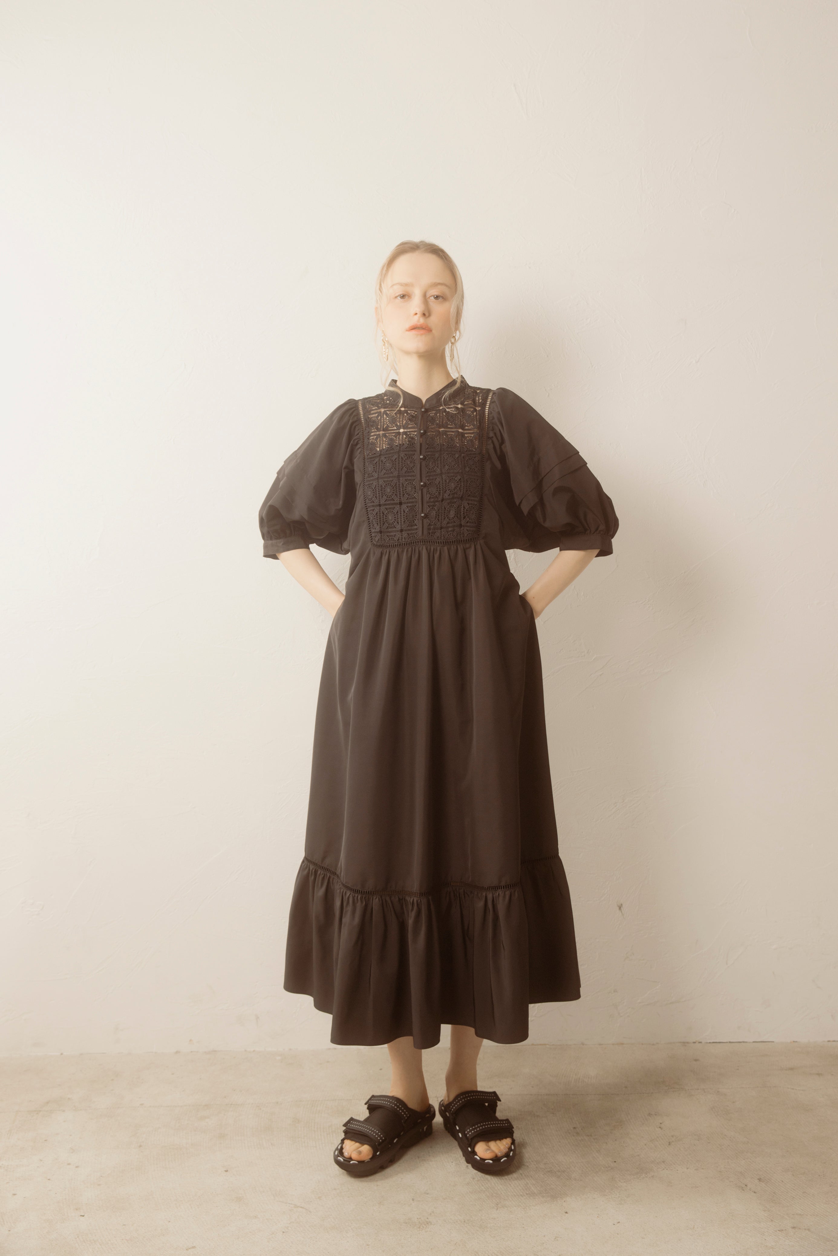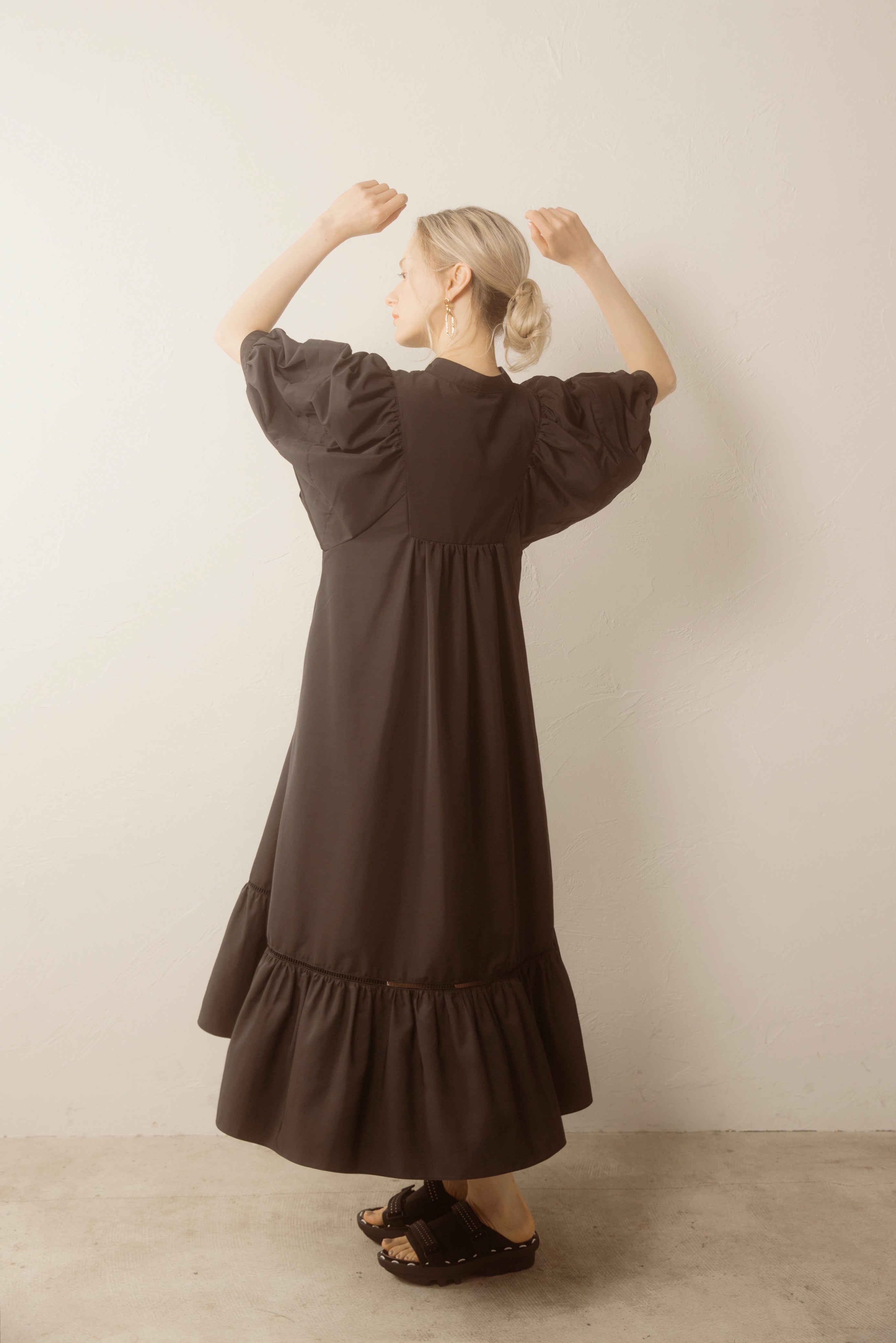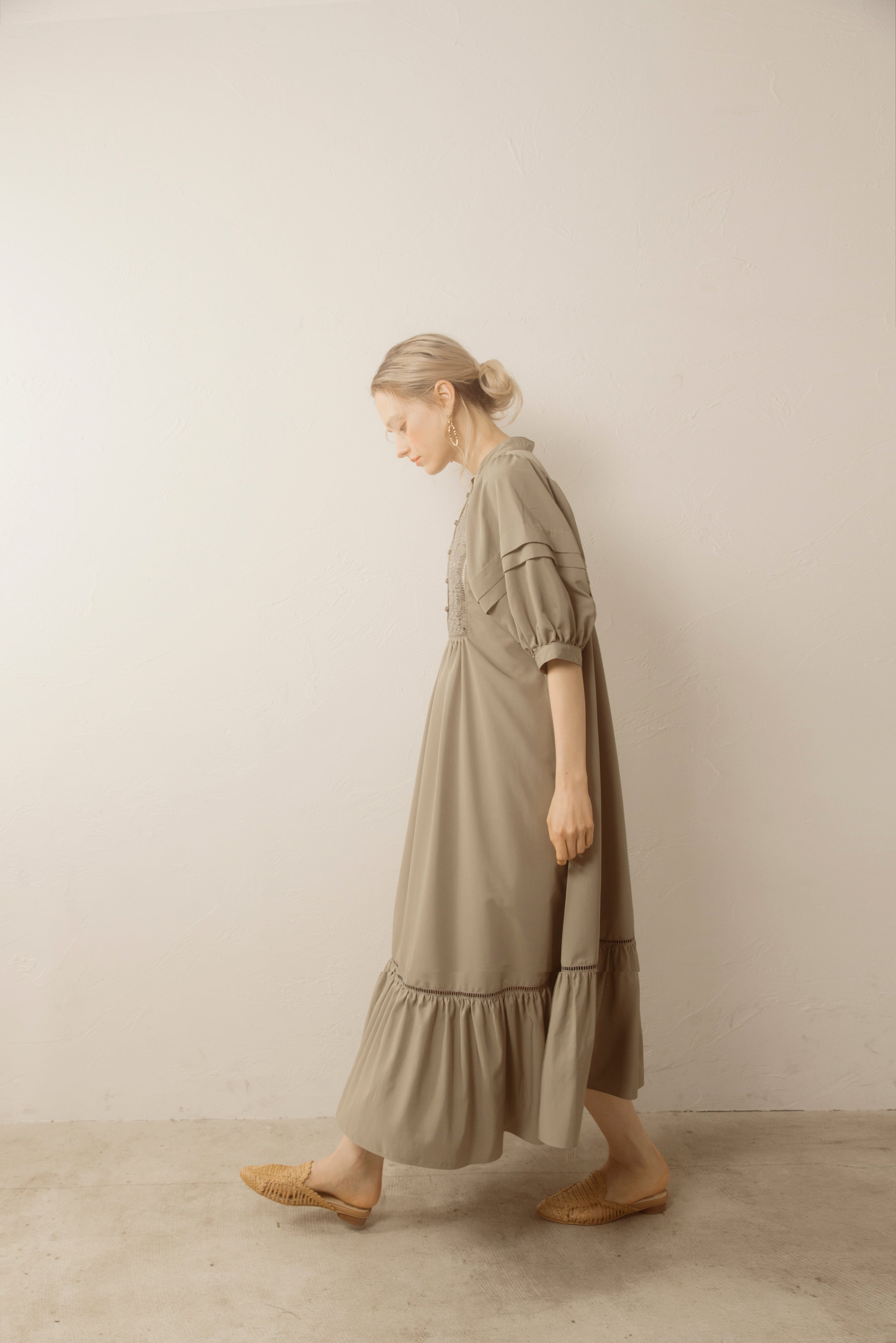 デコルテとティアード切り替え部分のはしごレースの透け感がさりげない肌見せがを演出してくれます。