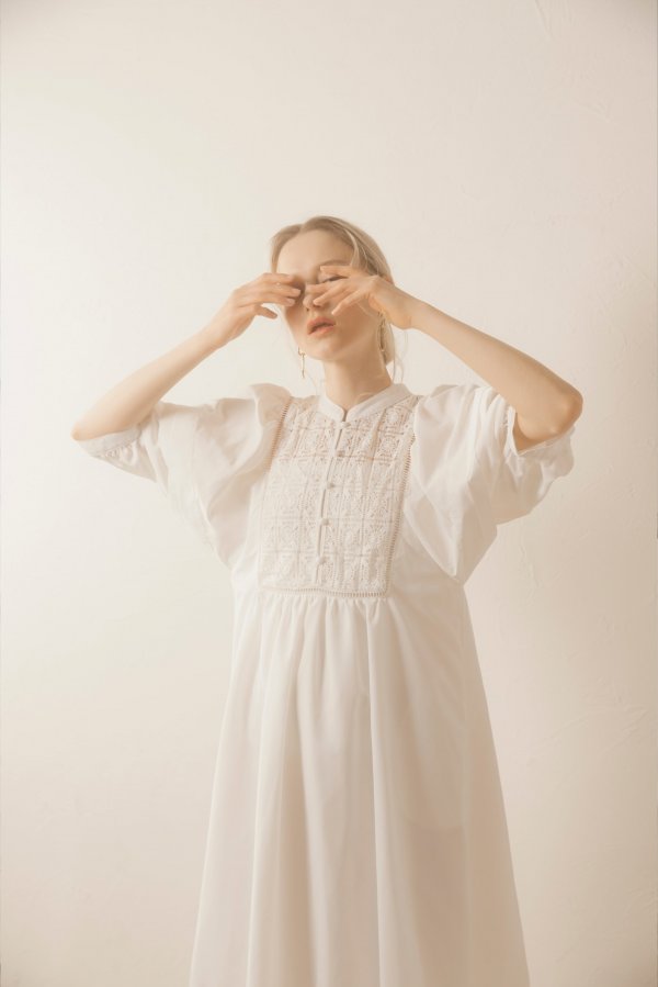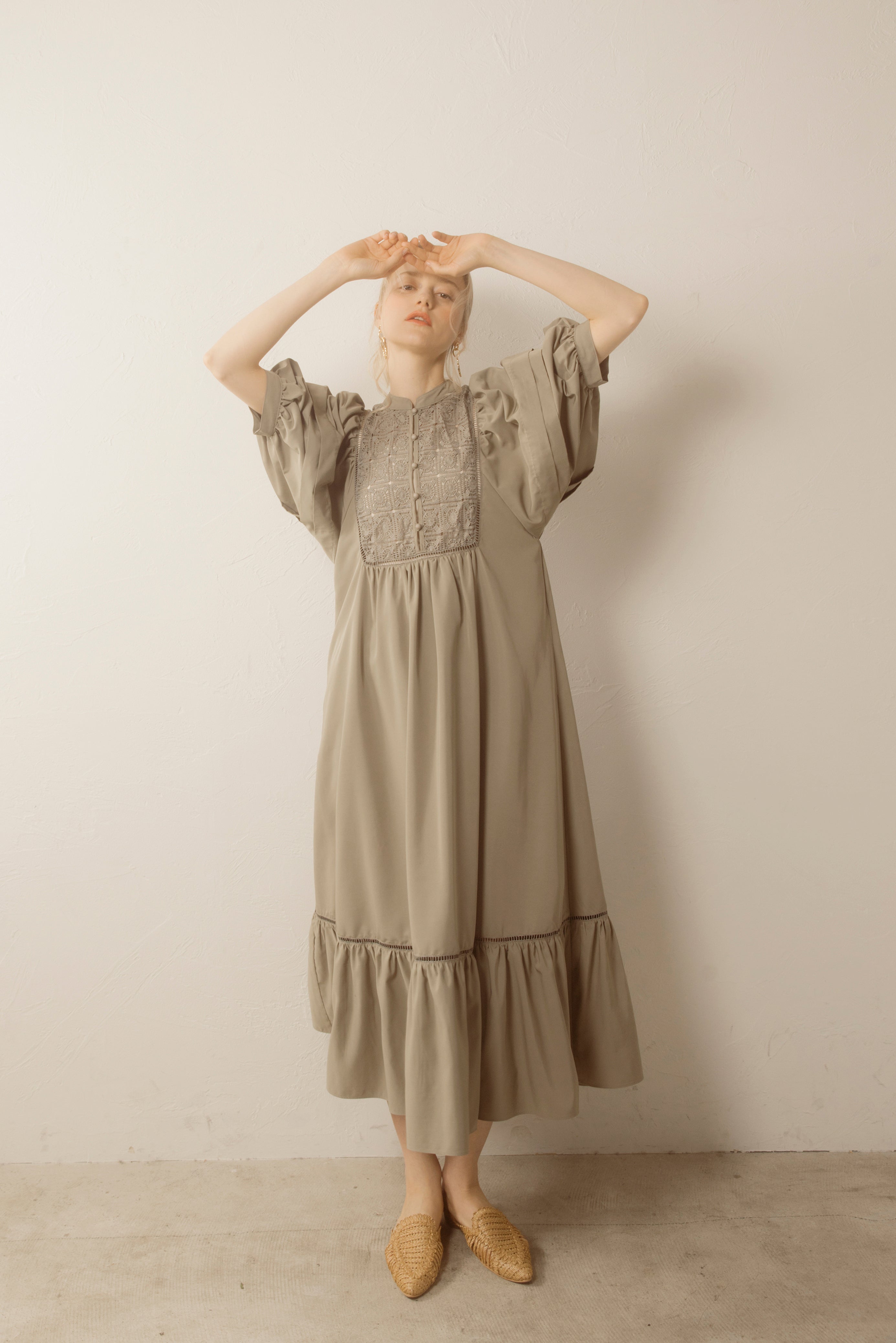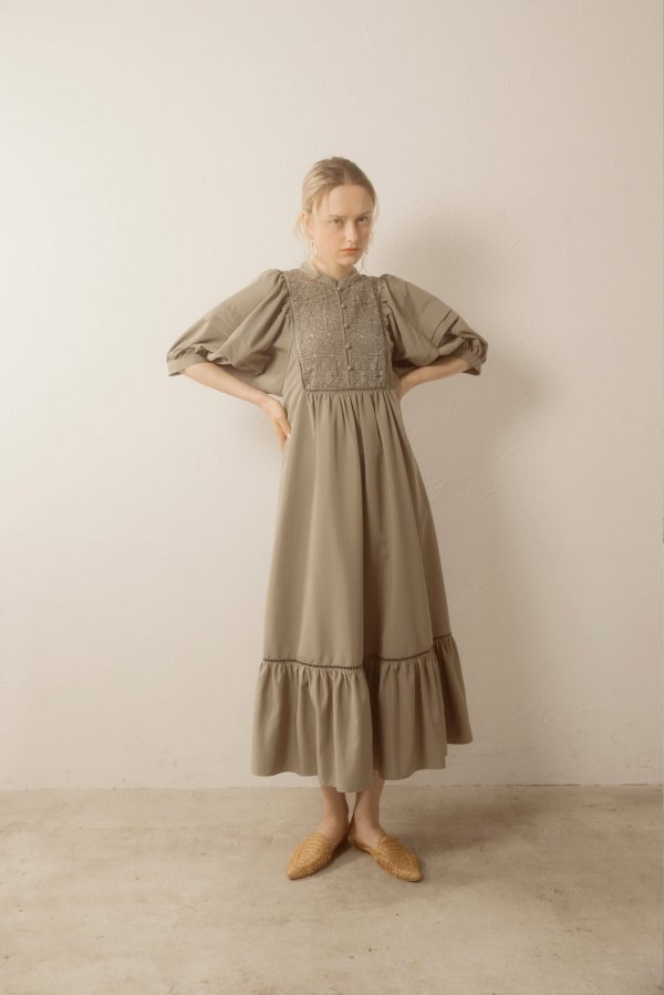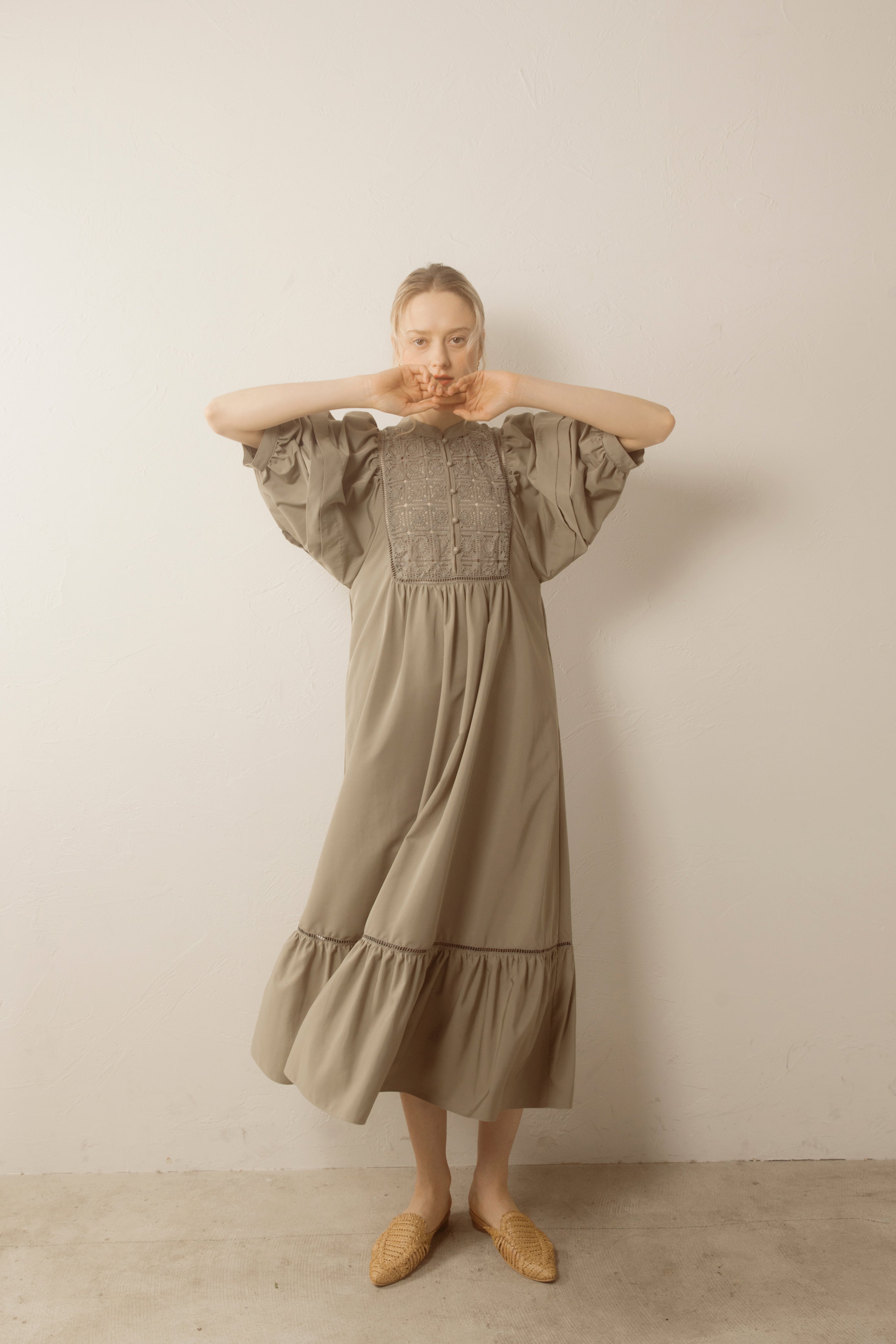 デコルテとティアード切り替え部分のはしごレースの透け感がさりげない肌見せがを演出してくれます。