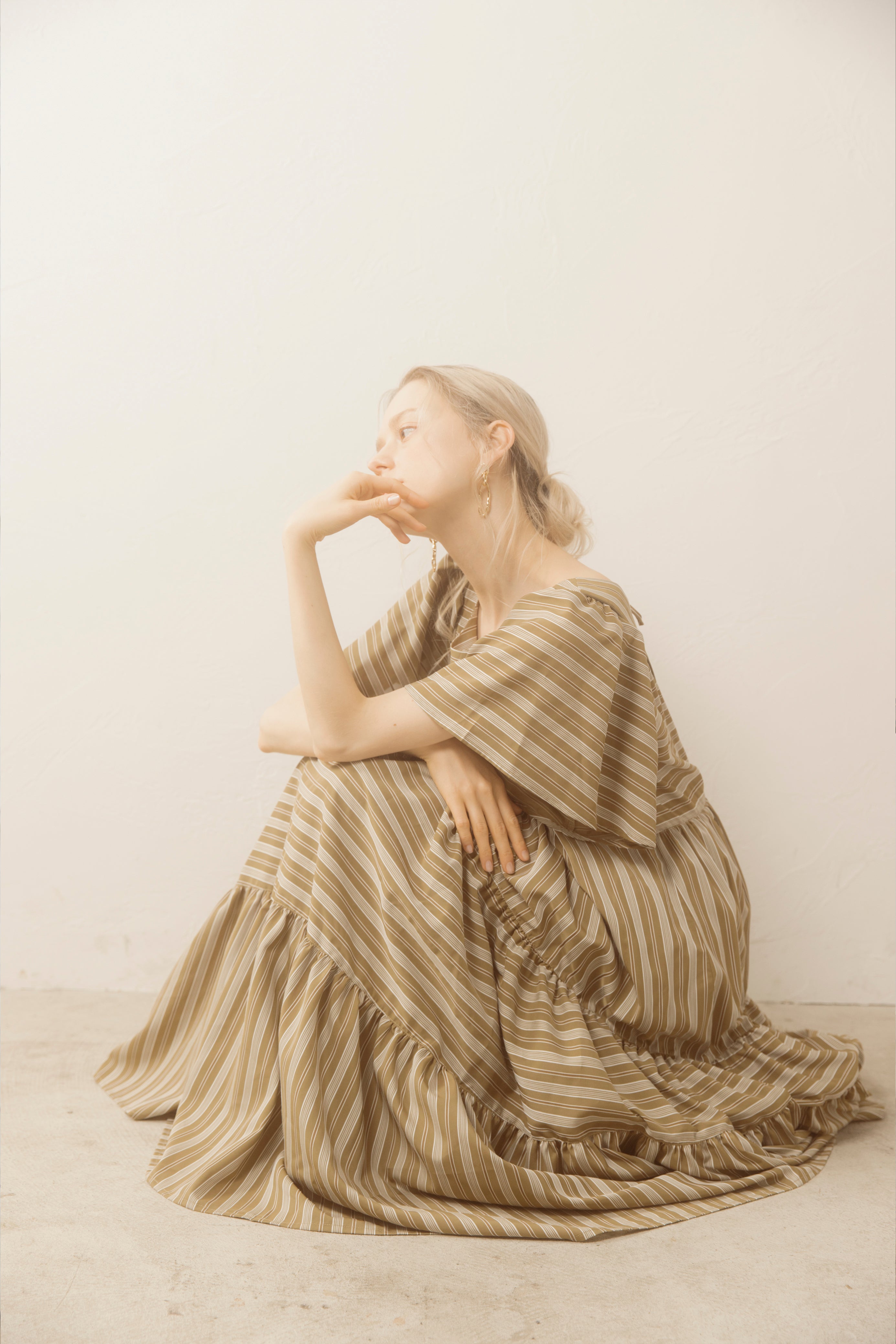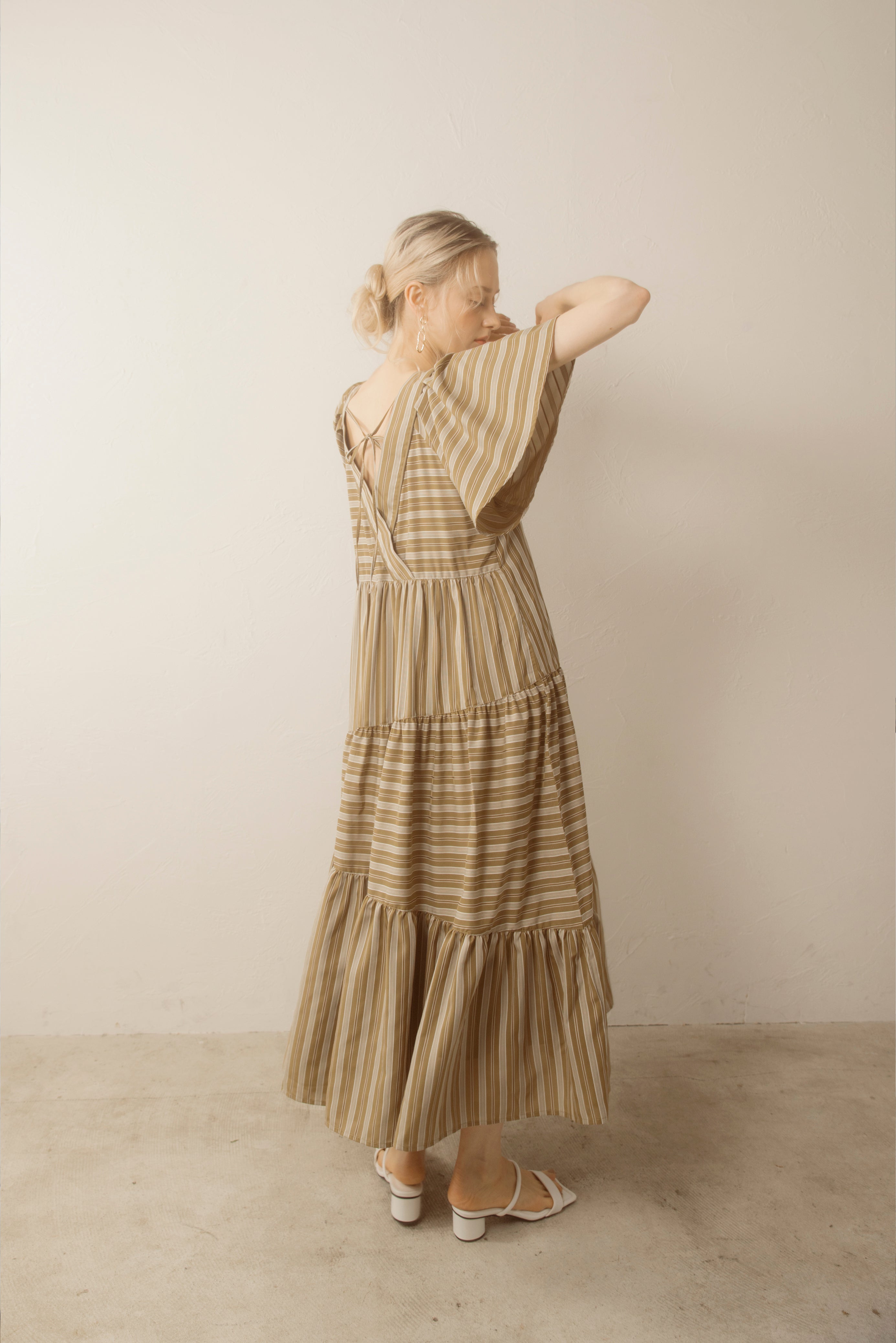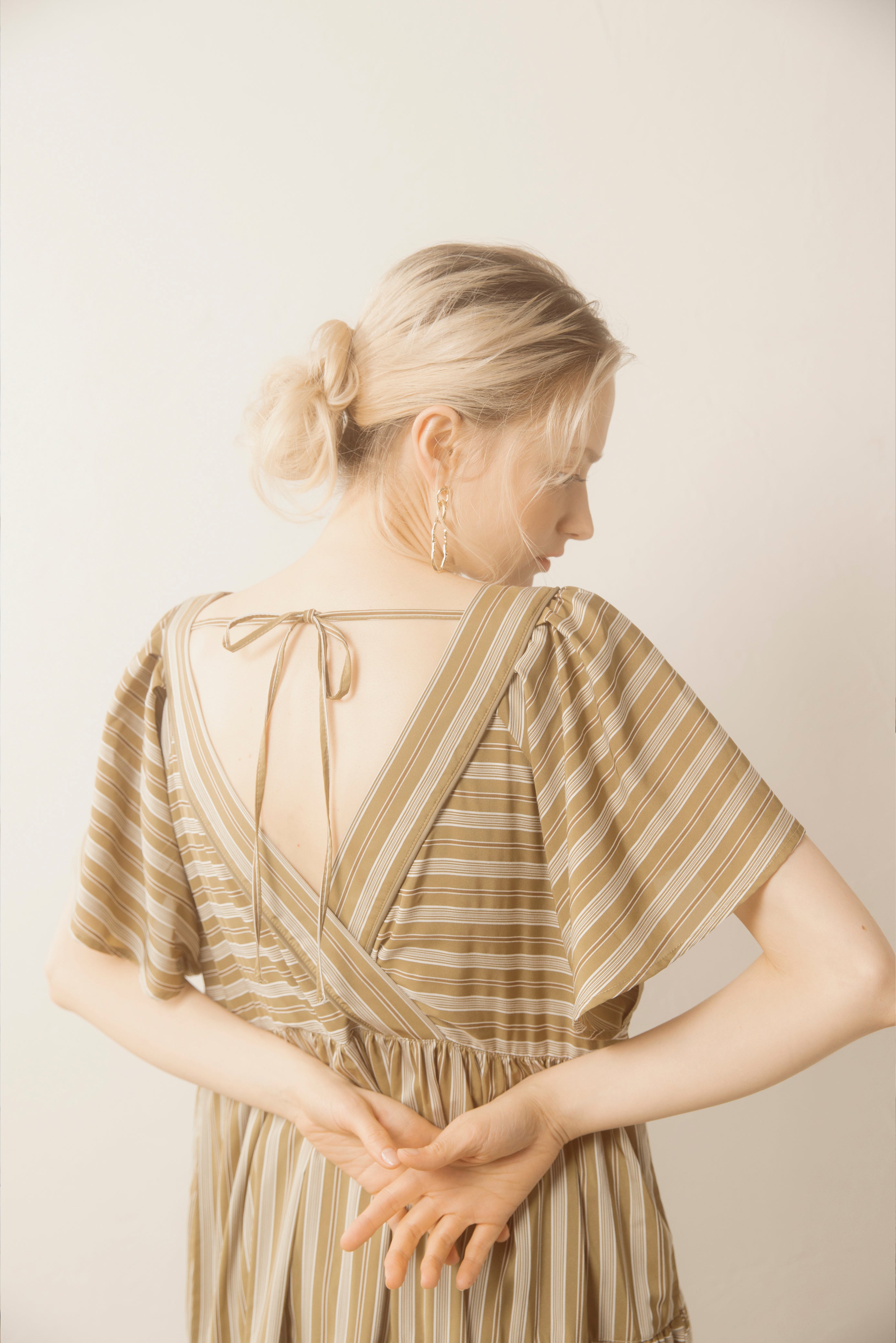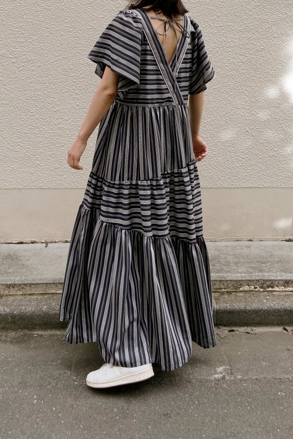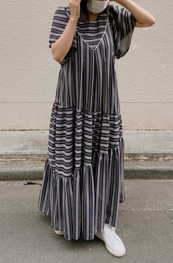 ストライプ生地に細いコードパイピングのカラーコントラストをアクセントにした前後着用が可能な嬉しい仕様のサンドレス。