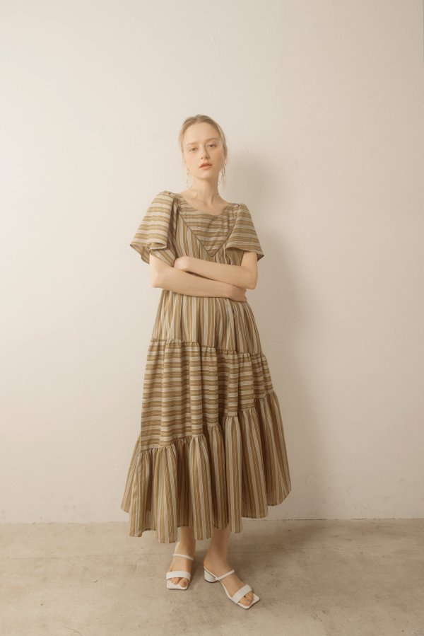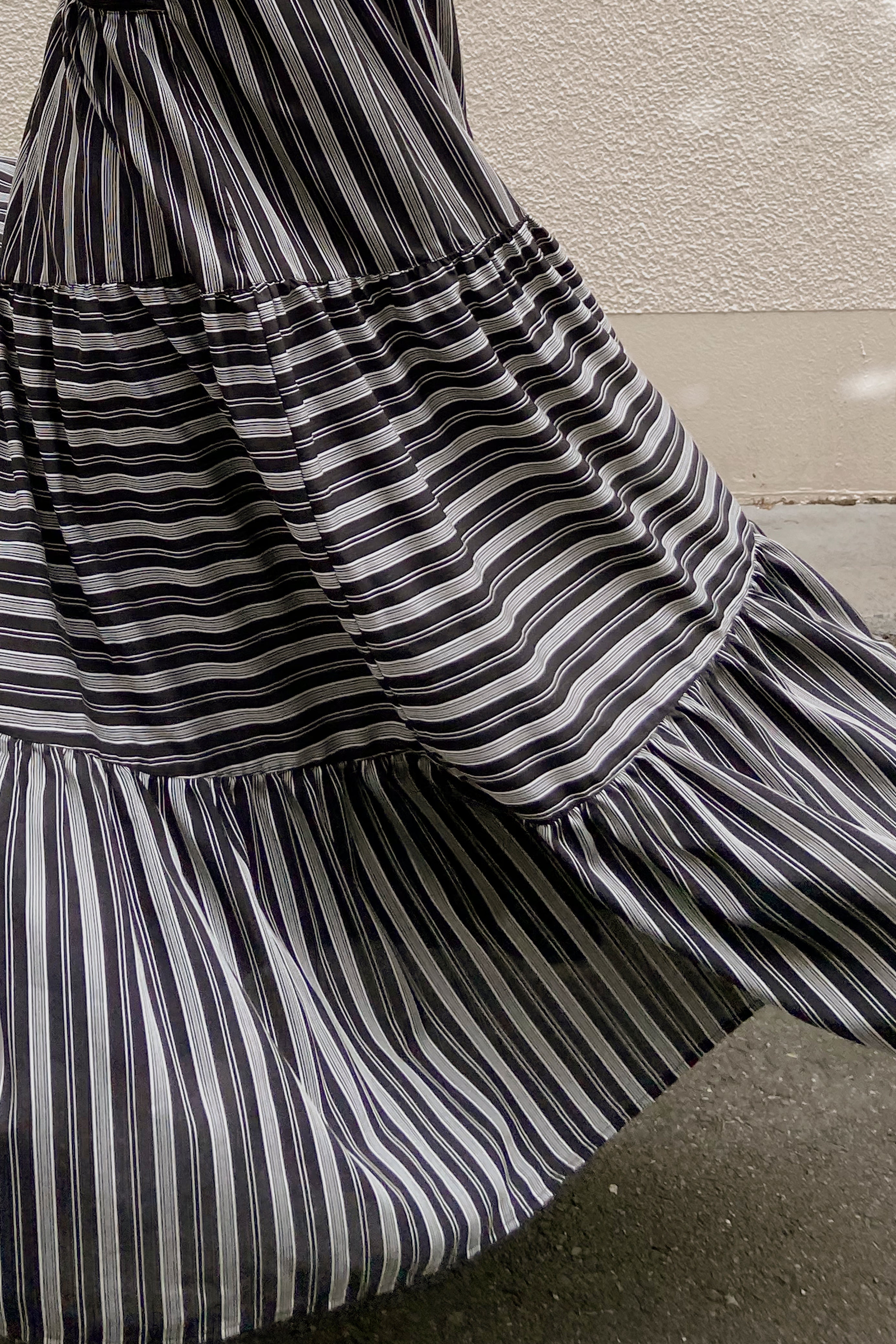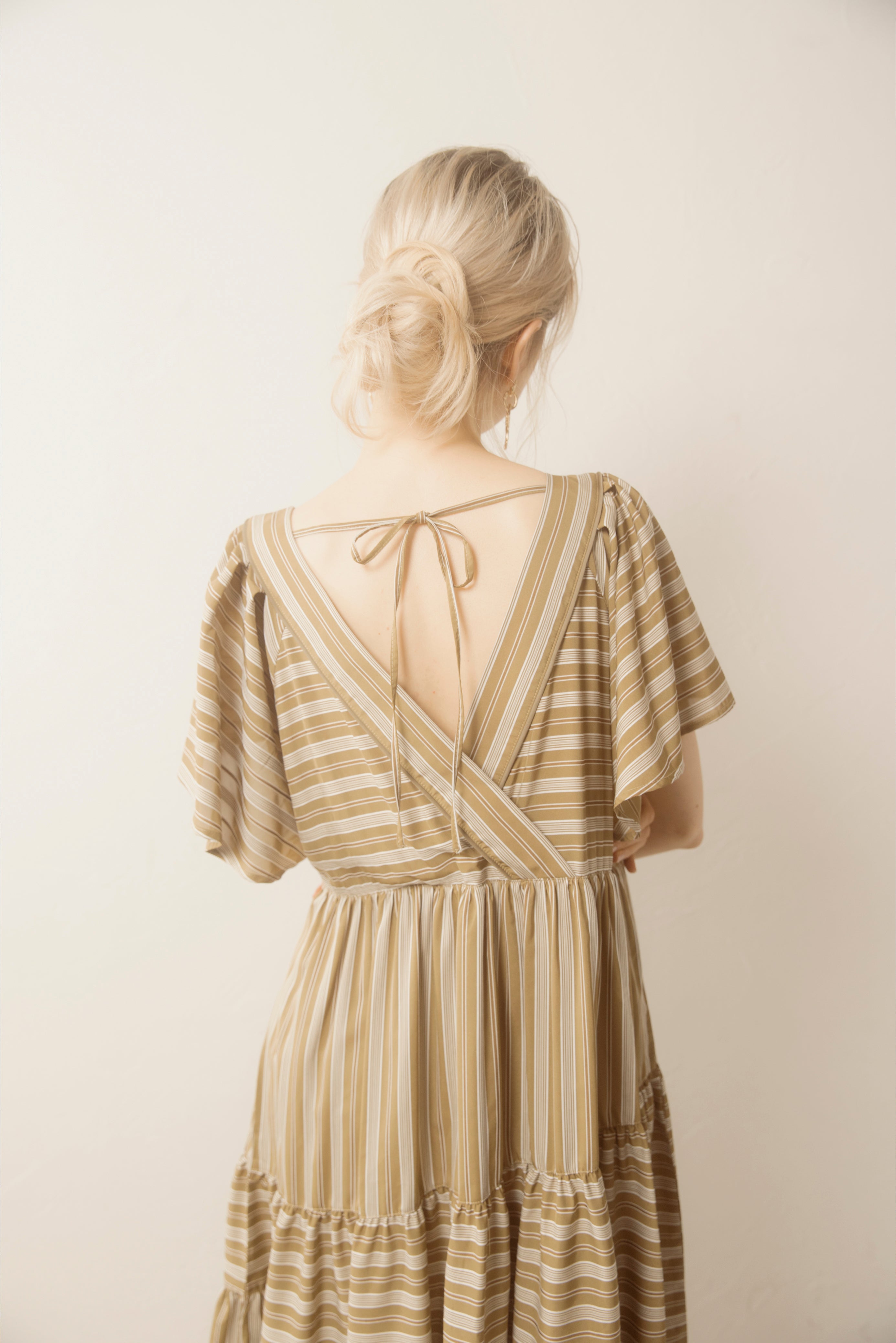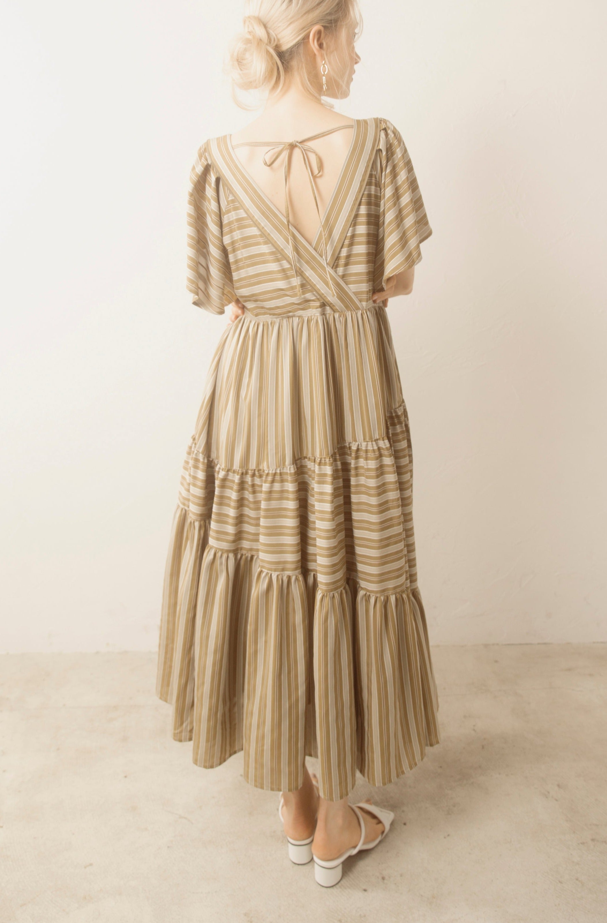 ストライプ生地に細いコードパイピングのカラーコントラストをアクセントにした前後着用が可能な嬉しい仕様のサンドレス。