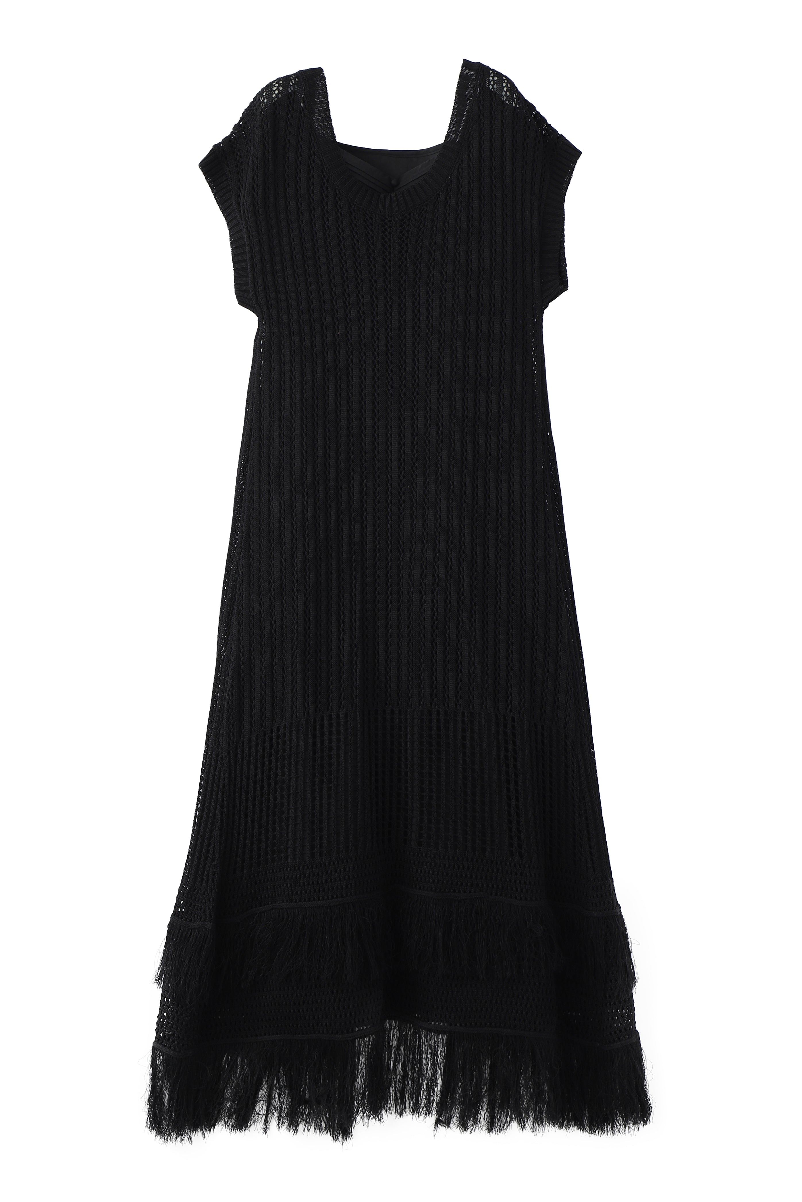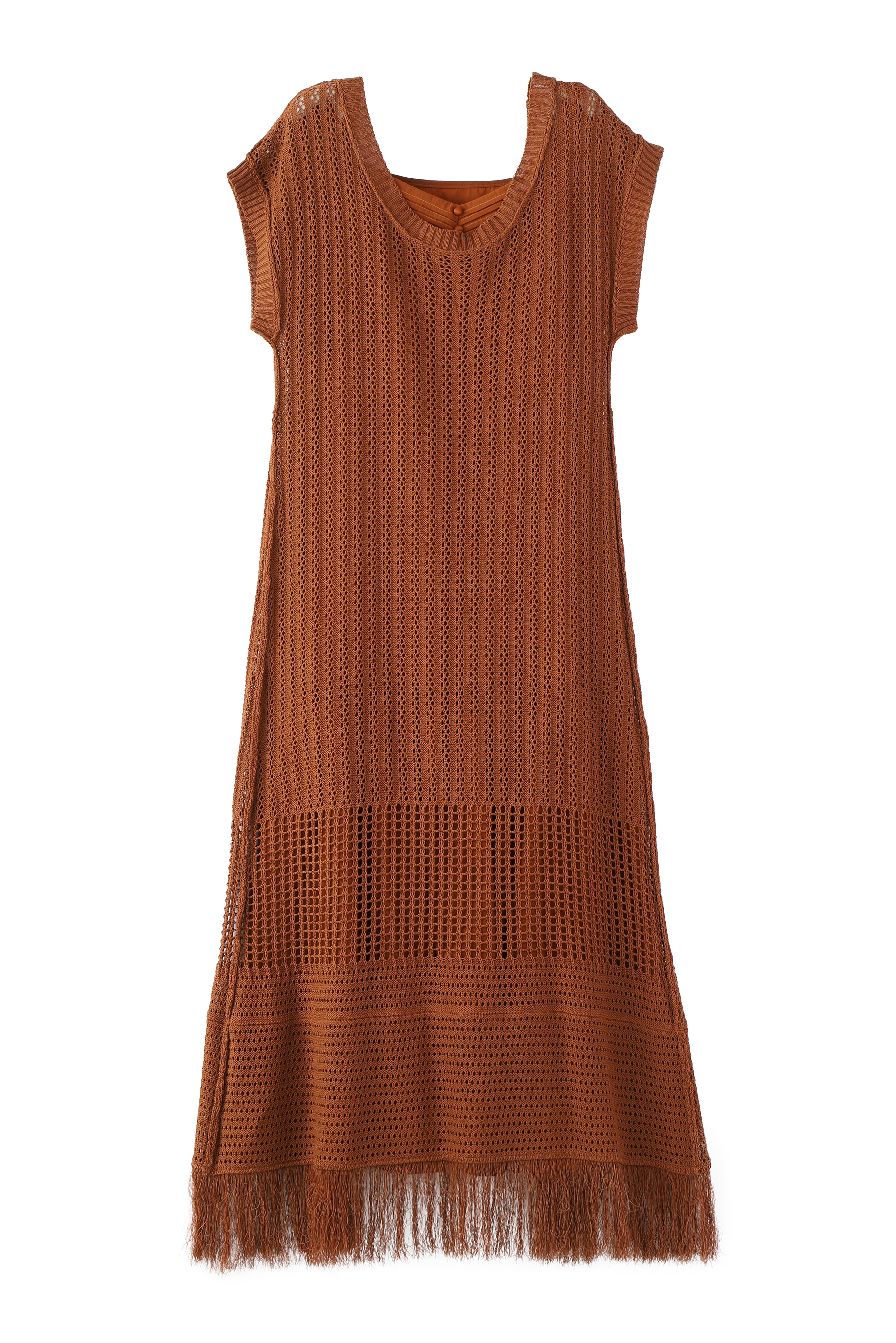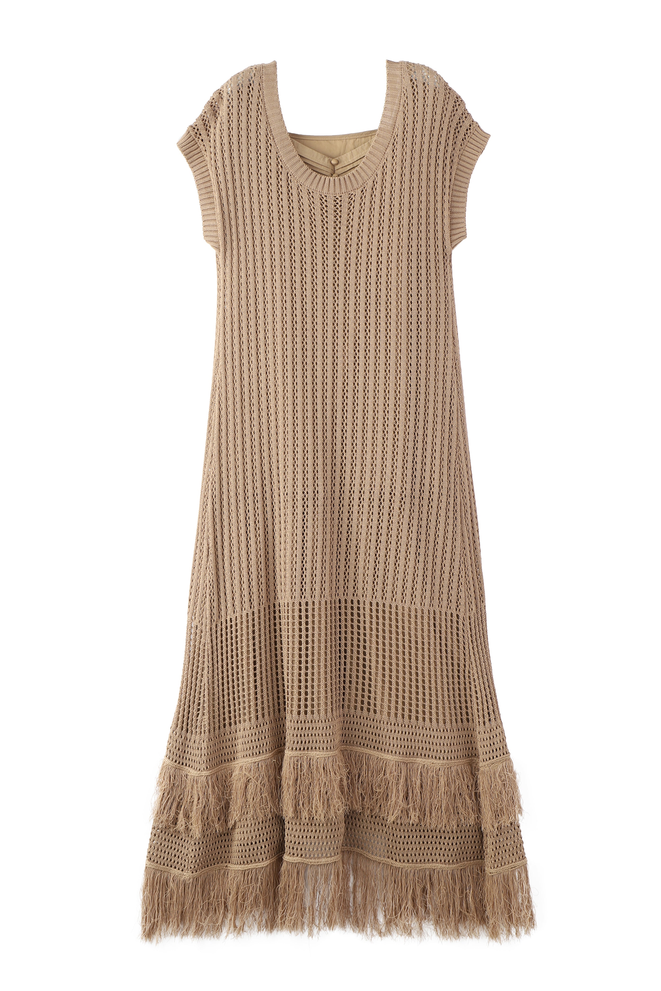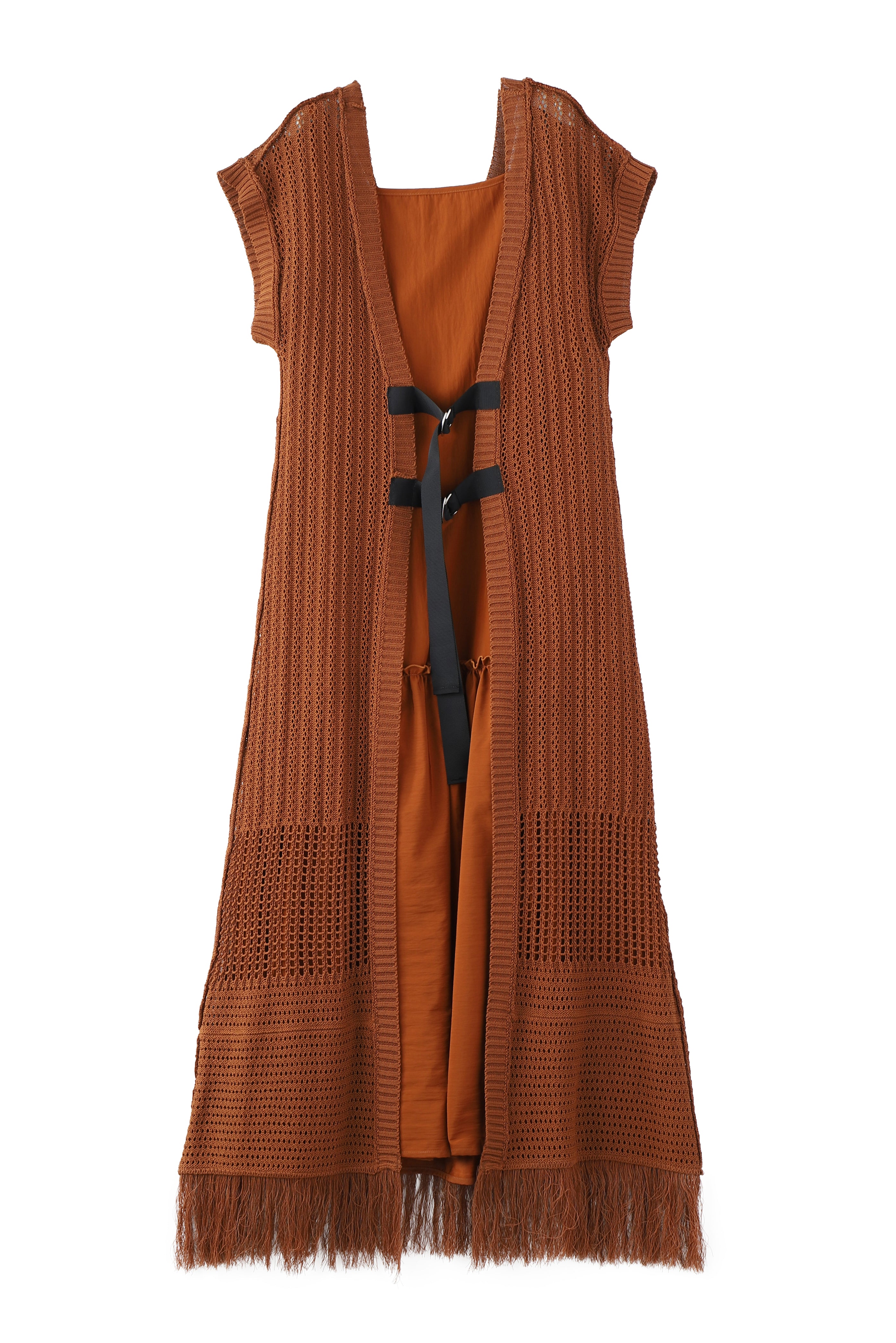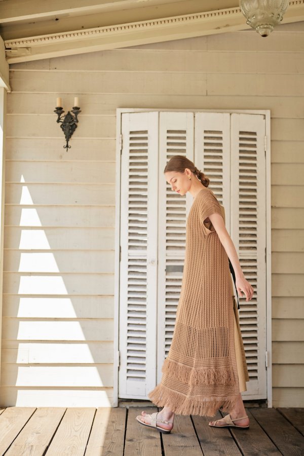 インナーワンピースがセットになった、かぎ針のロングカーディガン。