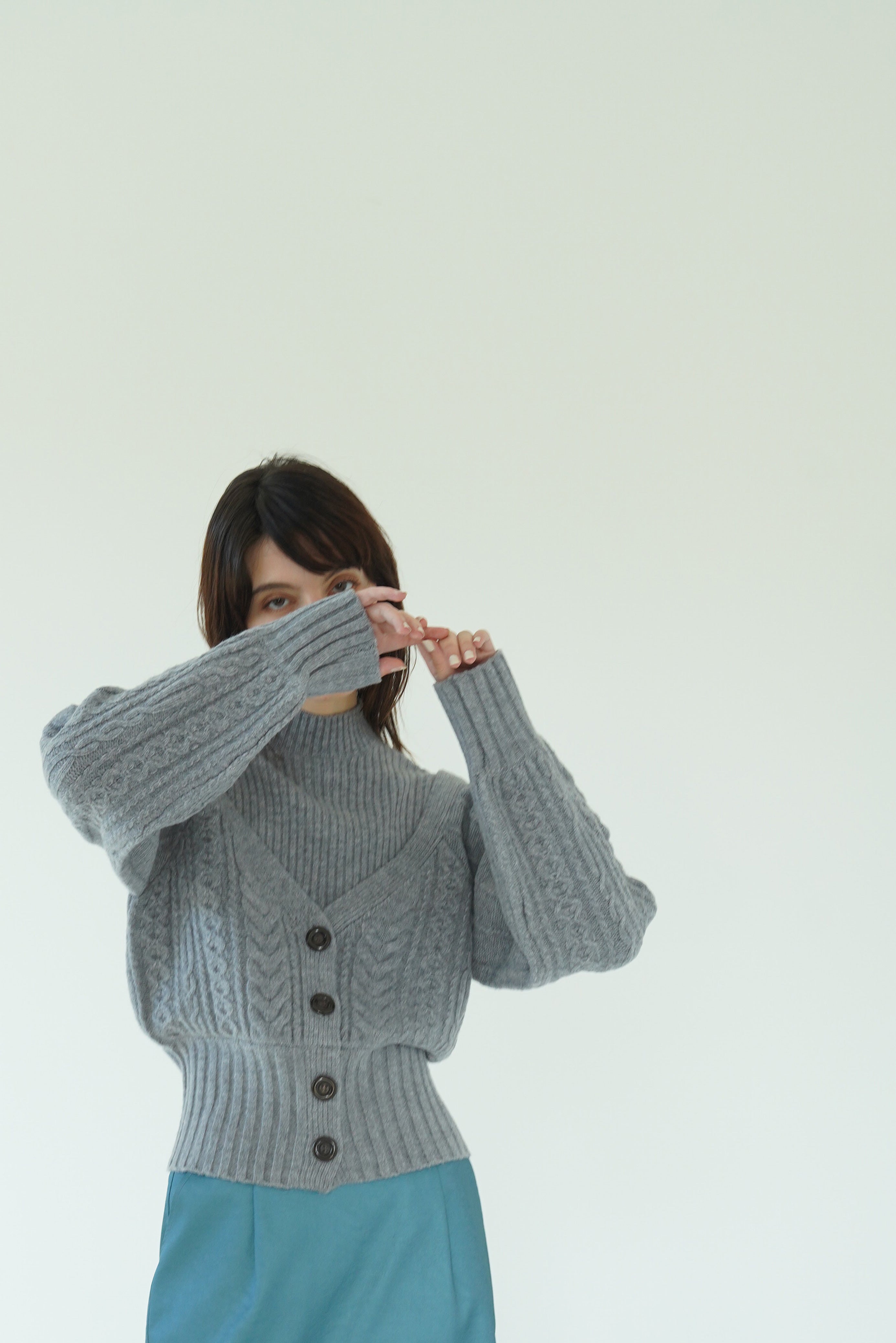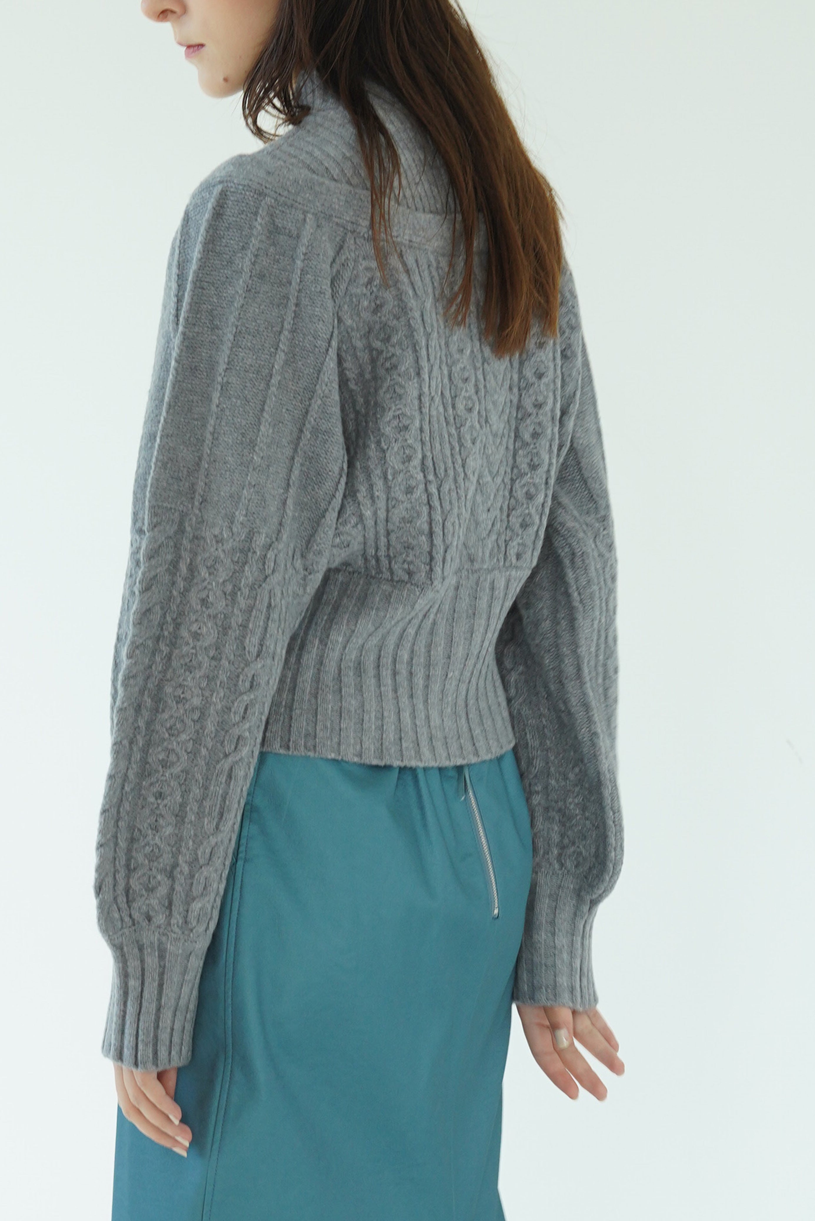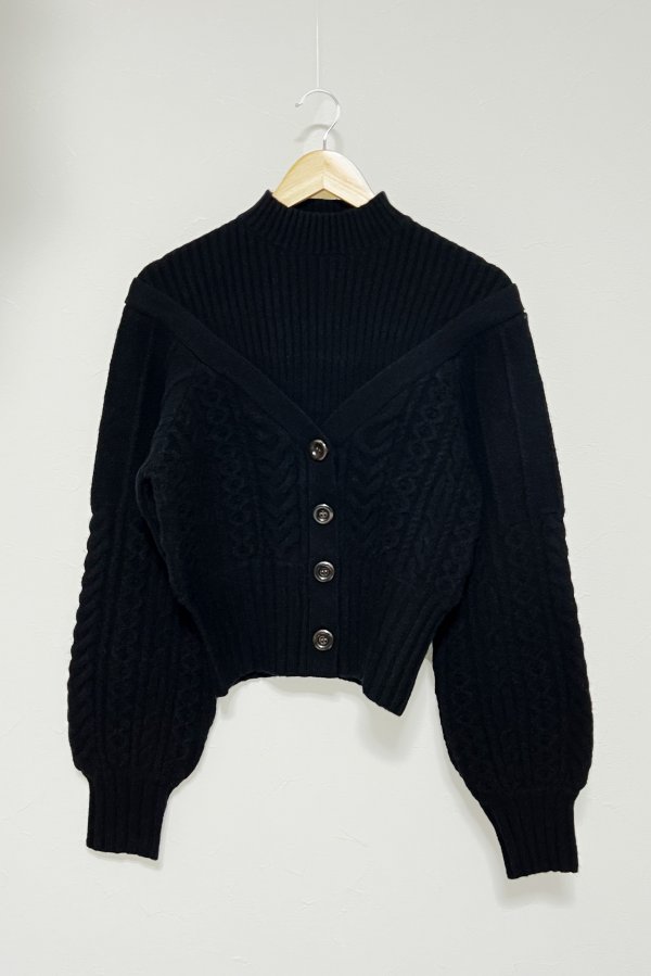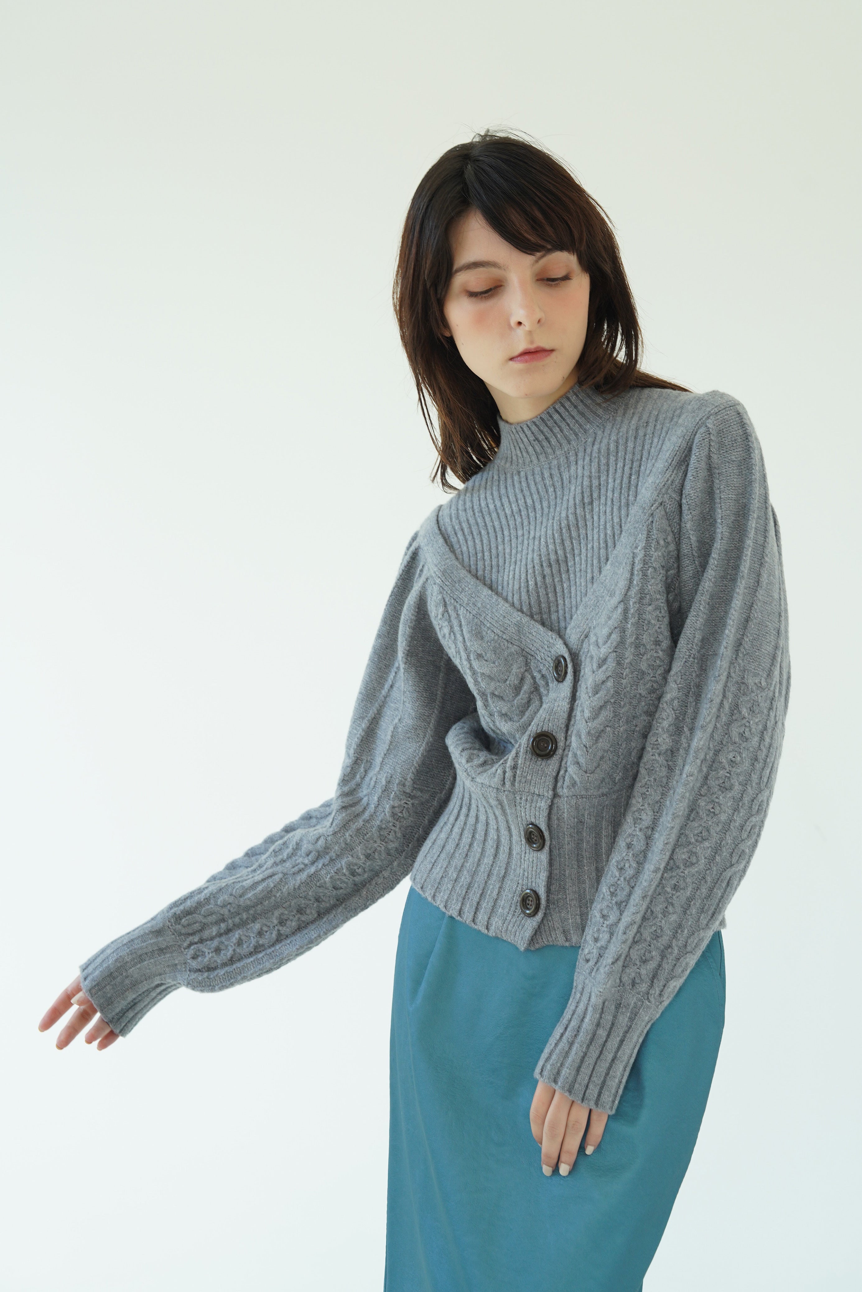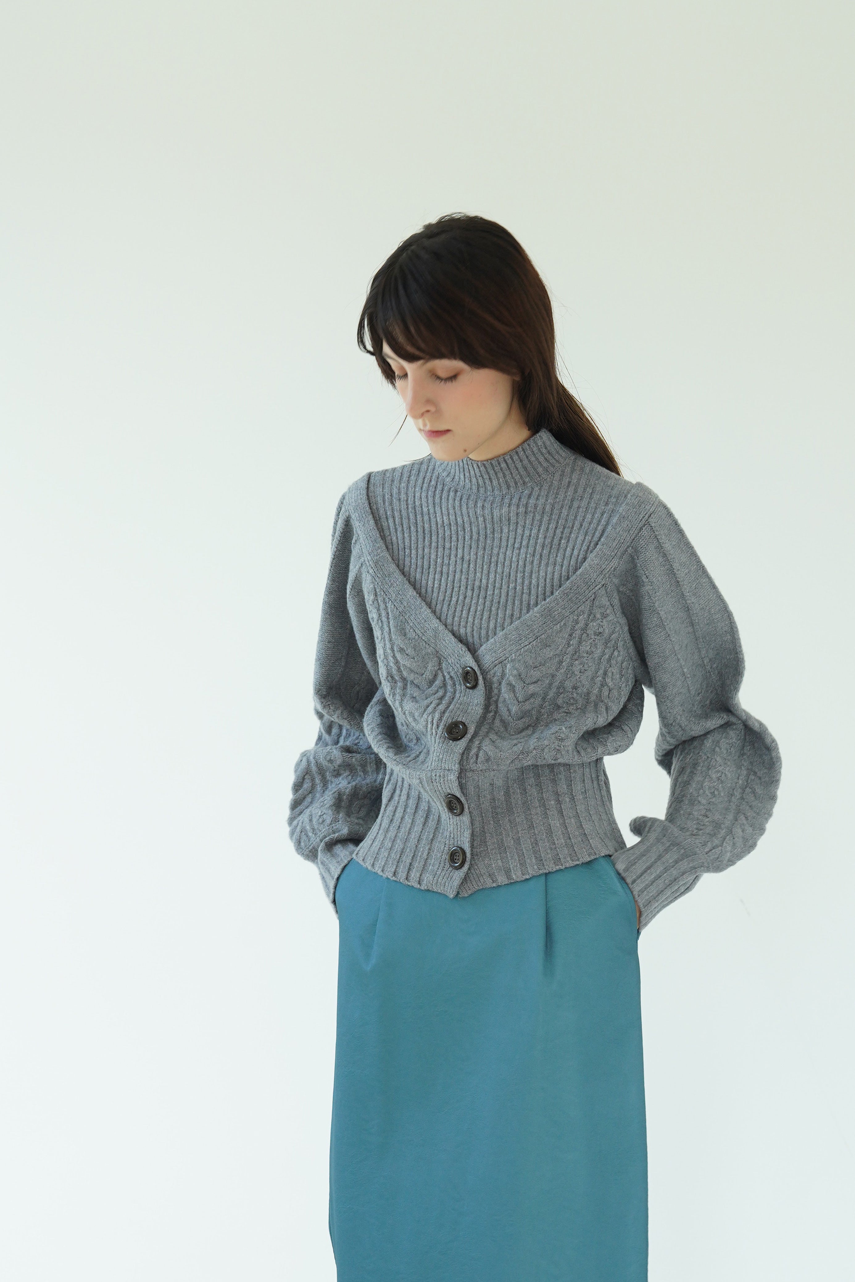 ドッキングにすることでセットアイテムのレイヤードでは表現できない絶妙な抜け感のある肩の落ち加減を表現し、コンサバティブな印象になりがちなニットトップスも一味違う華奢見えワンテクアイテムに。