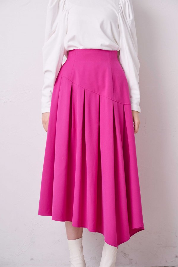 リズム感のあるソフトプリーツにイレヘムのカッティングがユニークなスカート。
