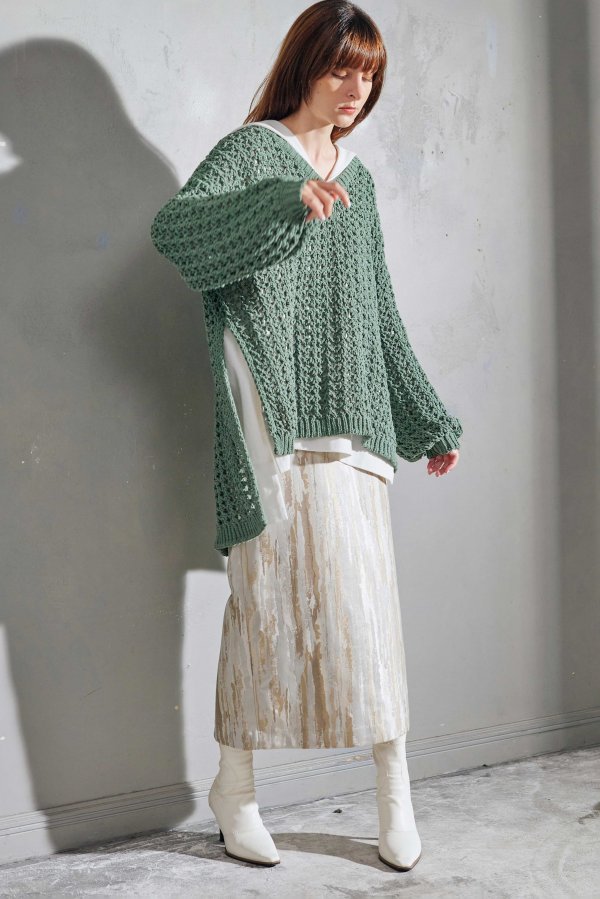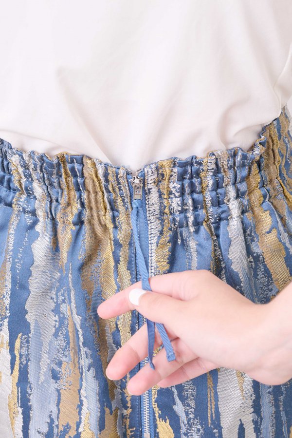 抽象画のようなニュアンス感のジャカードスカートはデザイナー今季イチ押しアイテム。