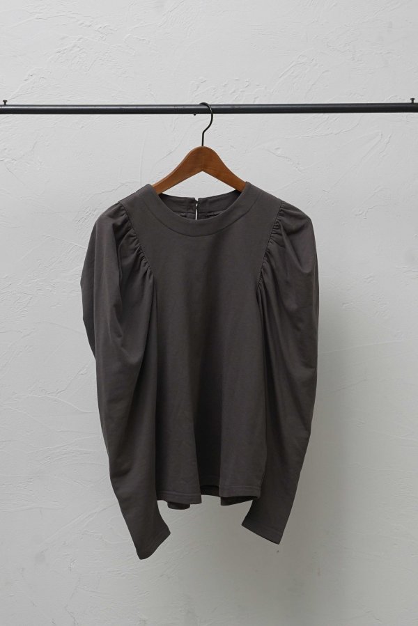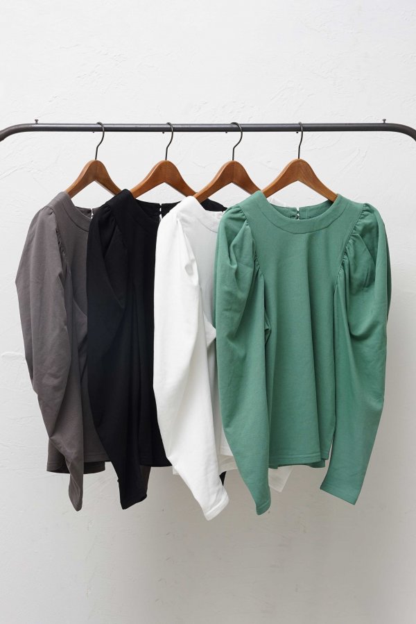 たっぷりギャザーをとった分量感のあるボリューム袖に極端に肩幅を狭めることで華奢見えを演出。
