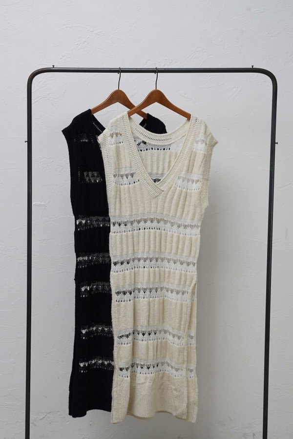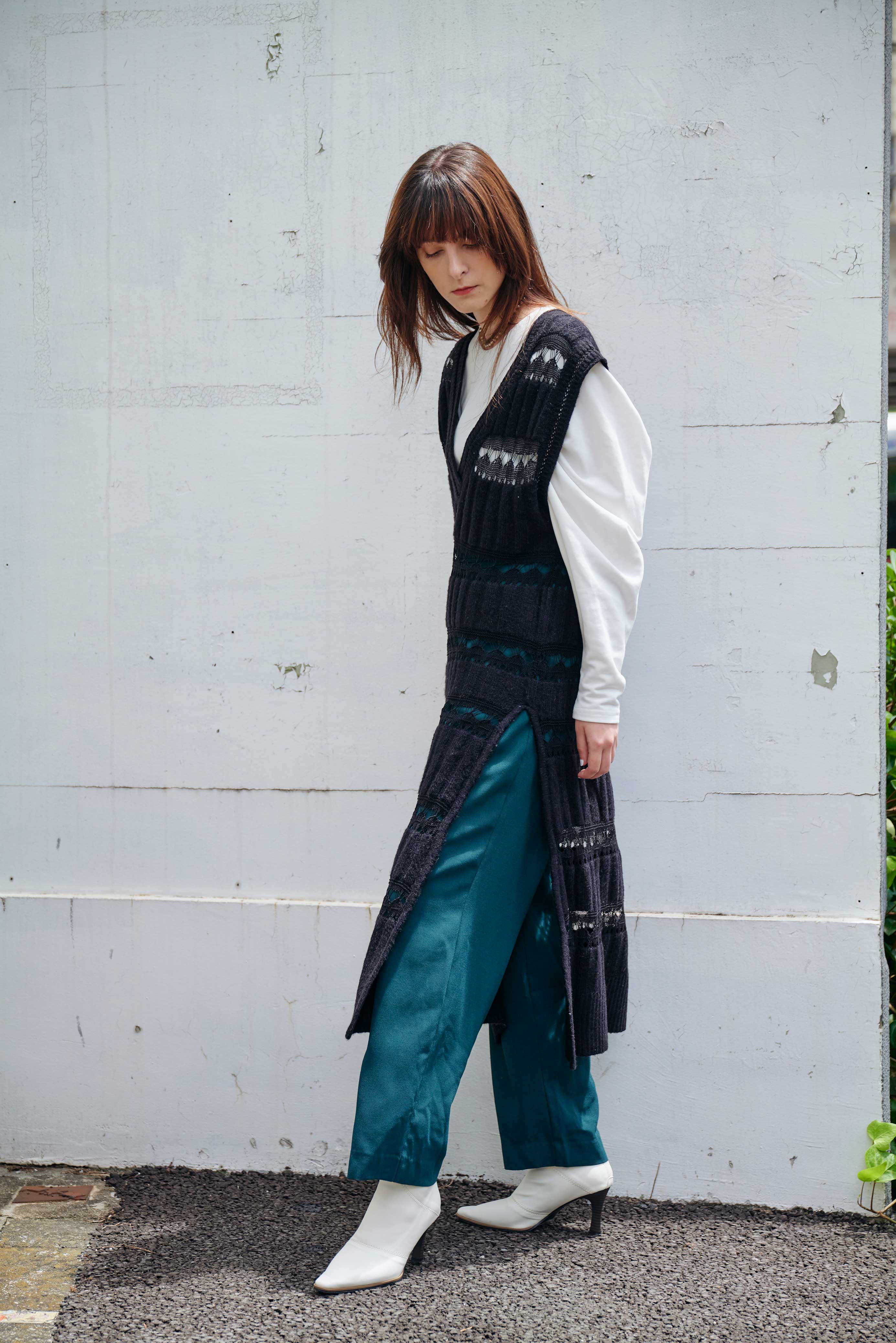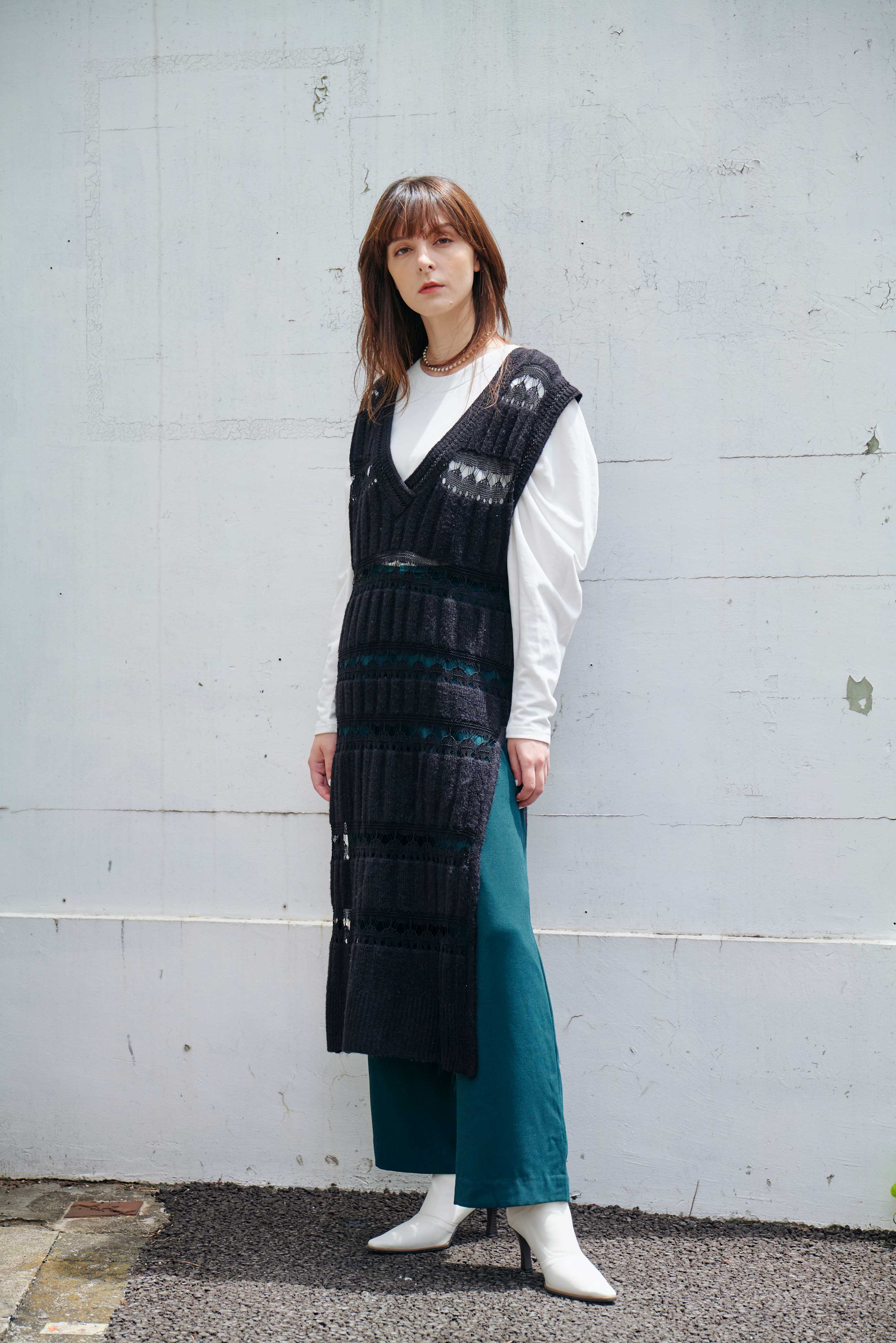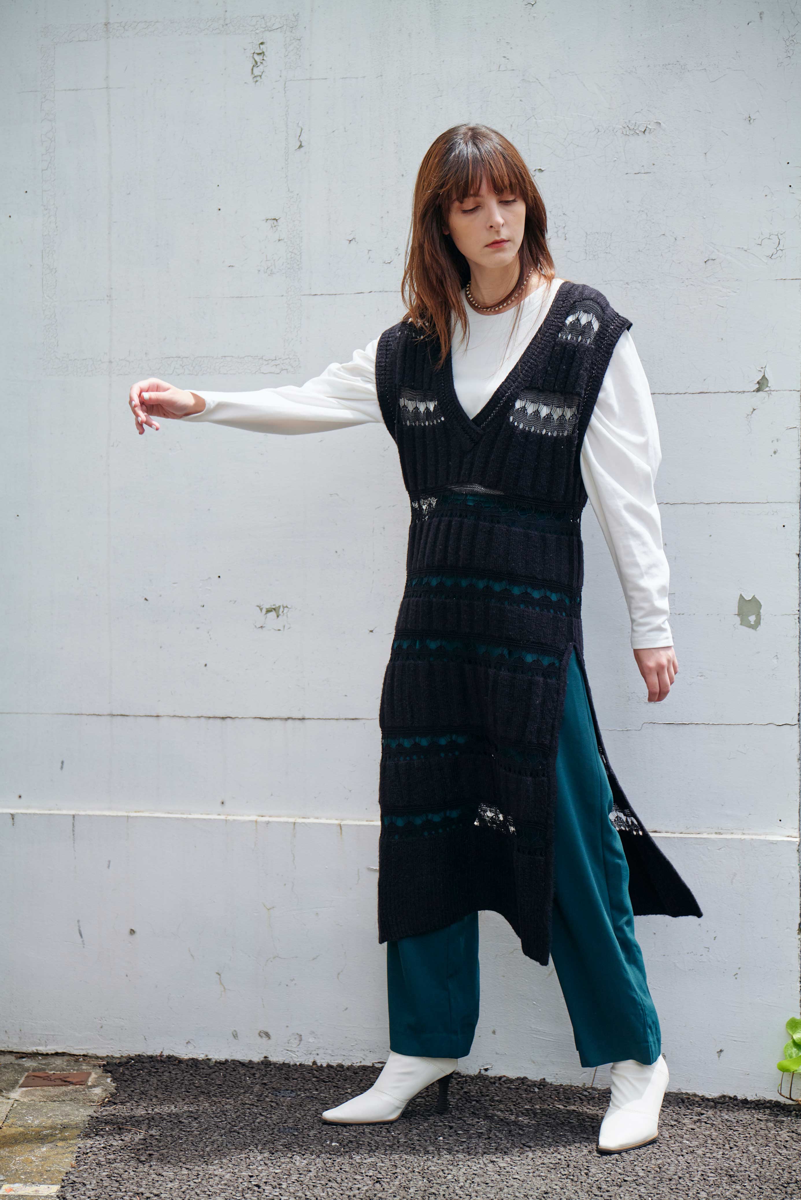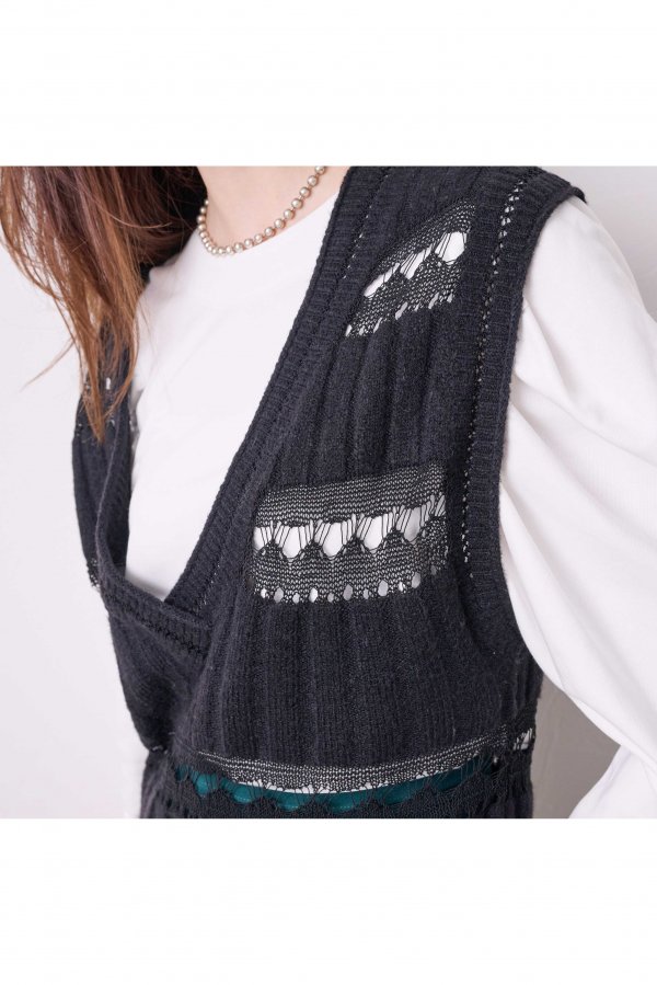 質感の異なる二種類の糸を組み合わせたレース見えの透かし編みがポイントになった異素材ロングニットベスト。
