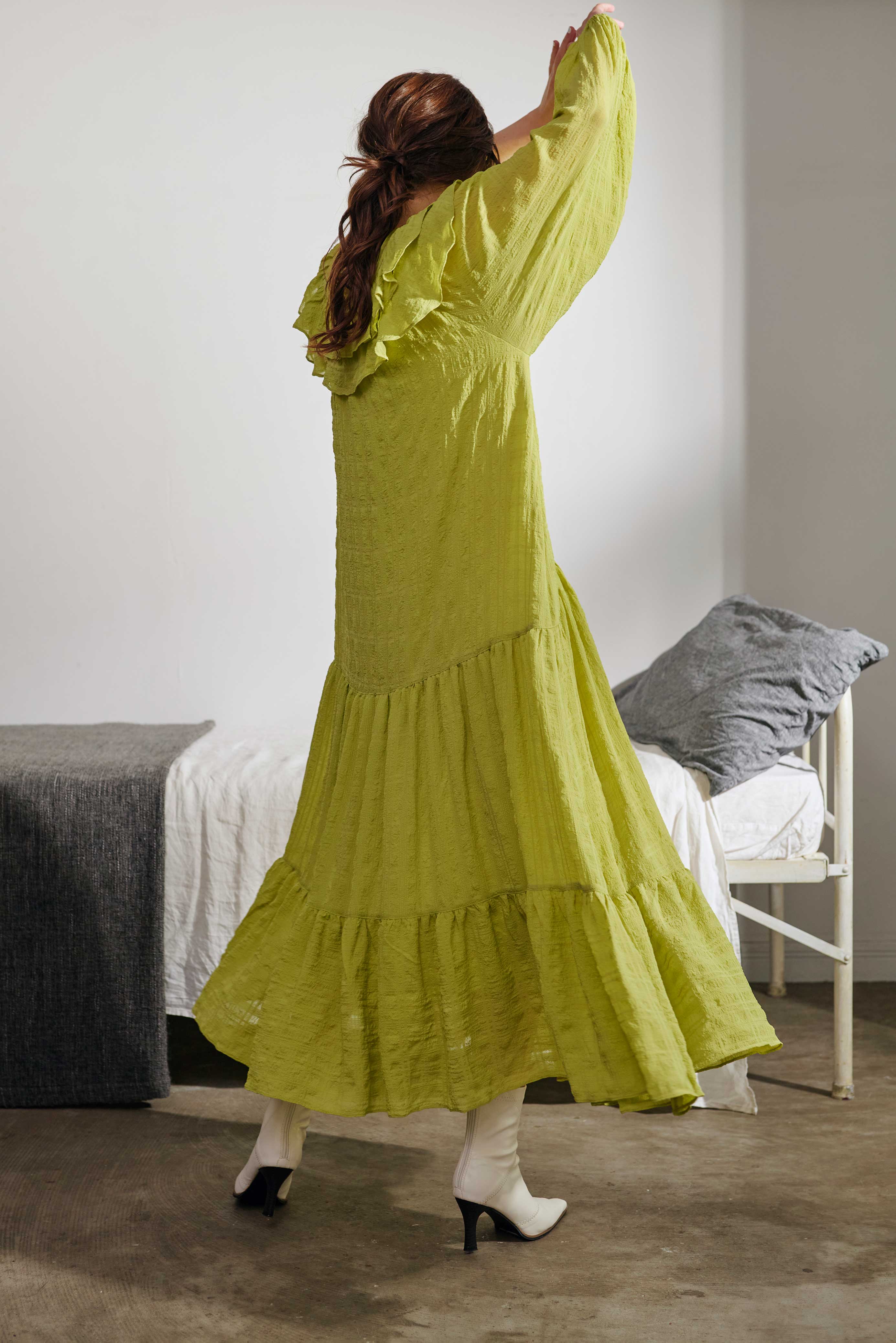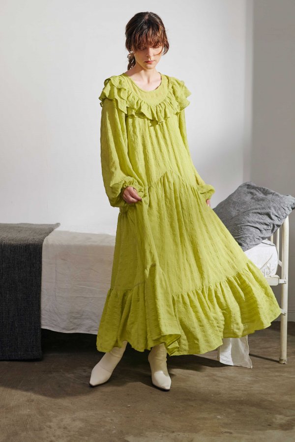 表面変化のある生地を使用したシフォンティアードワンピース。