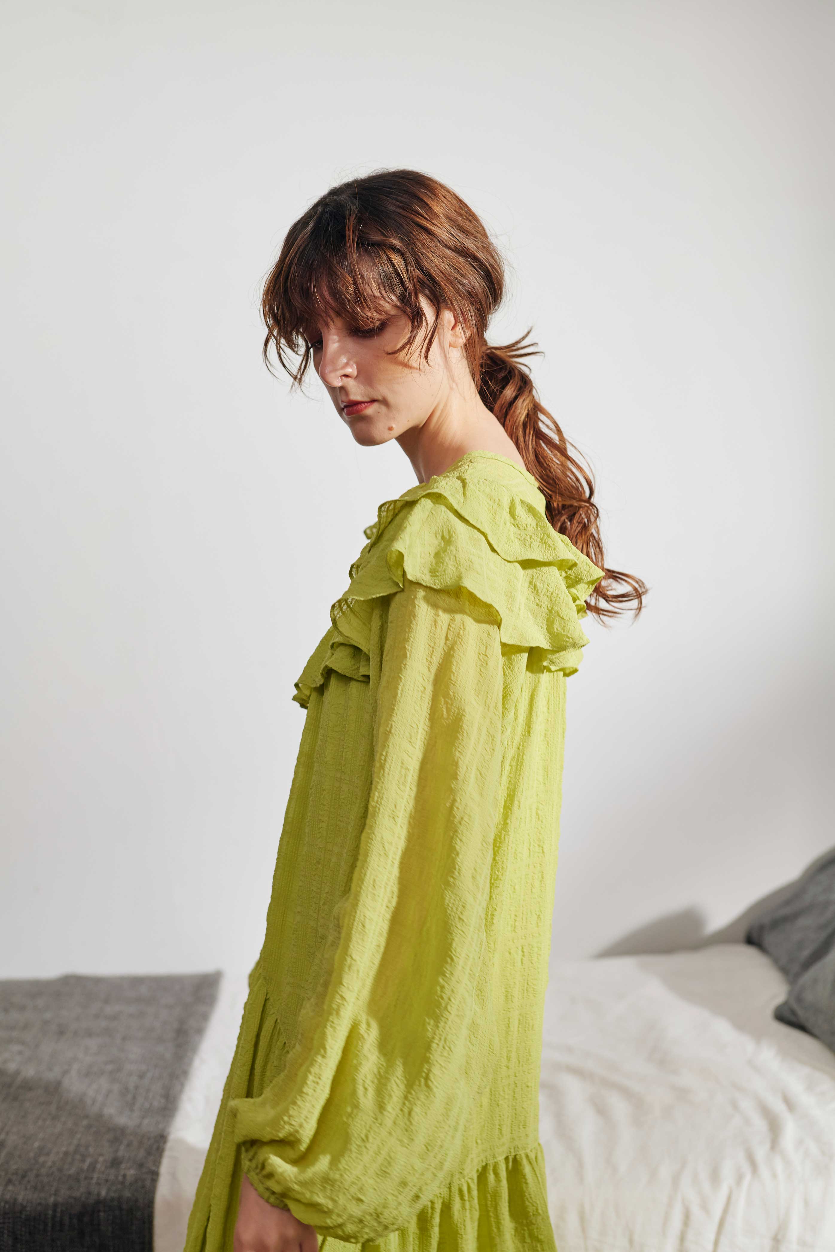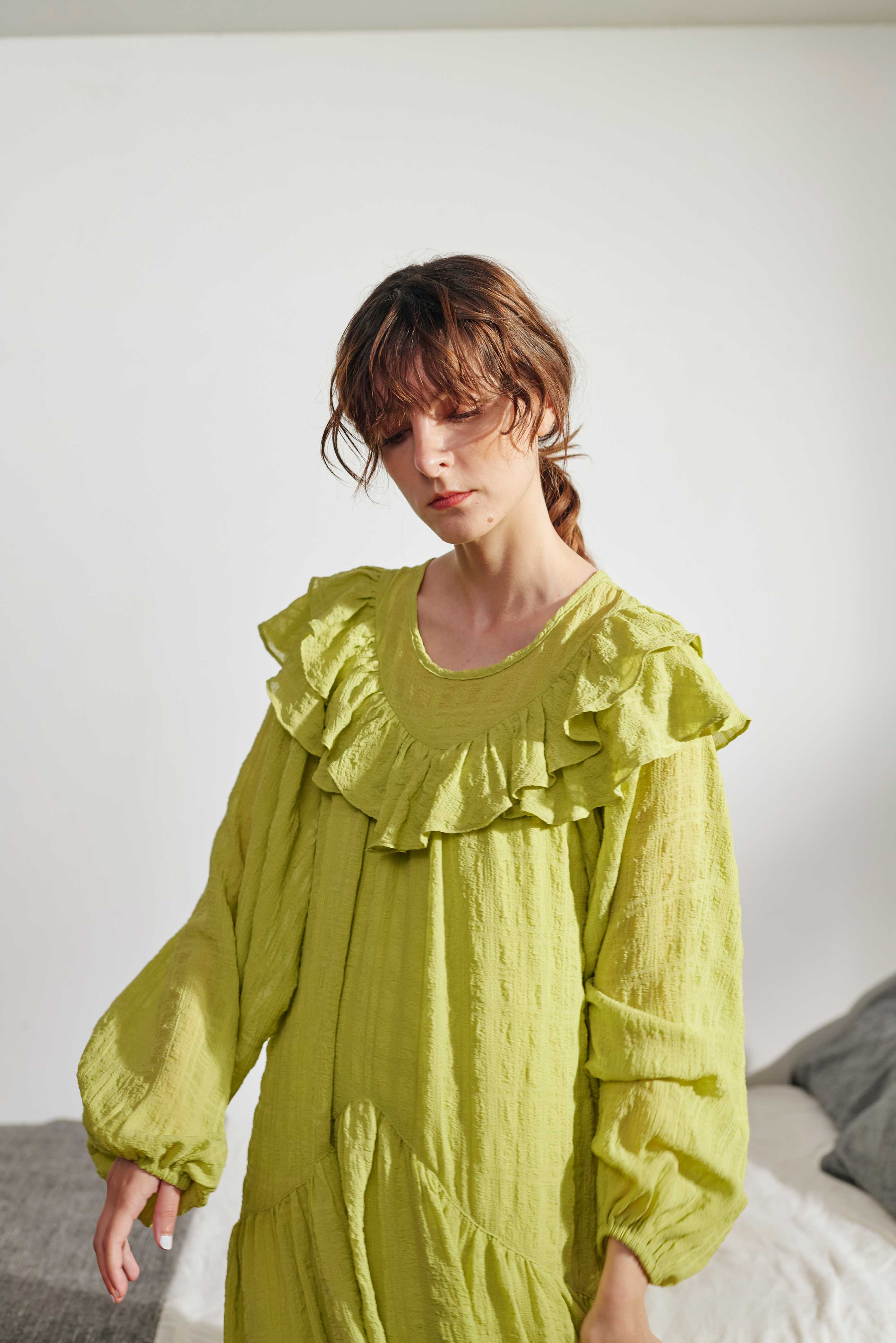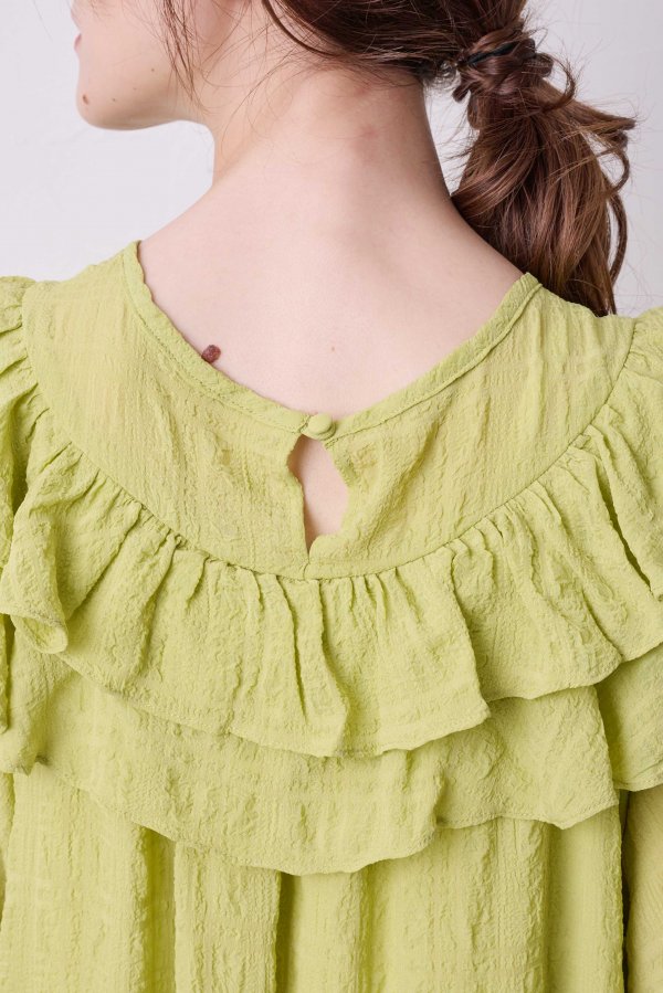 落ち感のある素材がこなれ感を演出し、たっぷりなフリル分量やほどよくボリューミーな袖がオケージョンでも活躍しそうな品の良いフェミニンスタイルに。