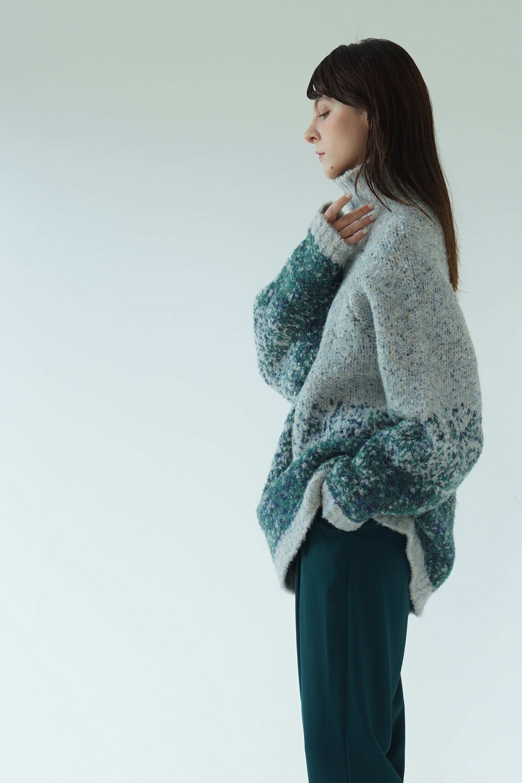 点描画のようなカラーグラデーションをジャカード編みの繊細なタッチで表現された配色カラーニット。
