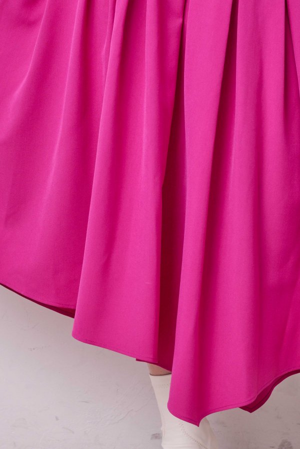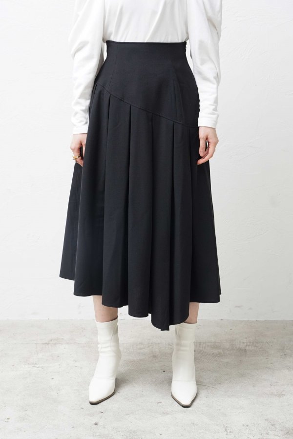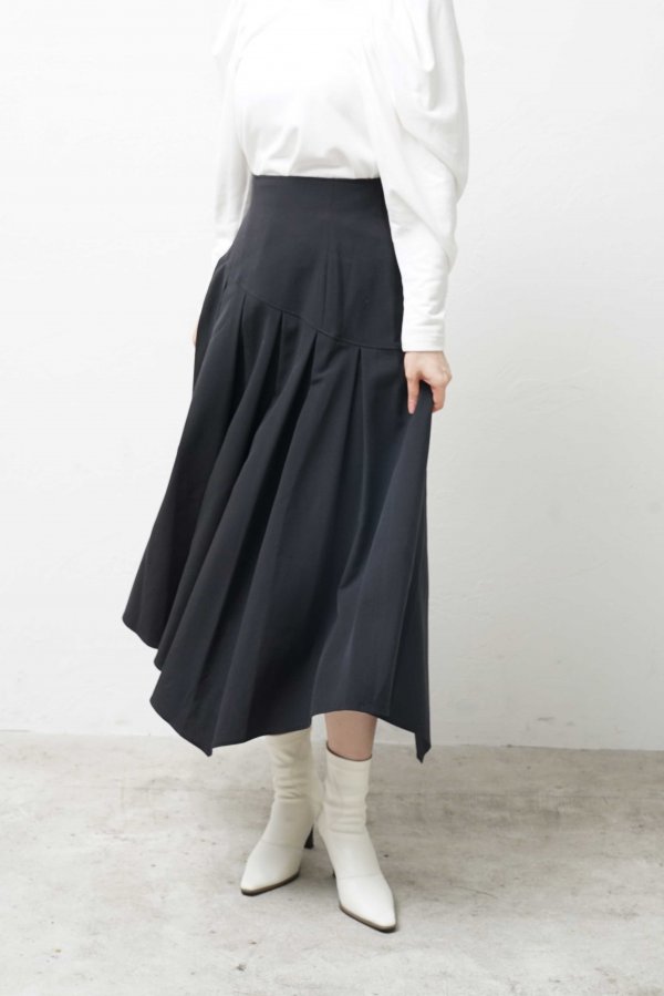 リズム感のあるソフトプリーツにイレヘムのカッティングがユニークなスカート。