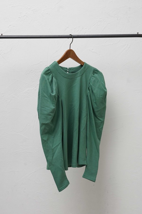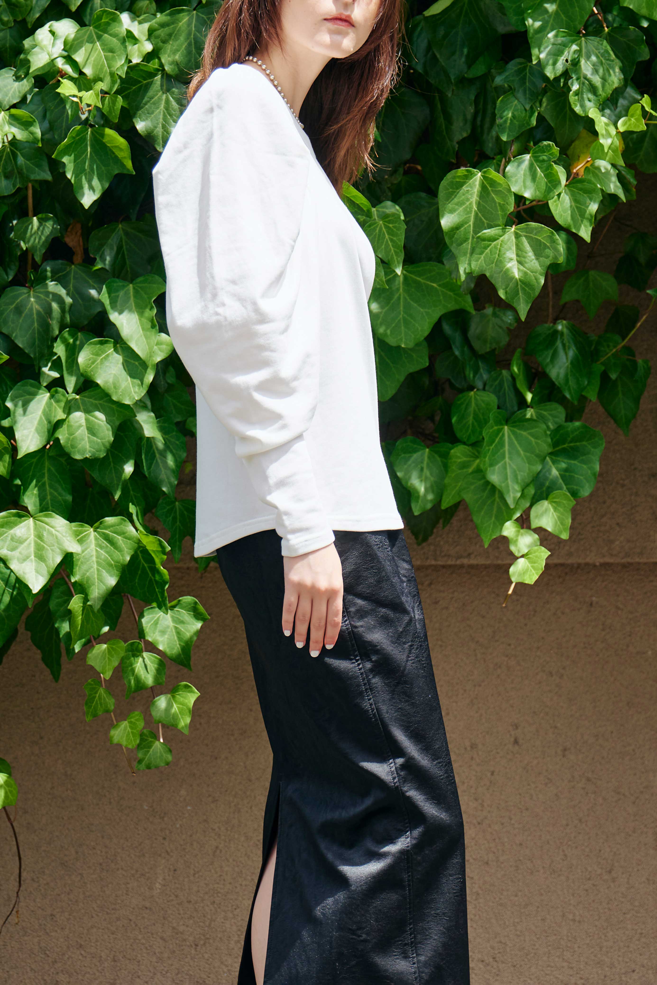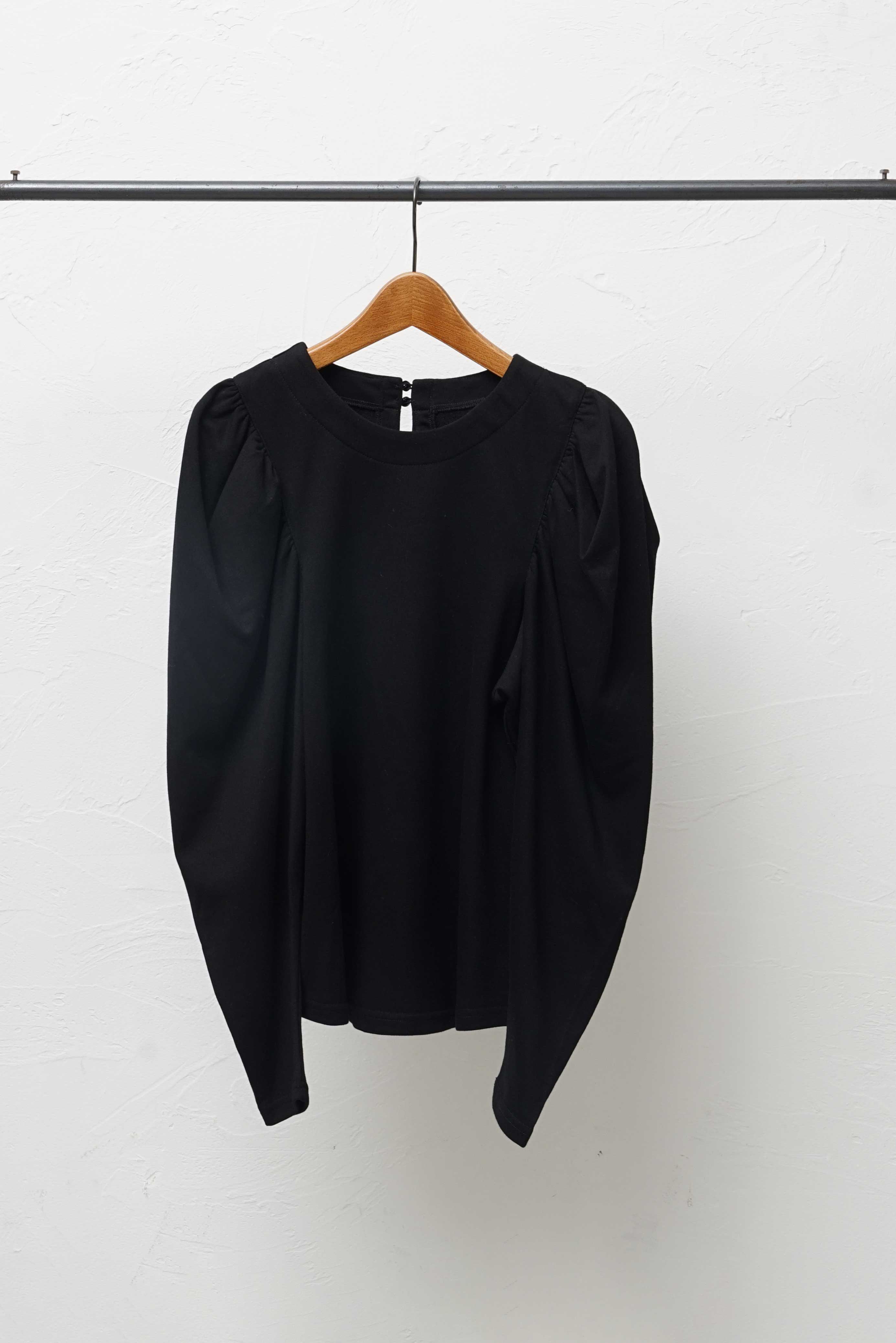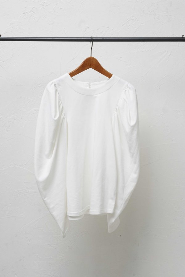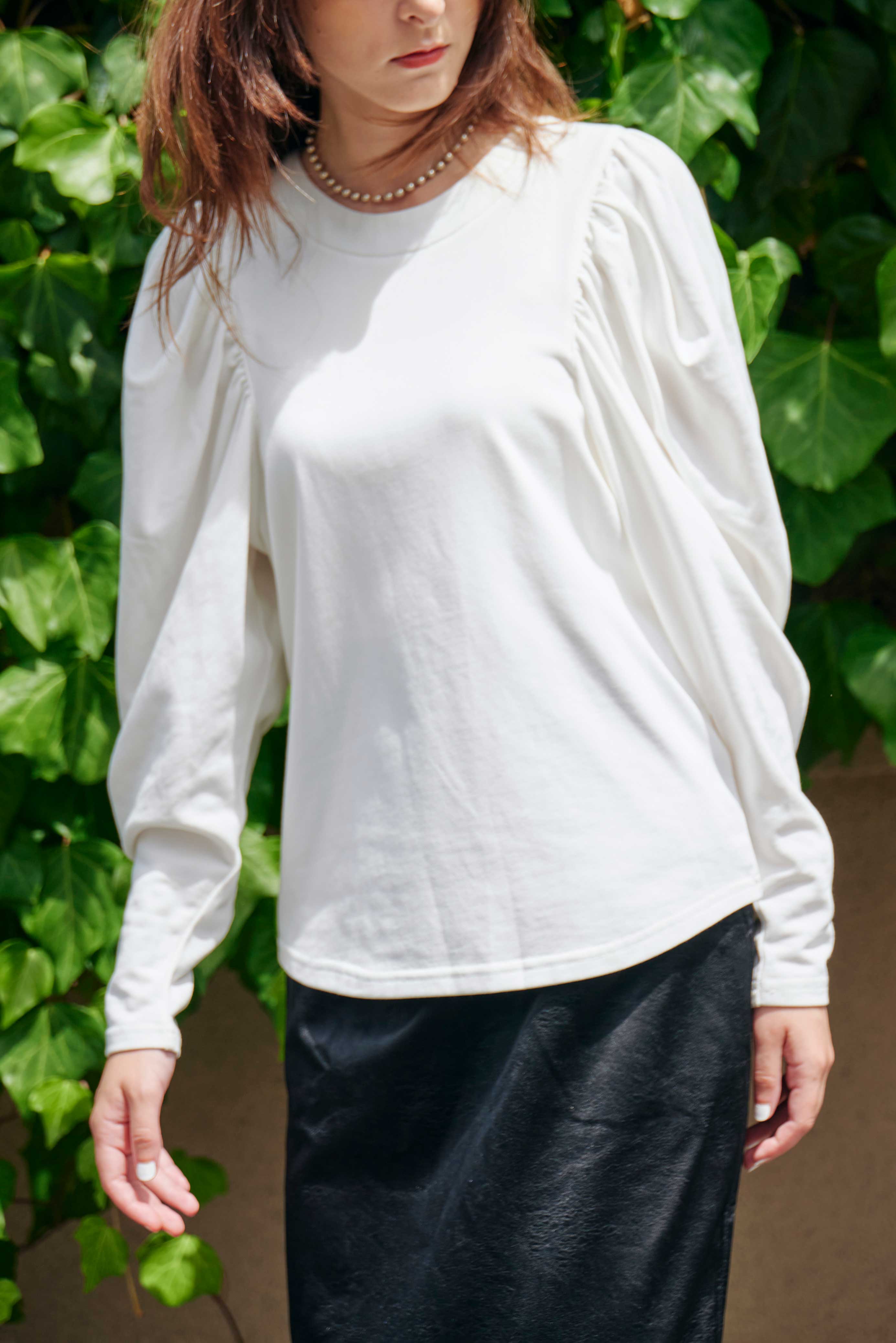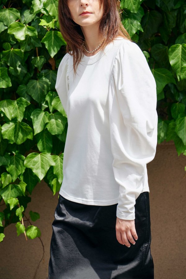たっぷりギャザーをとった分量感のあるボリューム袖に極端に肩幅を狭めることで華奢見えを演出。