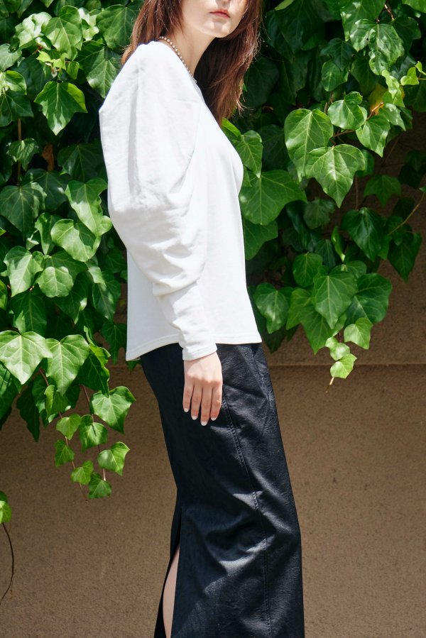 ミニ裏毛素材落ち感がほどよいフェミニンなレッグオブマトントップス。