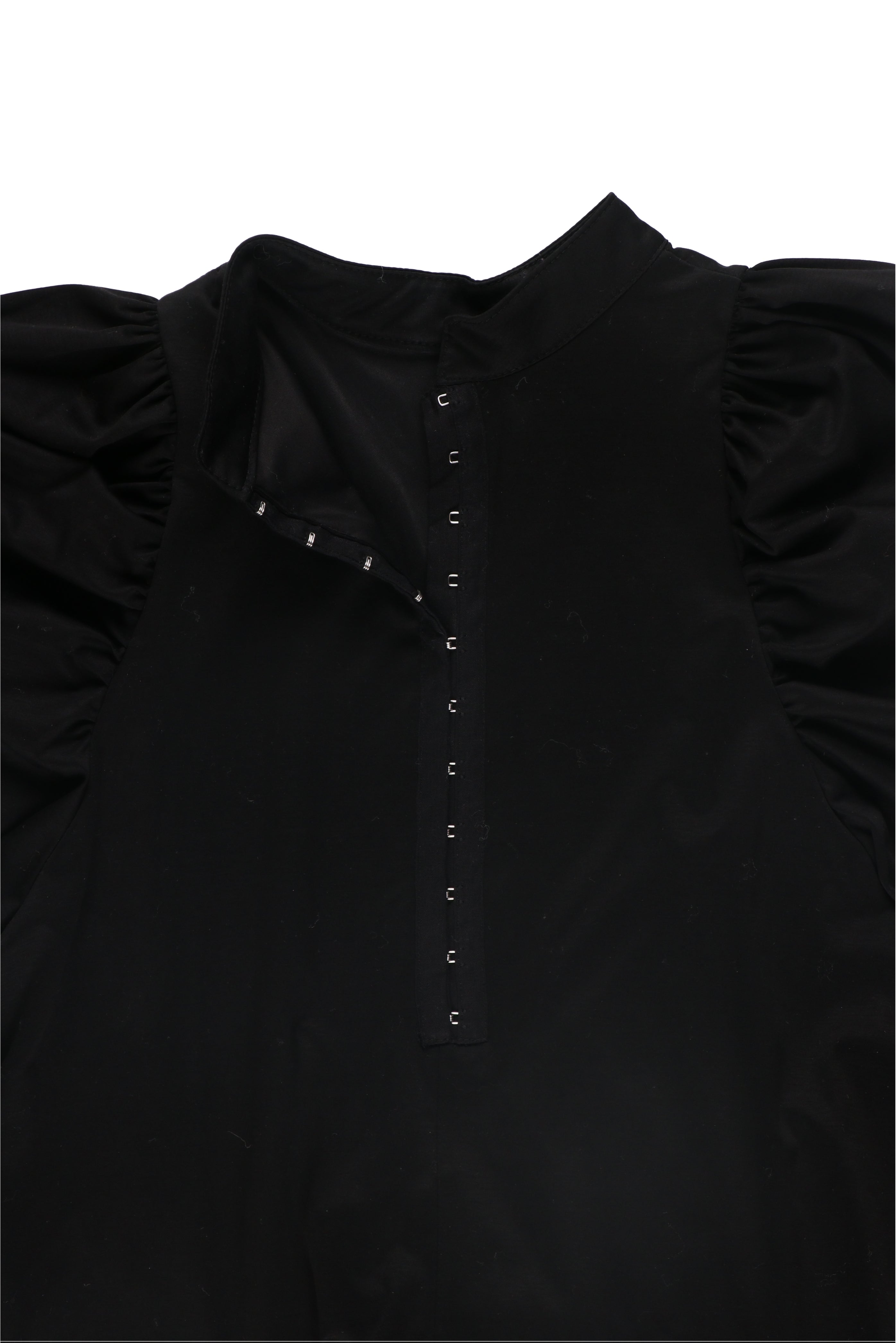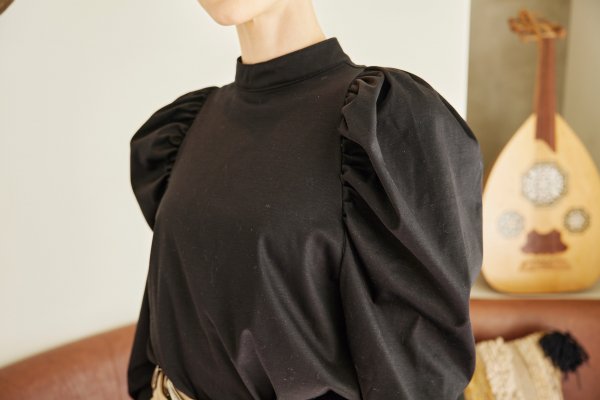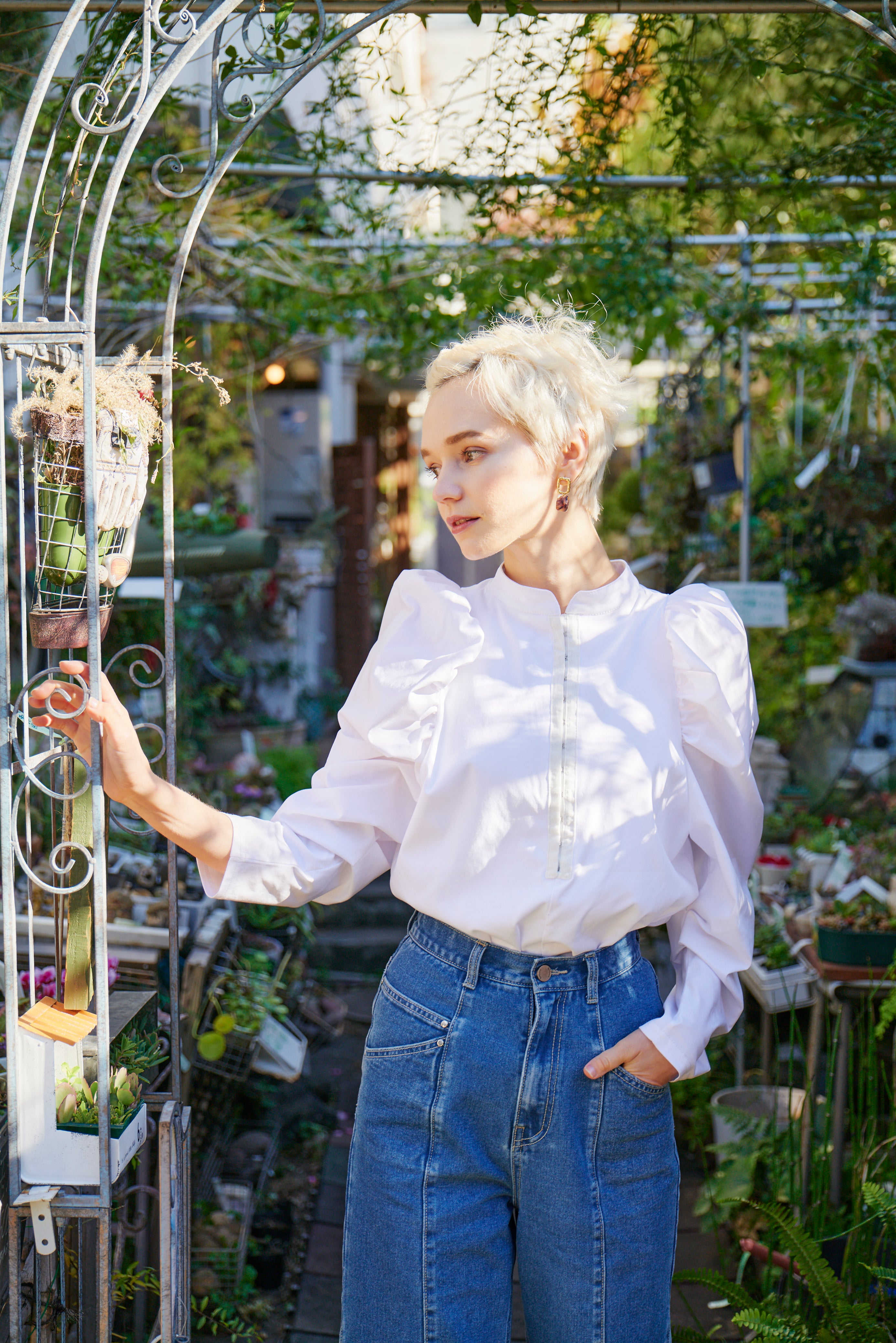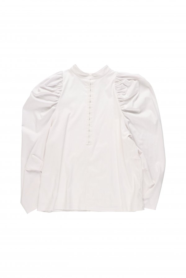 肩と袖の切替を内側にしたことで肩幅を小さくみせ、落ち着いた印象に。