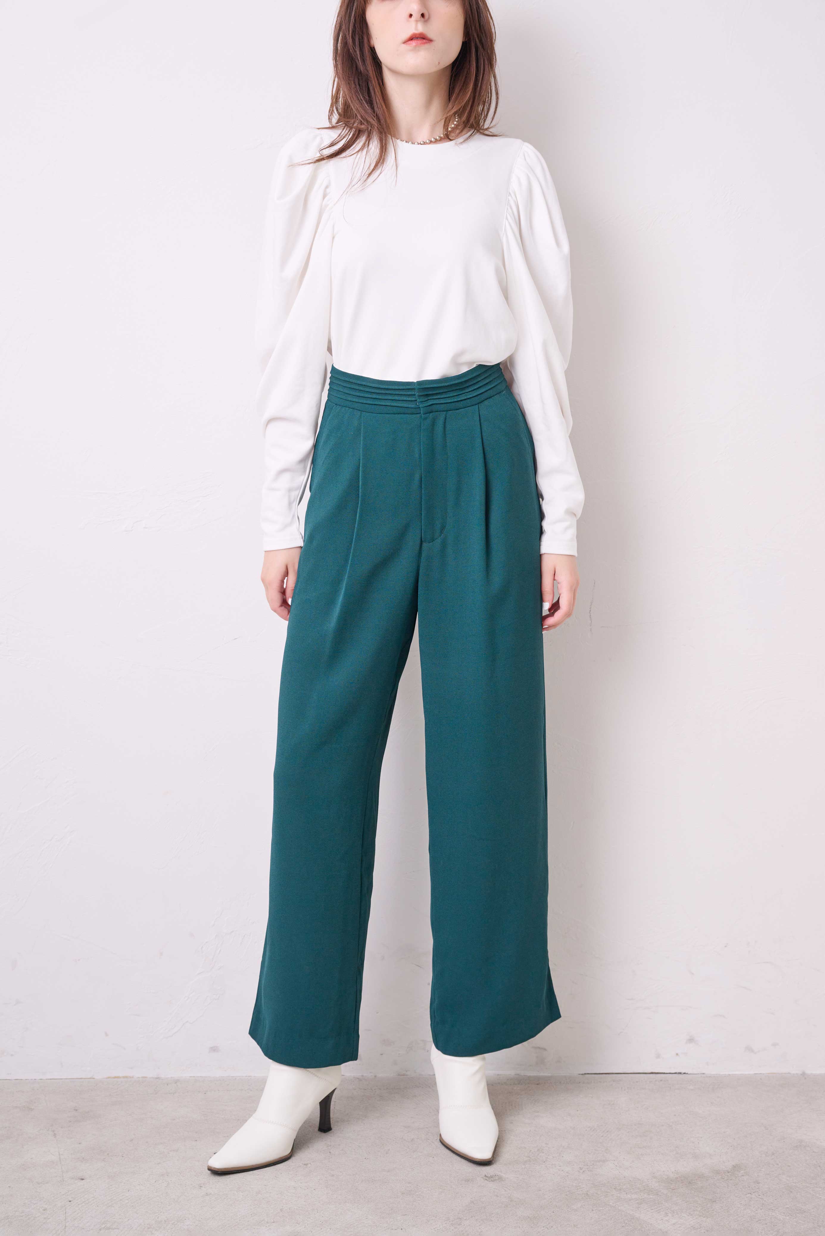 幅広くとったカマーベルトのようなウエストのデザインがトップスをインしたときのポイントになり、ナチュラルなスタイルアップがかないます。