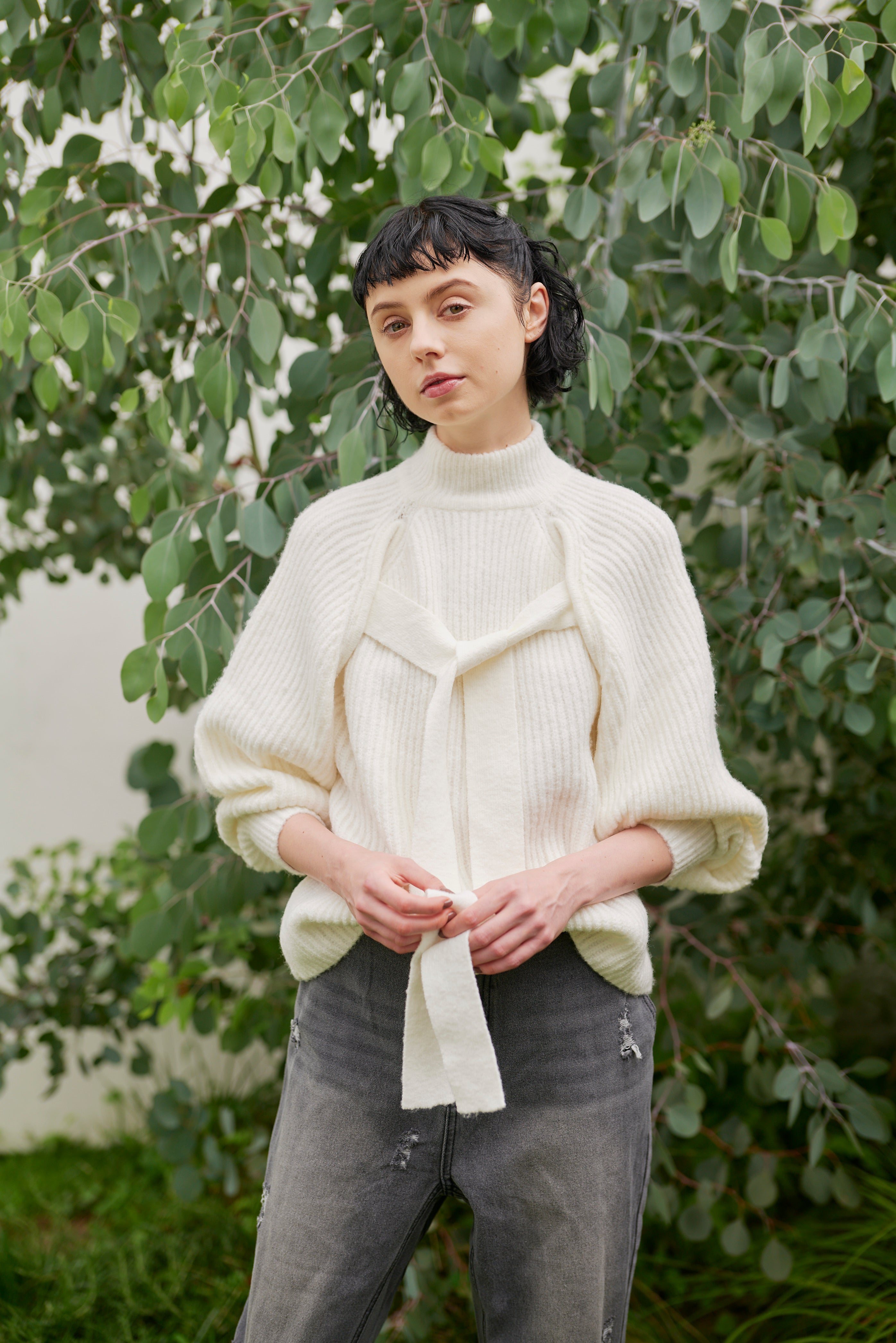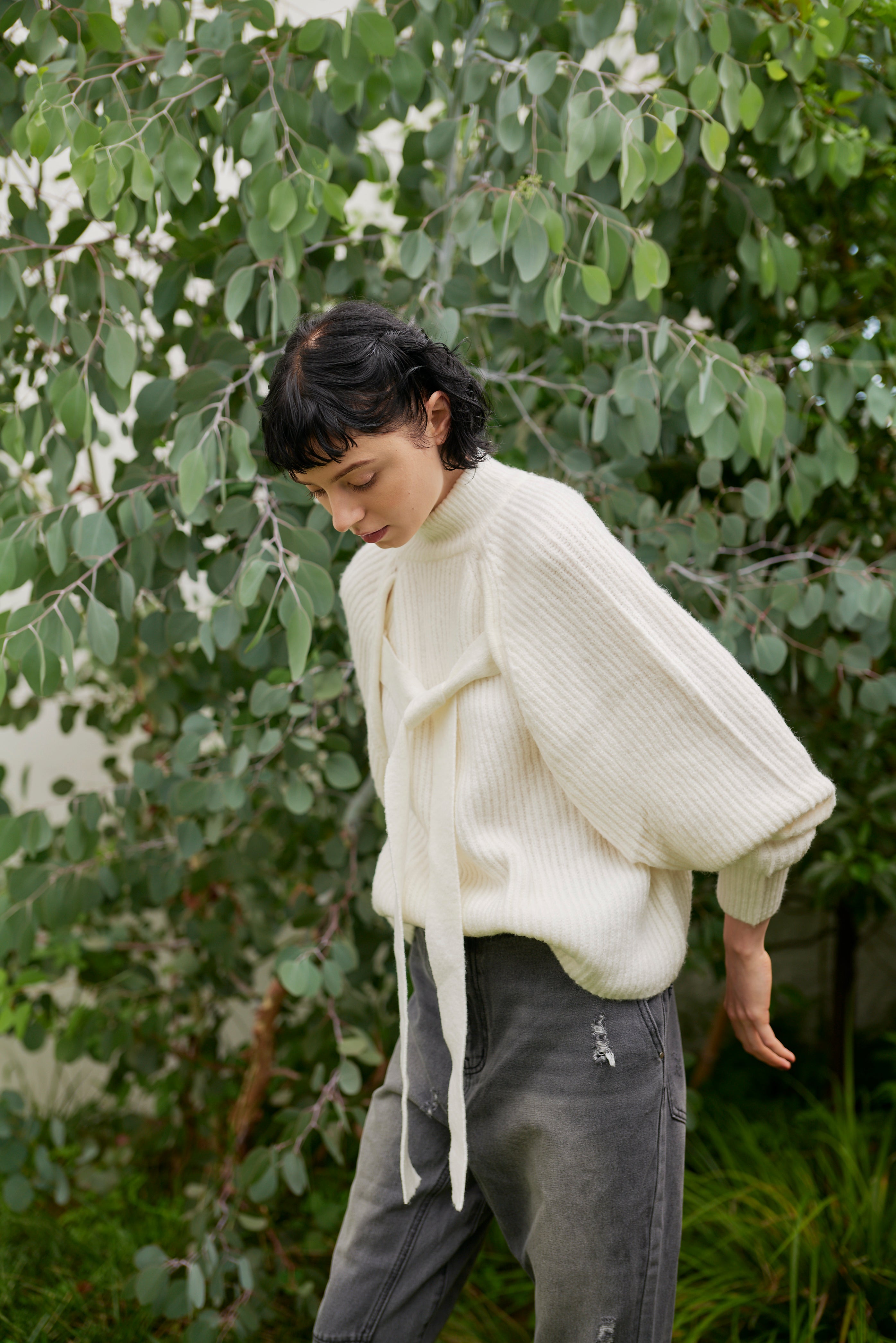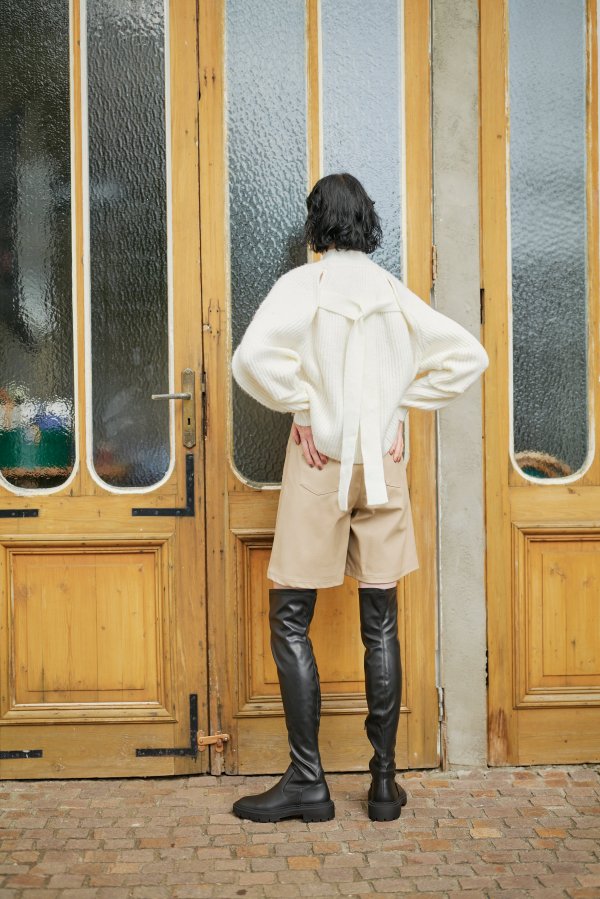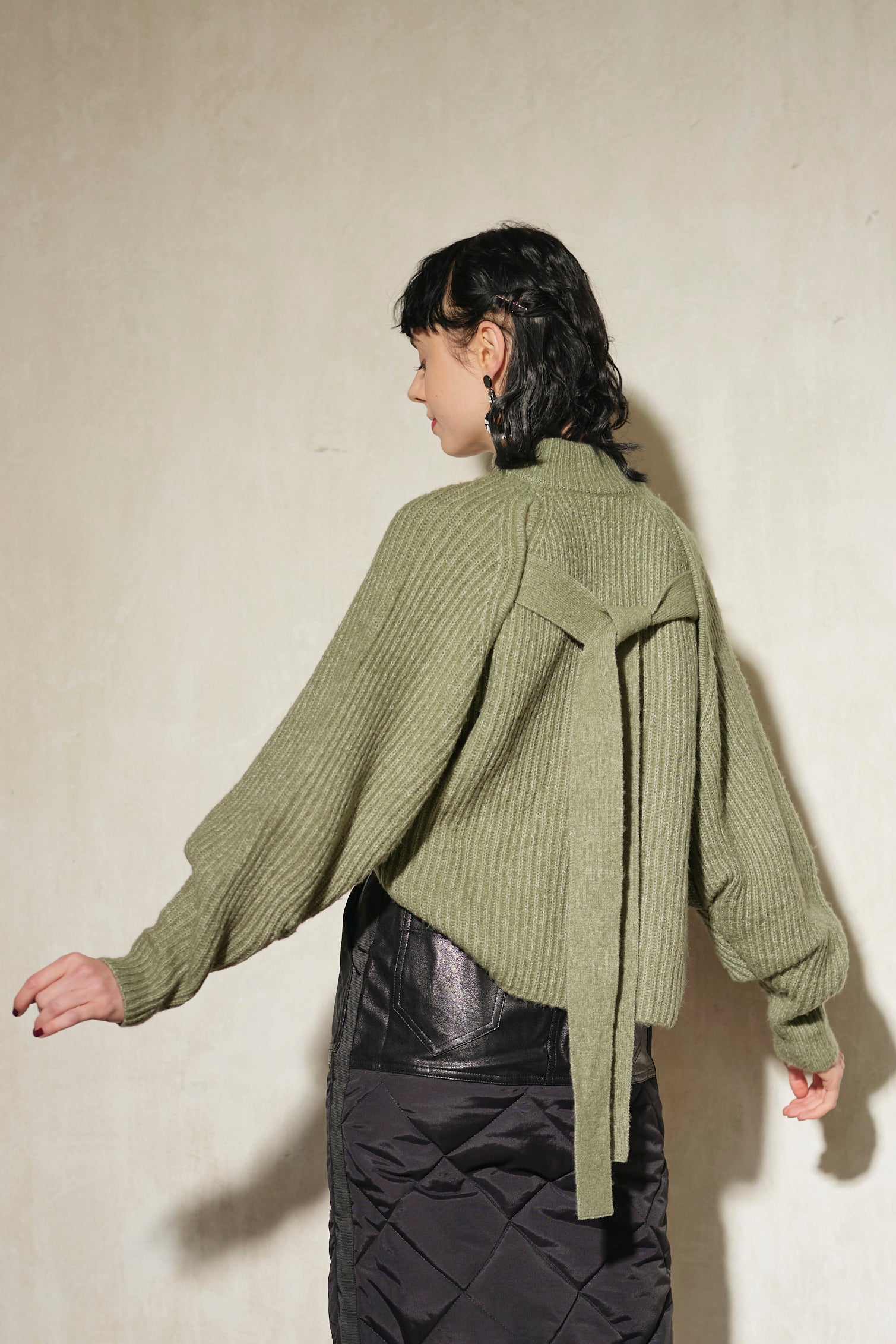 前後どちらでも着られる2way仕様のボリュームスリーブニット。